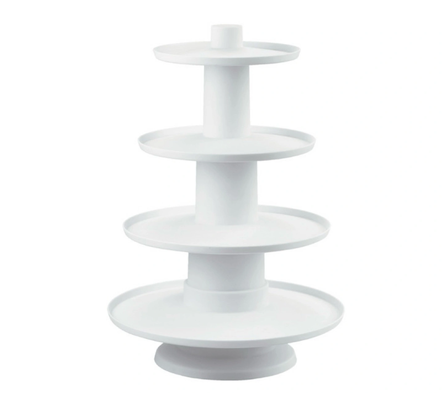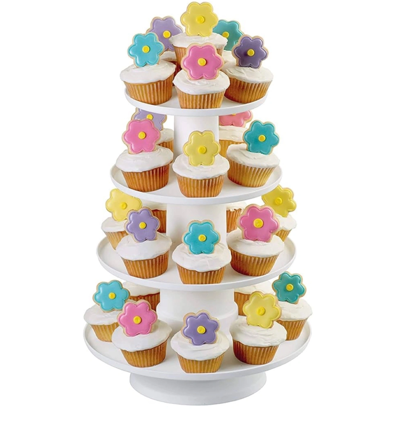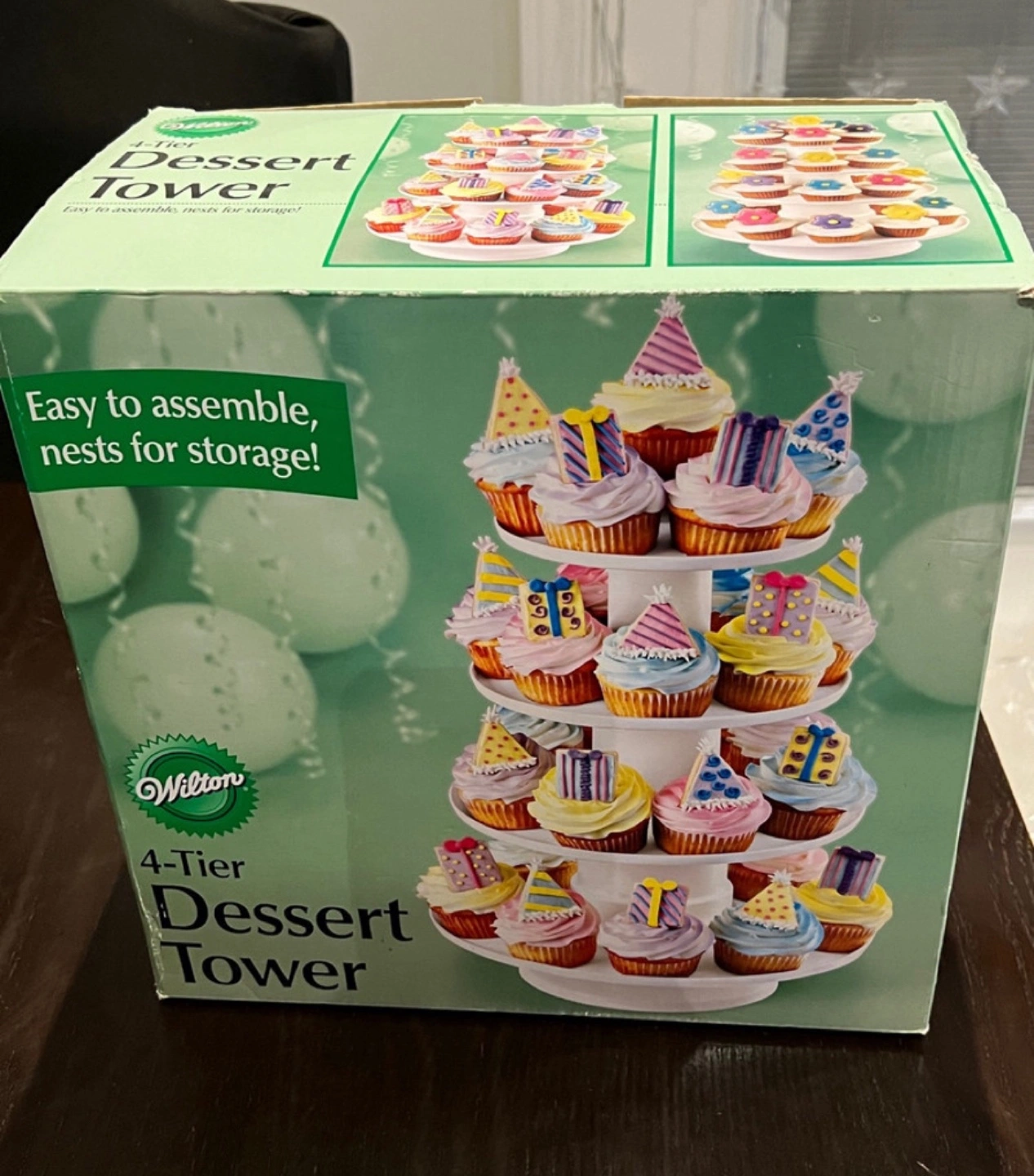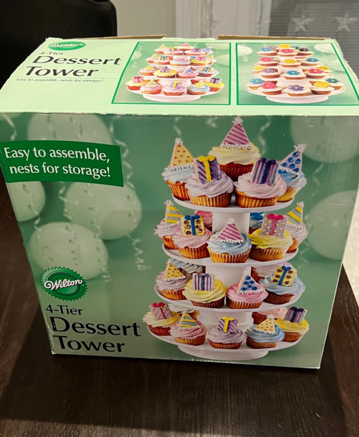 Brand new, never used Wilton 4-tier dessert tower. Easy to assemble and nests for storage. Perfect for cupcakes, desserts, or party treats. White plastic construction.