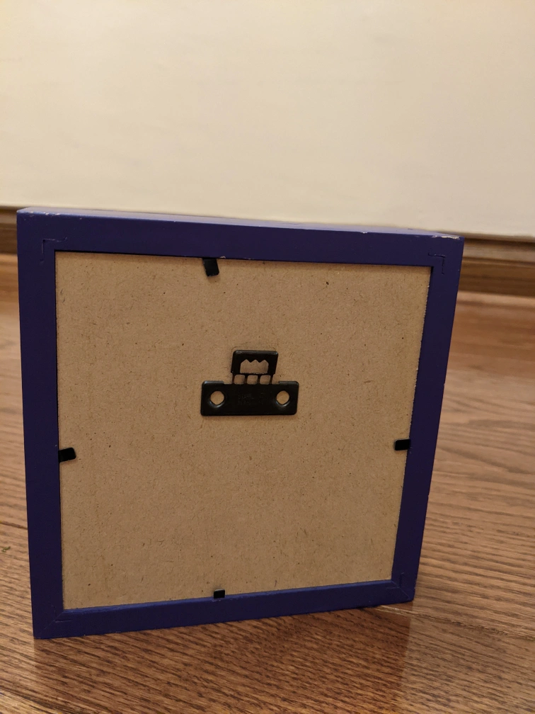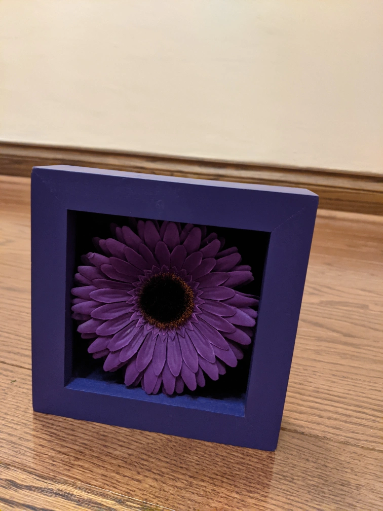 Square shadow box features a single purple artificial flower. Deep purple frame. Ready to hang.