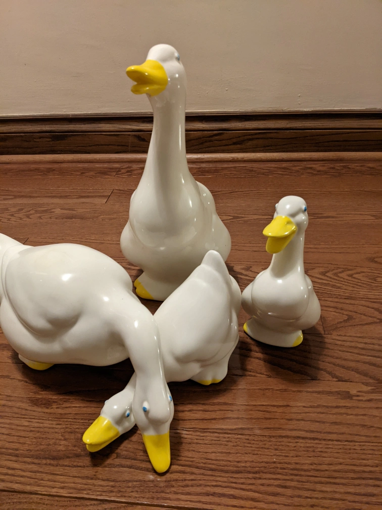 Four ceramic goose figurines. Varying sizes. White with yellow beaks and blue eyes. Collectible or decorative.