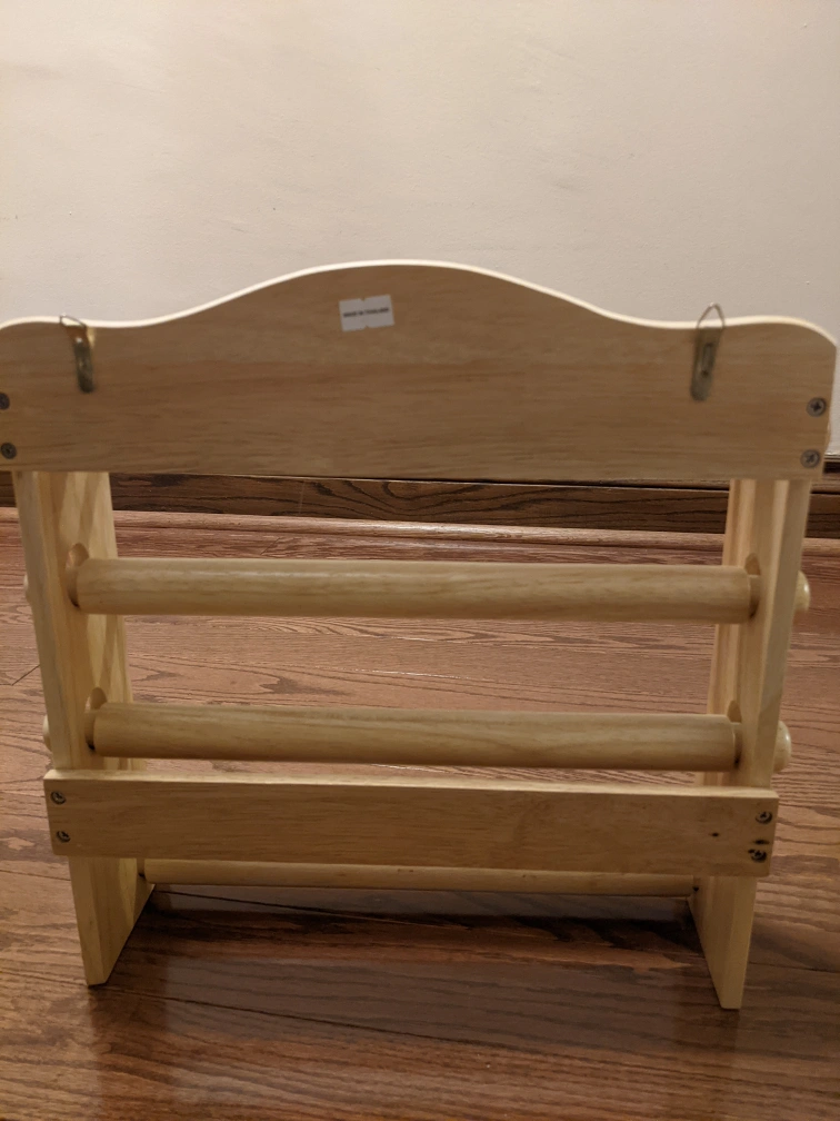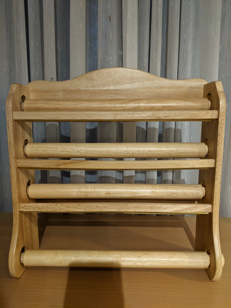 Free-standing wooden organizer. Holds three rolls of wrap or foil. Features a bottom roll for paper towels. Made of light-coloured wood. Simple design.