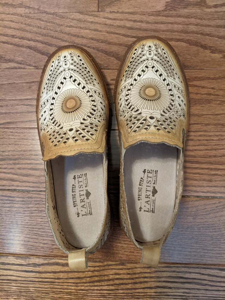 Cream coloured leather slip on shoes. Intricate cut out design. Brown soles. Size 37.