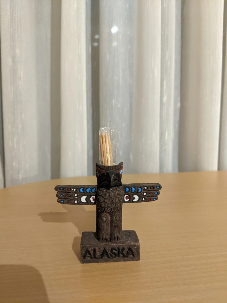 Cute little totem pole toothpick holder. Features an owl design. Made in China. Perfect for a desk or kitchen.