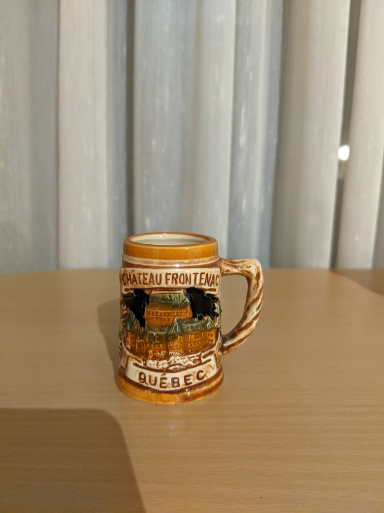 Small ceramic stein. Features ChΓ’teau Frontenac imagery. Souvenir from Quebec City. Great for collectors or adding to a collection.
