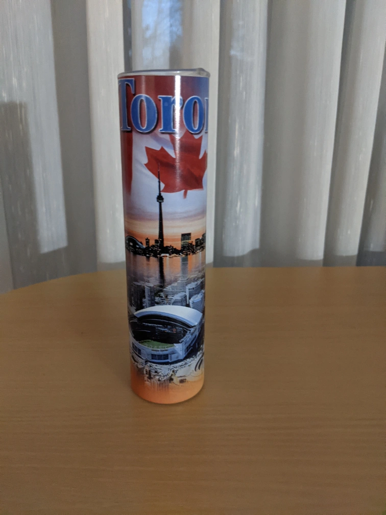 Tall cylindrical tumbler. Features images of Toronto landmarks, including the CN Tower and the Rogers Centre. Souvenir item. Lightweight.