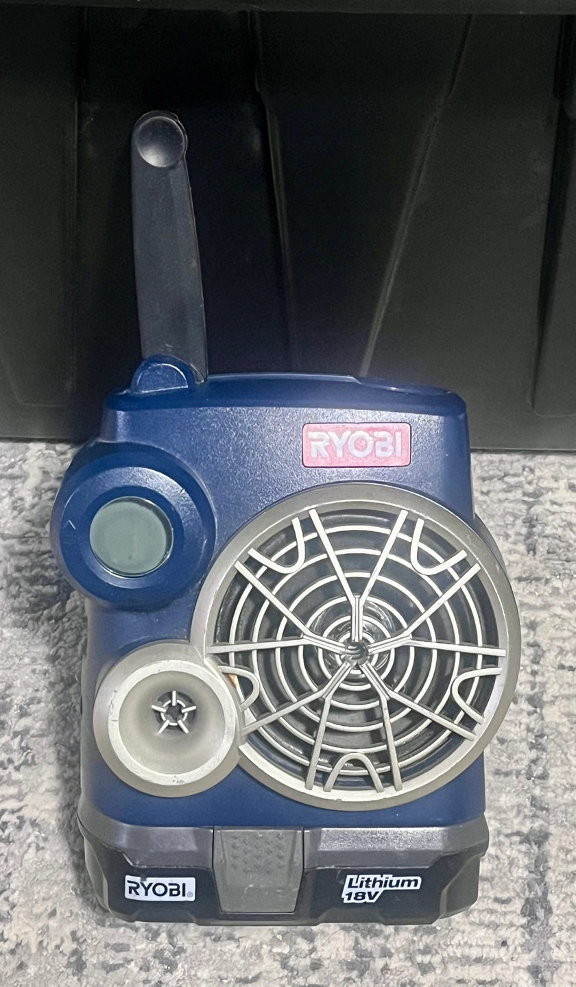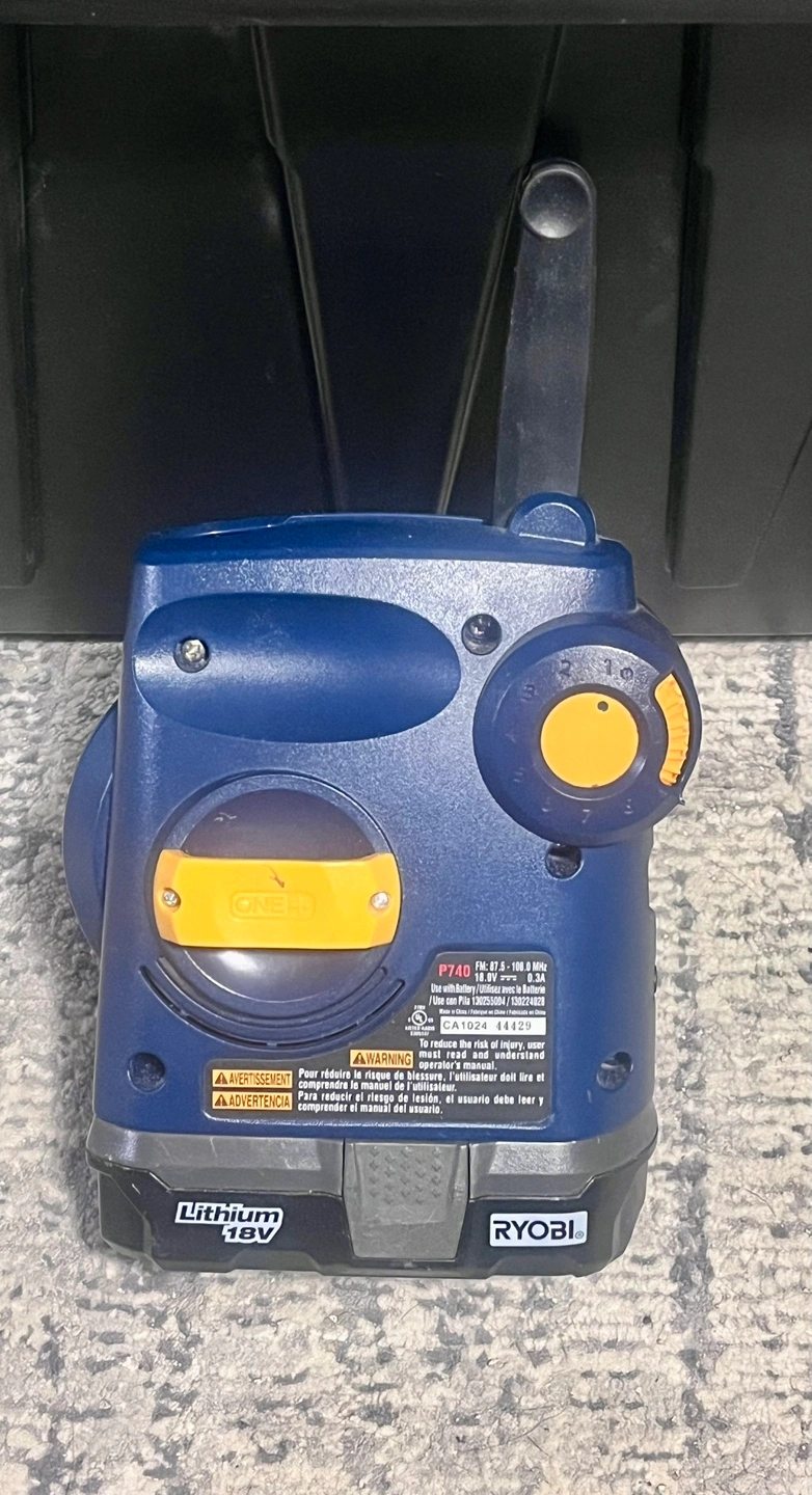 Portable radio, battery powered. Blue and grey. Ryobi branding visible. 18V lithium-ion battery.