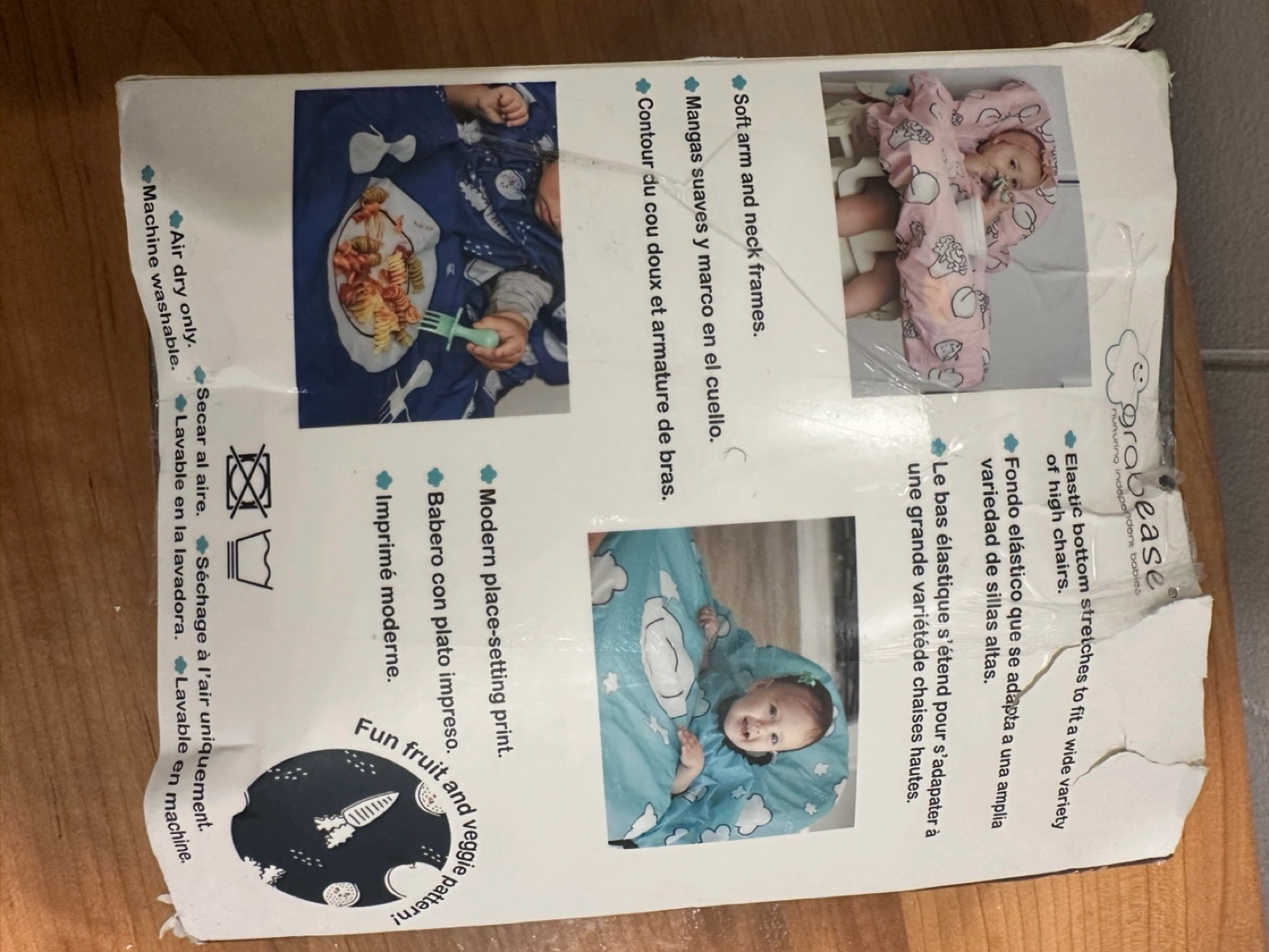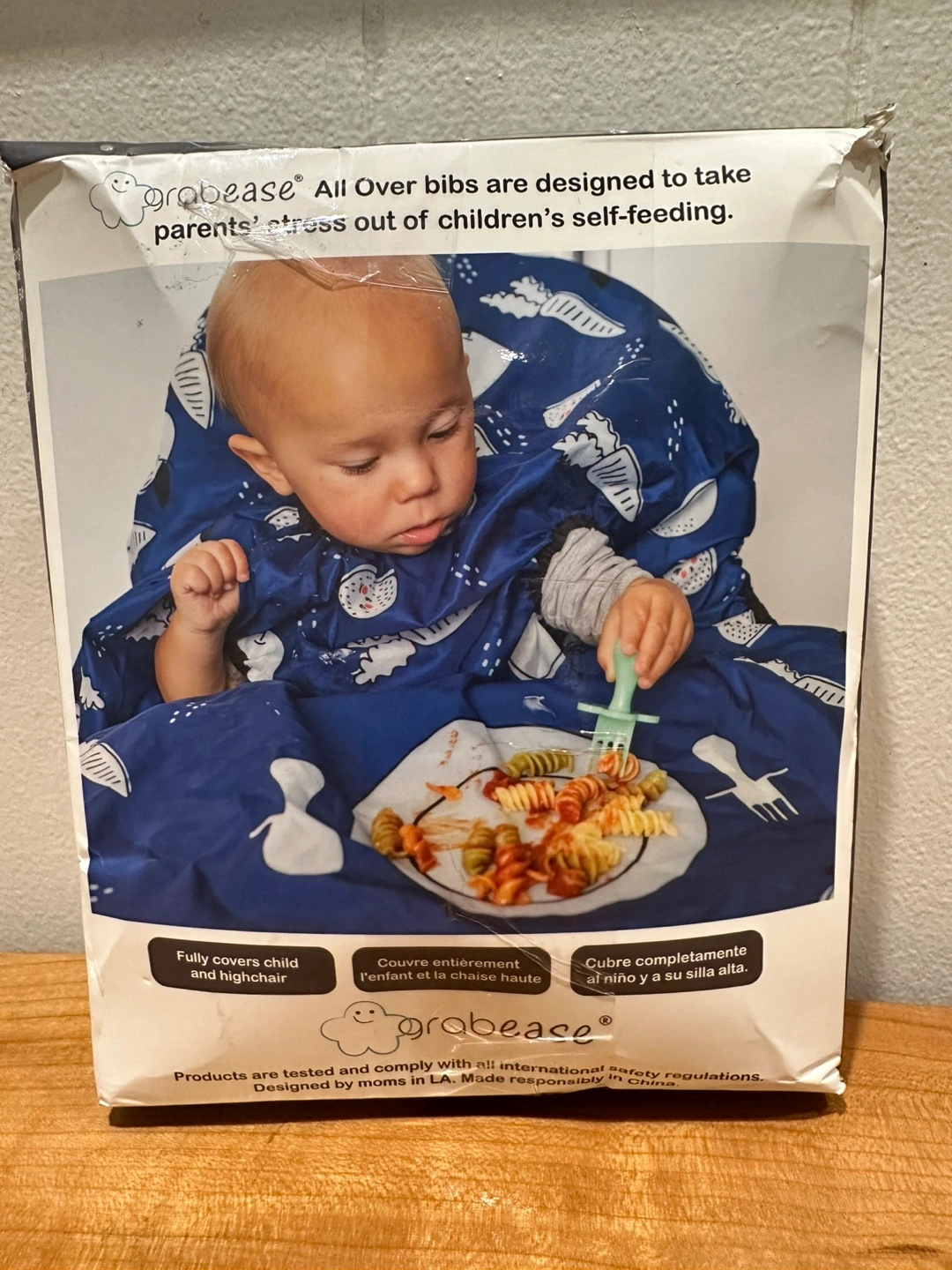 Grabease baby bib. Navy blue with bunny and carrot print. Machine washable. Covers child and highchair. Designed to reduce mess during self-feeding.