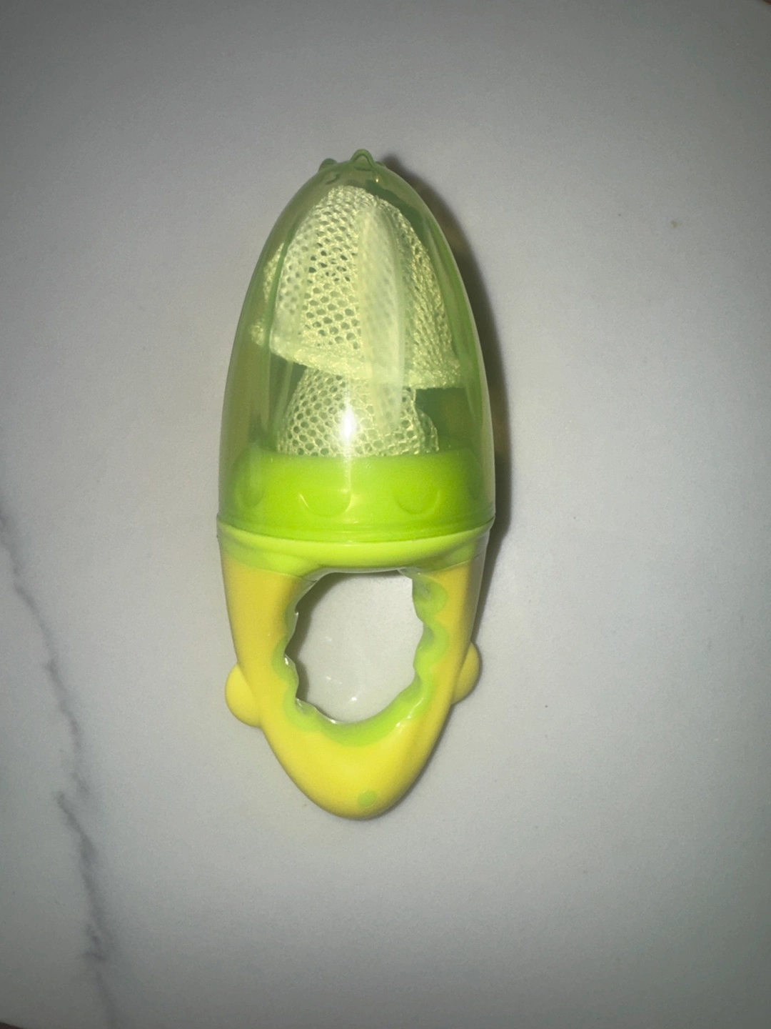 Fresh Food Feeder Green and yellow silicone baby food feeder. Features a mesh section for purees. Easy grip handle. Has two pacifiers inside