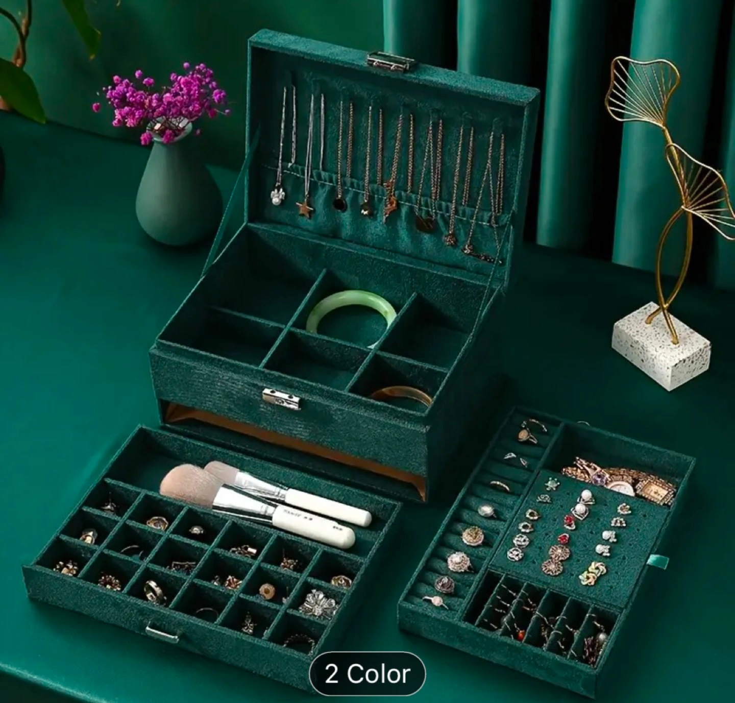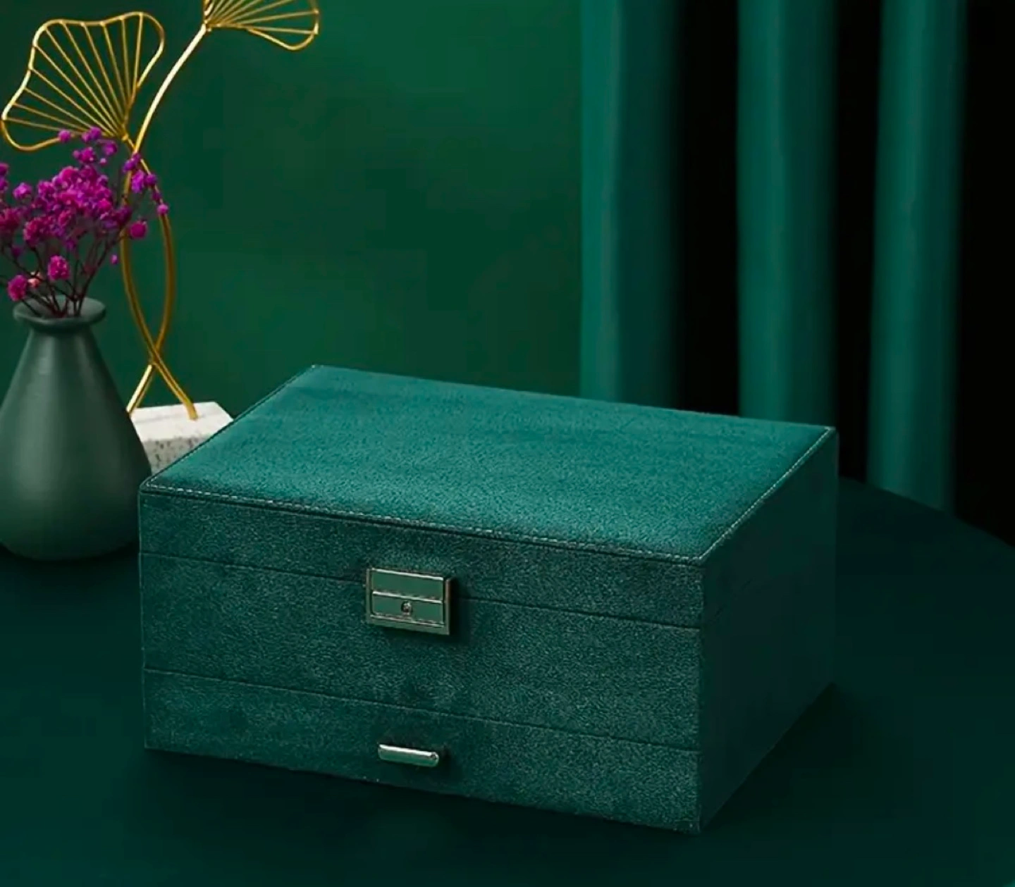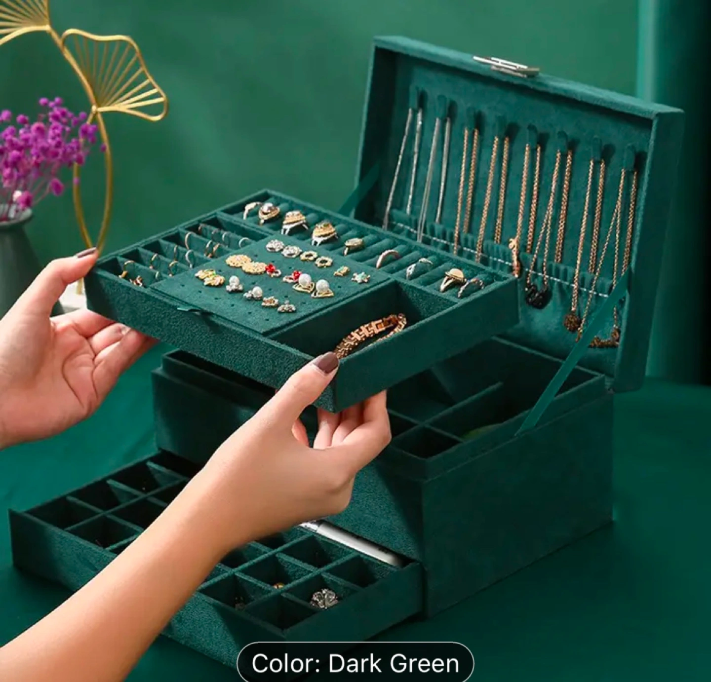 Brand new. Dark green velvet jewellery box. Three layers for storing necklaces, earrings, rings, bracelets, and more. Includes multiple compartments and slots. Features a lock and key. Perfect for organizing your jewellery collection.