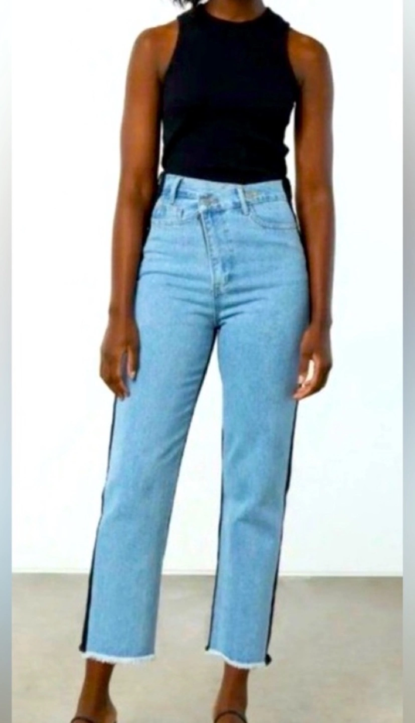 Worn 2-3. Still in excellent condition MEASUREMENT: Please refer to photos DETAILS: Relaxed fit. Straight leg. Crossover fly front. High rise waist Pick up around Yorkdale area or Scarborough Tags: casual jeans, straight leg, relaxed fit, 2 tone jeans, denim, cross over front fly, festival, summer fit, IG inspo, Y2K, blue/black jeans