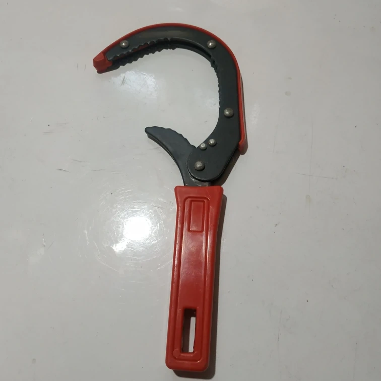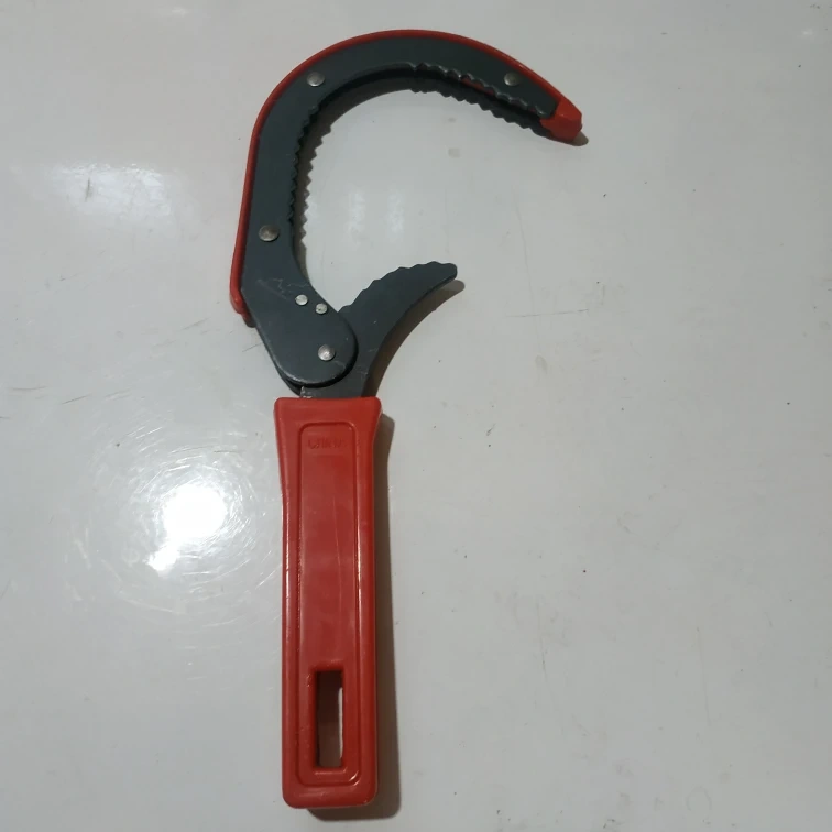 Red and black oil filter wrench. Durable plastic handle. Great for removing stubborn oil filters. New never used.