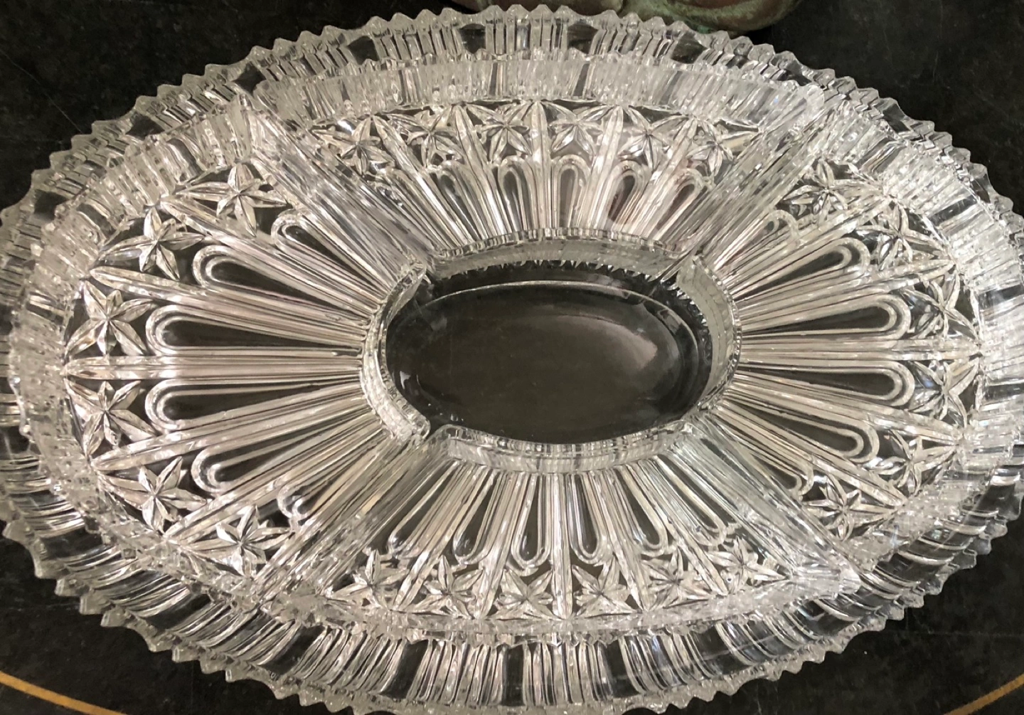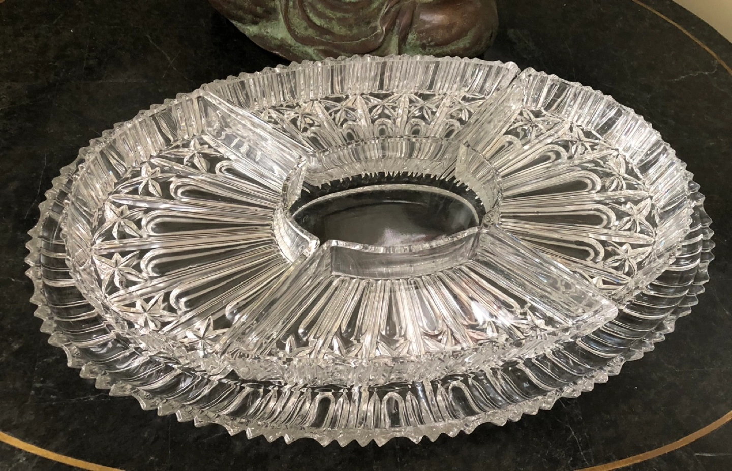 Elegant thick cut glass platter with four smaller divided sections. Intricate cut-glass design. Perfect for entertaining/bar or for a more unconventional use like jewelry. Would look stunning on a dresser. Vintage piece. Excellent condition. Yonge/Davisville pick up.