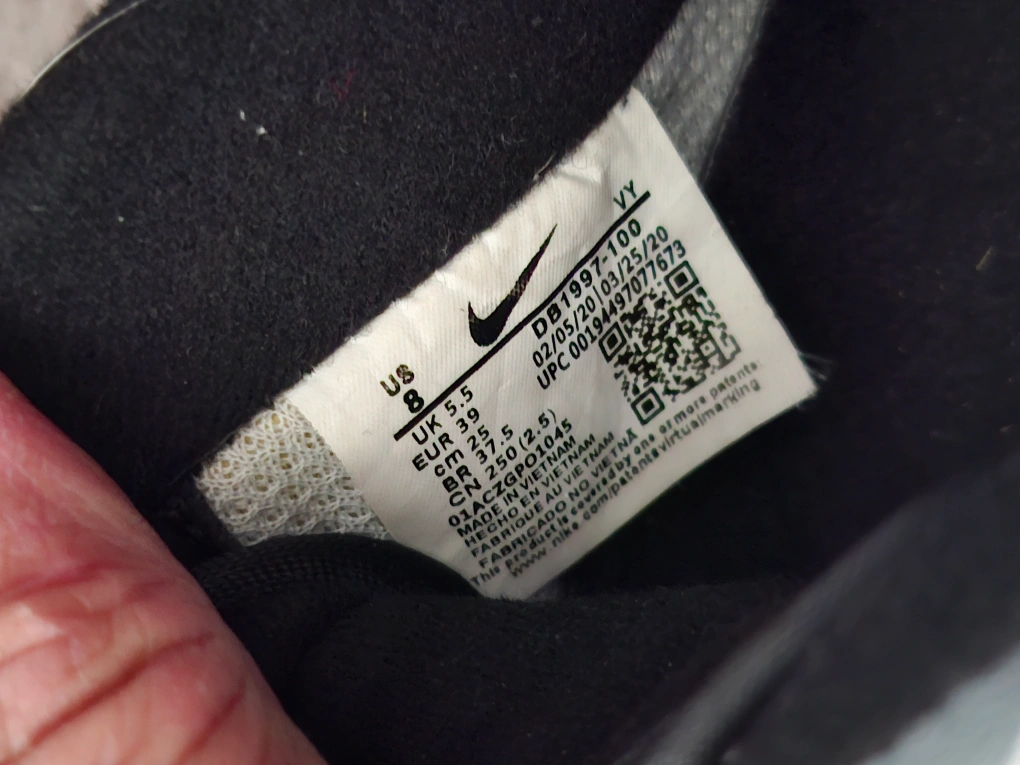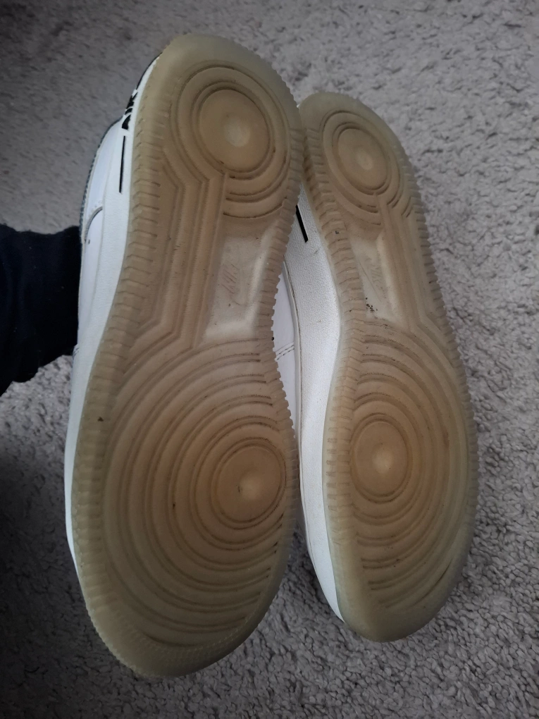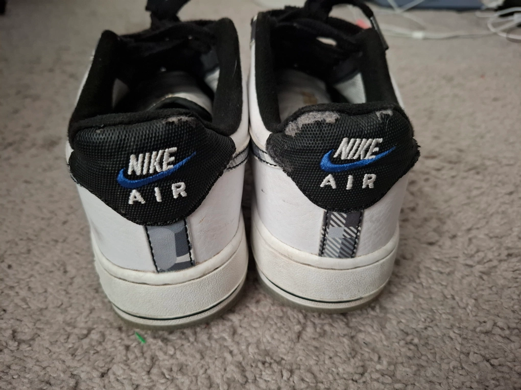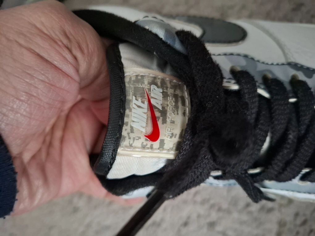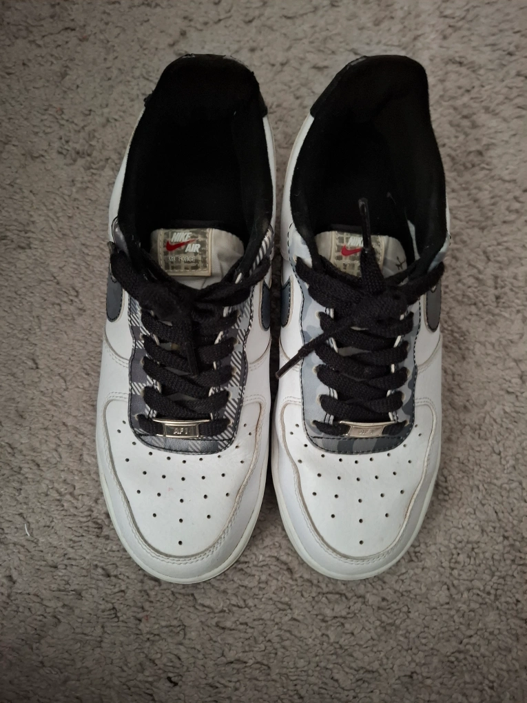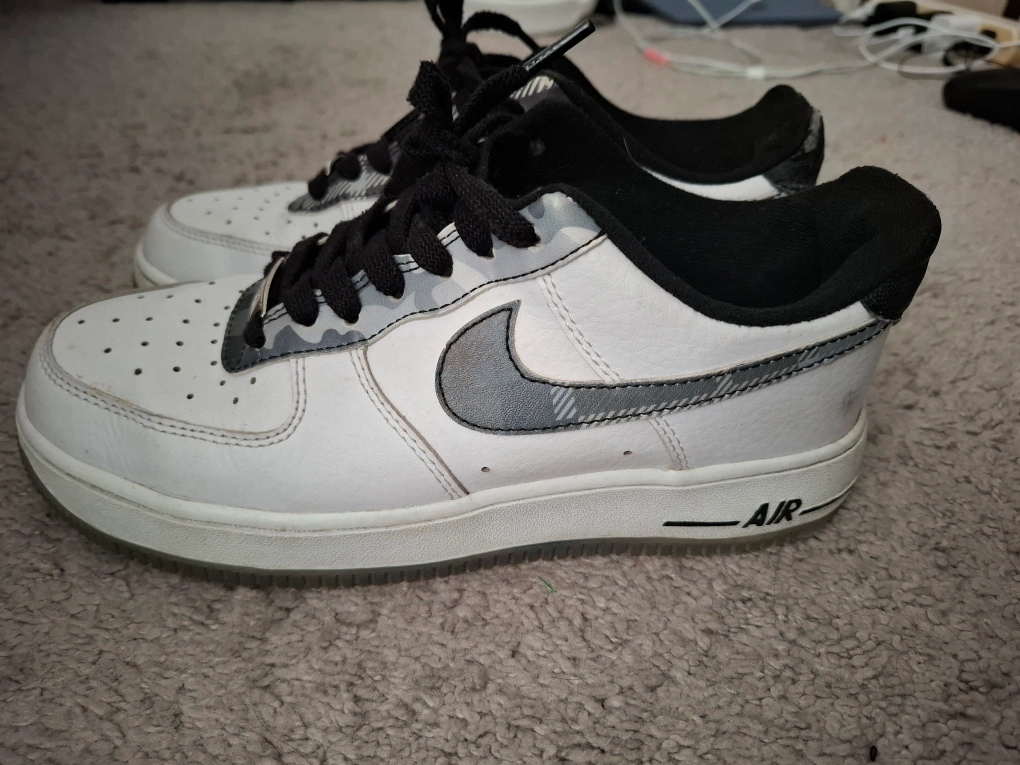 Pre-owned Nike Air Force 1 Low sneakers. White leather upper with grey and black camouflage accents. Black laces. Size US 8. Some wear and tear.
