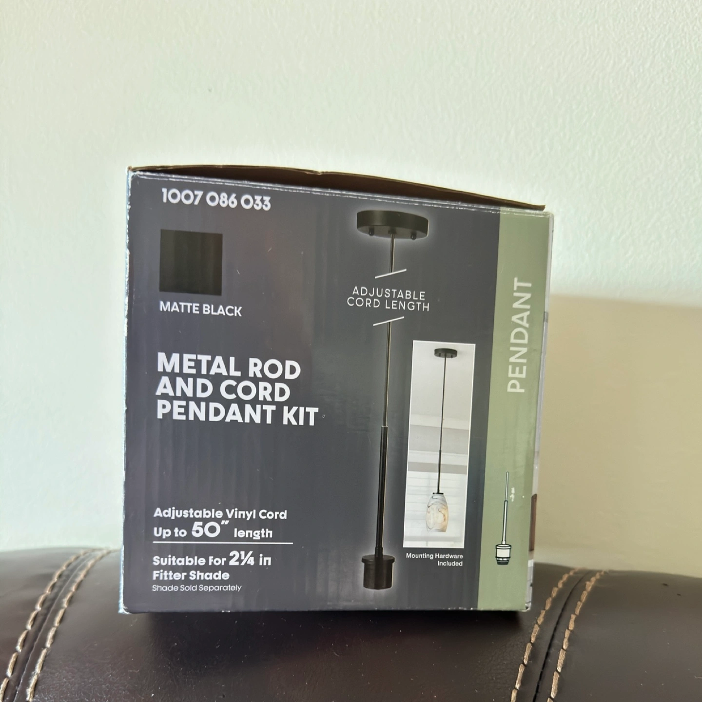 New in box, matte black pendant light kit. Adjustable vinyl cord up to 50 inches. Suitable for 2 1/4 inch fitter shade. Mounting hardware included. Shade sold separately. Home Depot brand. 3 pieces are available. Price is $ 10 each Only available for pick up