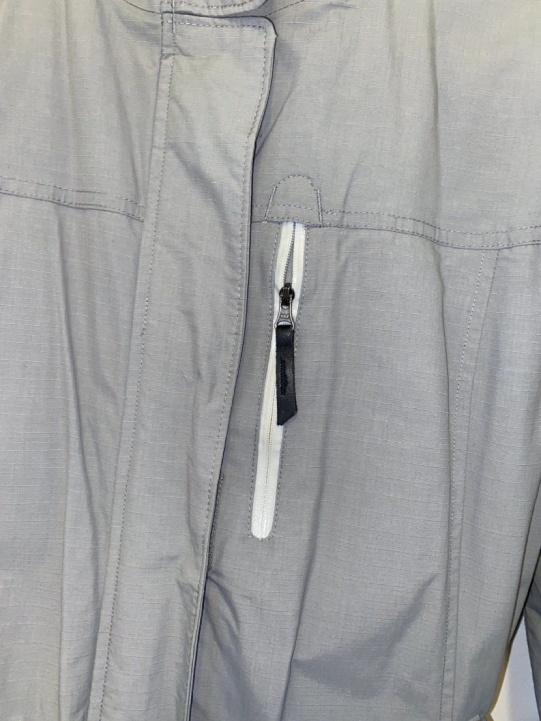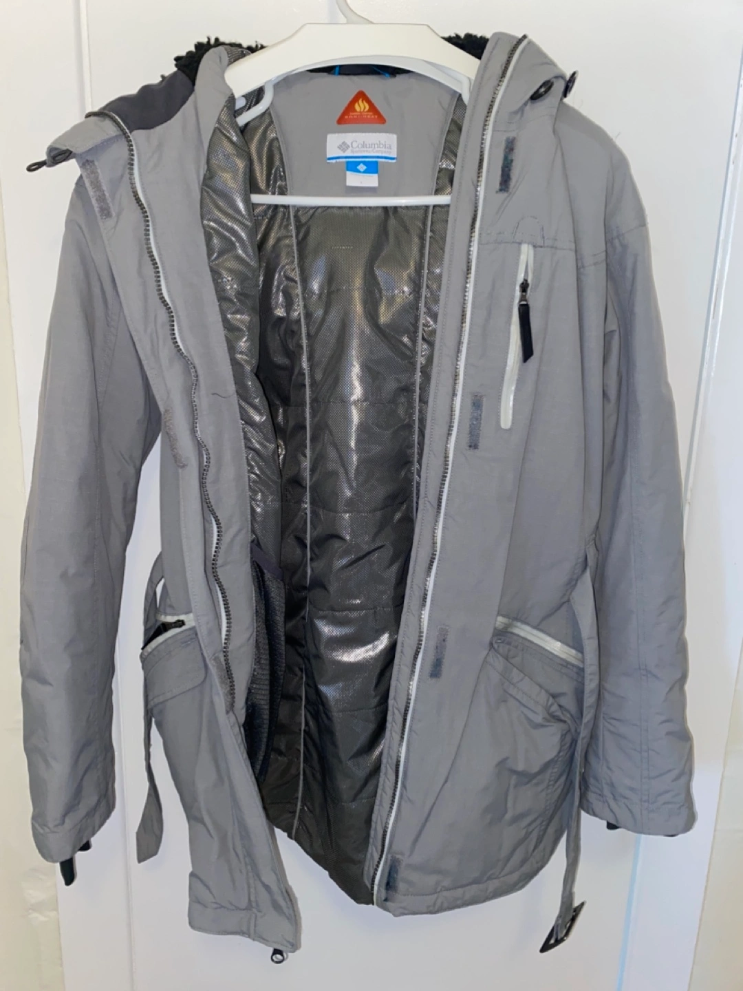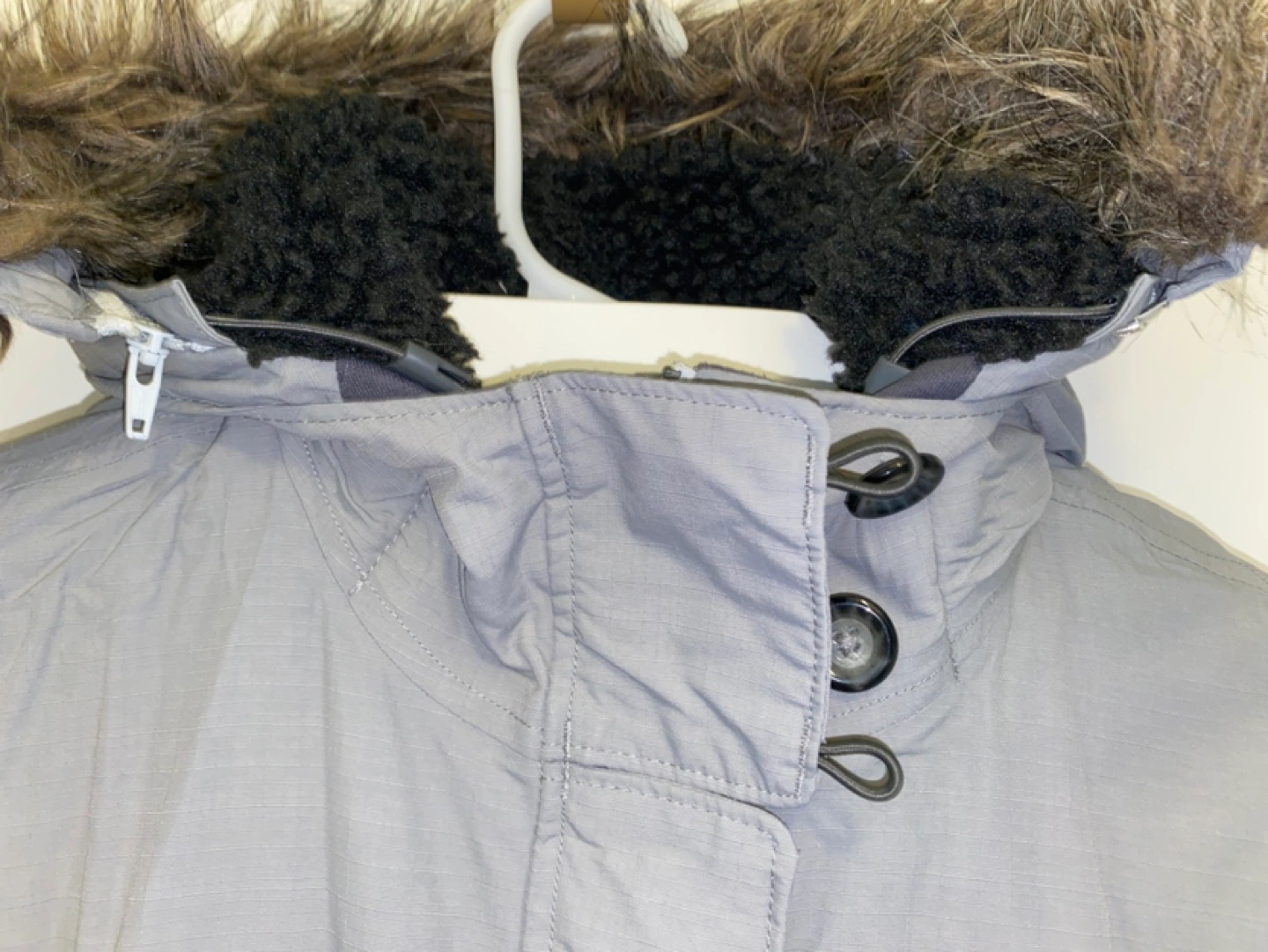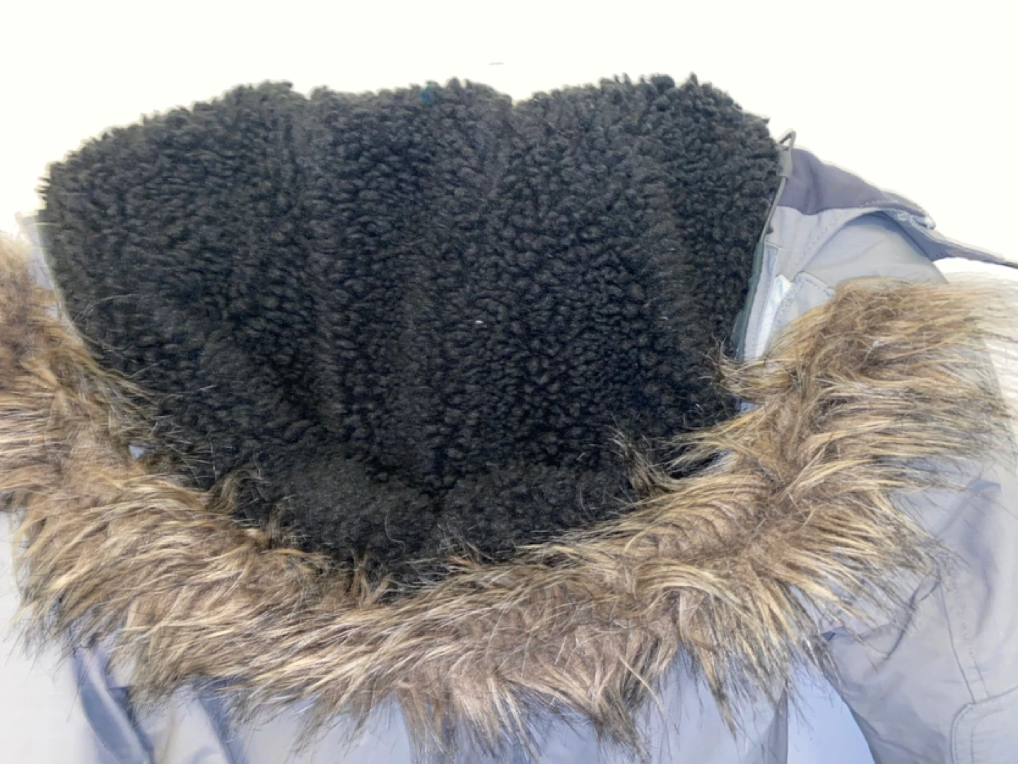Long grey winter coat. Features a faux fur-trimmed hood, fleece lining, and a detachable belt. Zipper and snap closure. Multiple pockets.