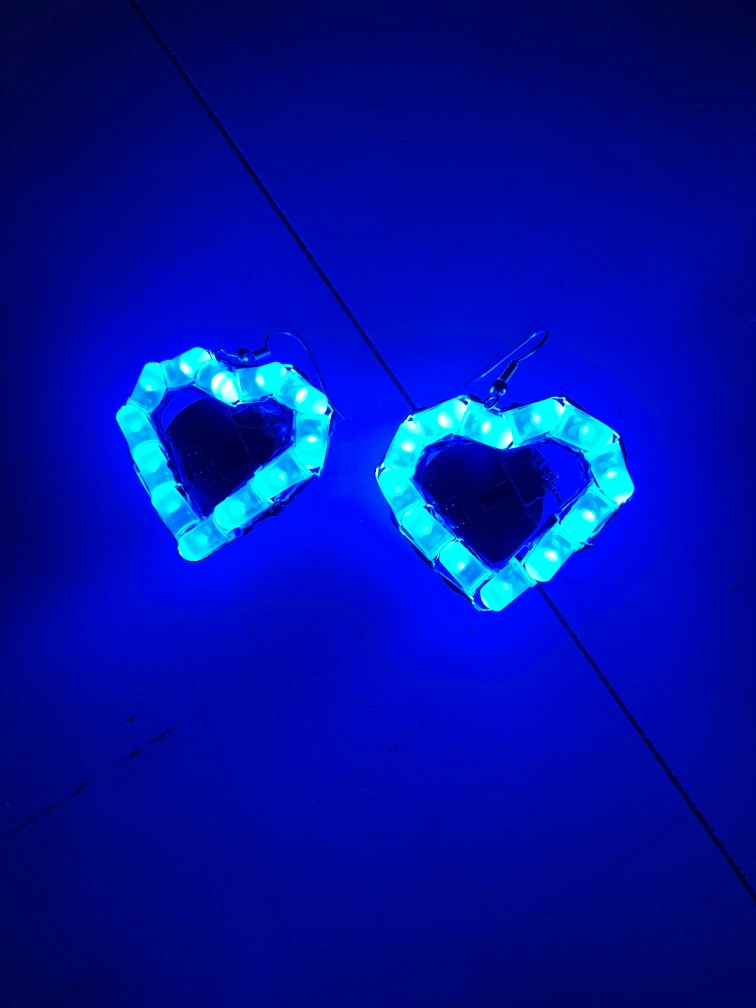 Pair of LED heart-shaped earrings. Blue light. Fun and unique.