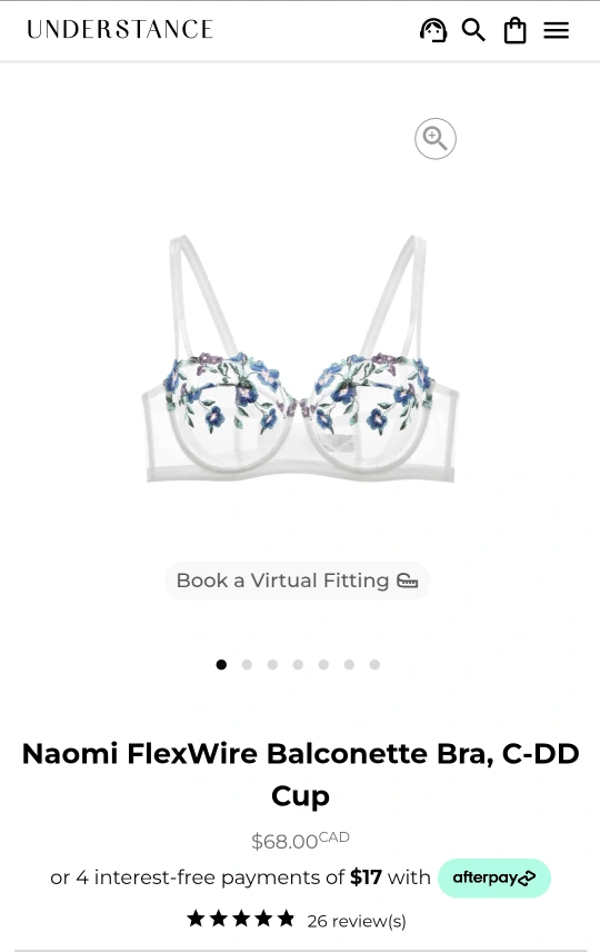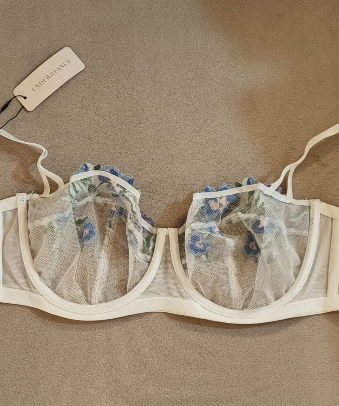 Naomi is a beautiful, made-to-be-seen balconette underwire bra. It provides side support (push wide-set breasts toward the middle), with split straps designed to hide side boobs. Features our signature FlexWire, a bendy underwire that follows your natural shape Fine mesh lining under the embroidery prevents chafing High-stretch wings and side boning provide side support Fabric composition: Embroidery: 100% polyester, Cup Lining: 100% polyester, Wings: 70% polyamide, 30% spandex Unworn. Retails for $68 before shipping and tax.