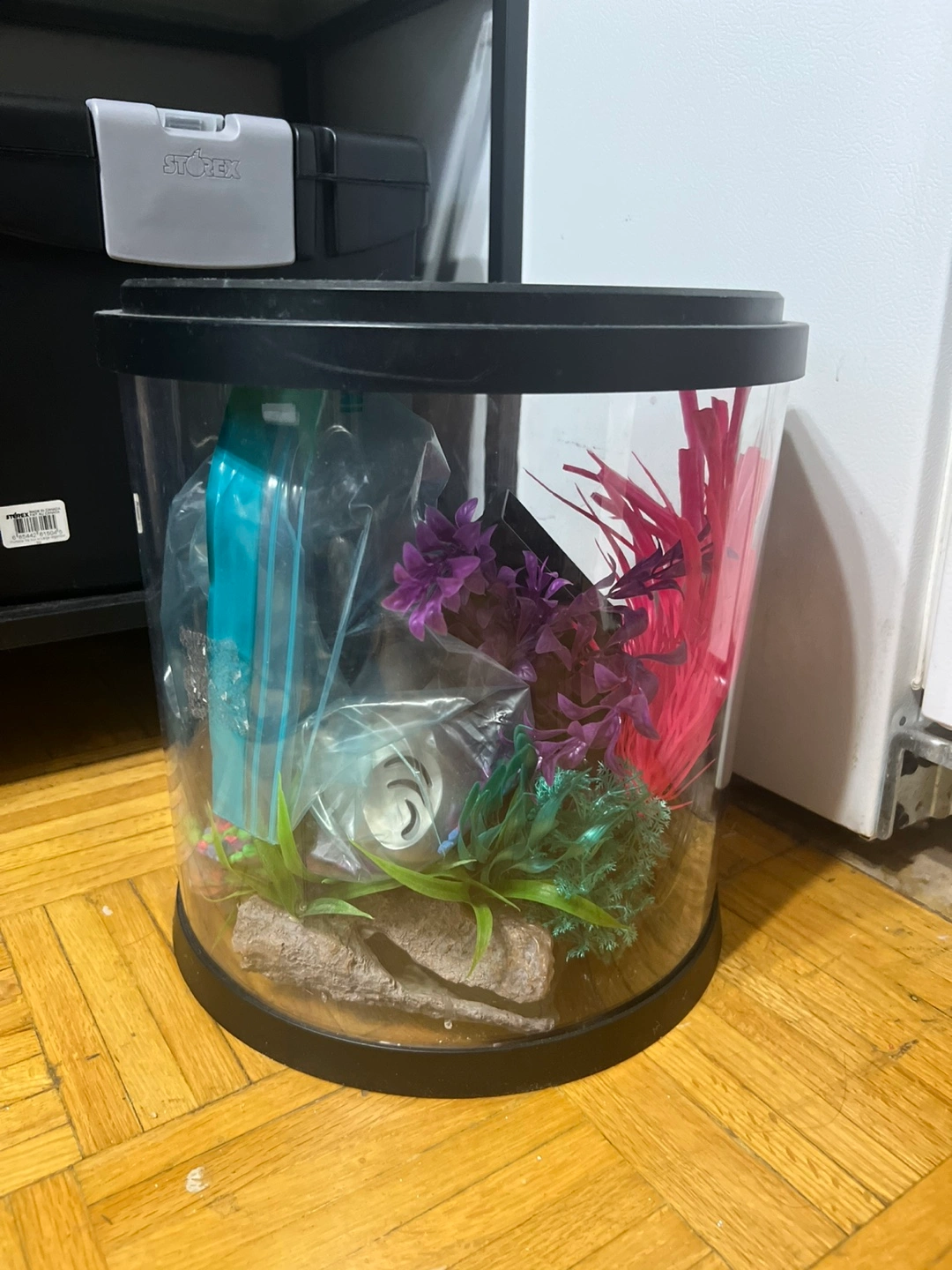 Clear acrylic tank. Black plastic rim. Includes artificial plants and a small rock decoration. Good for small fish or invertebrates. Pick up only Located near Mt. Pleasant and Eglinton Ave East