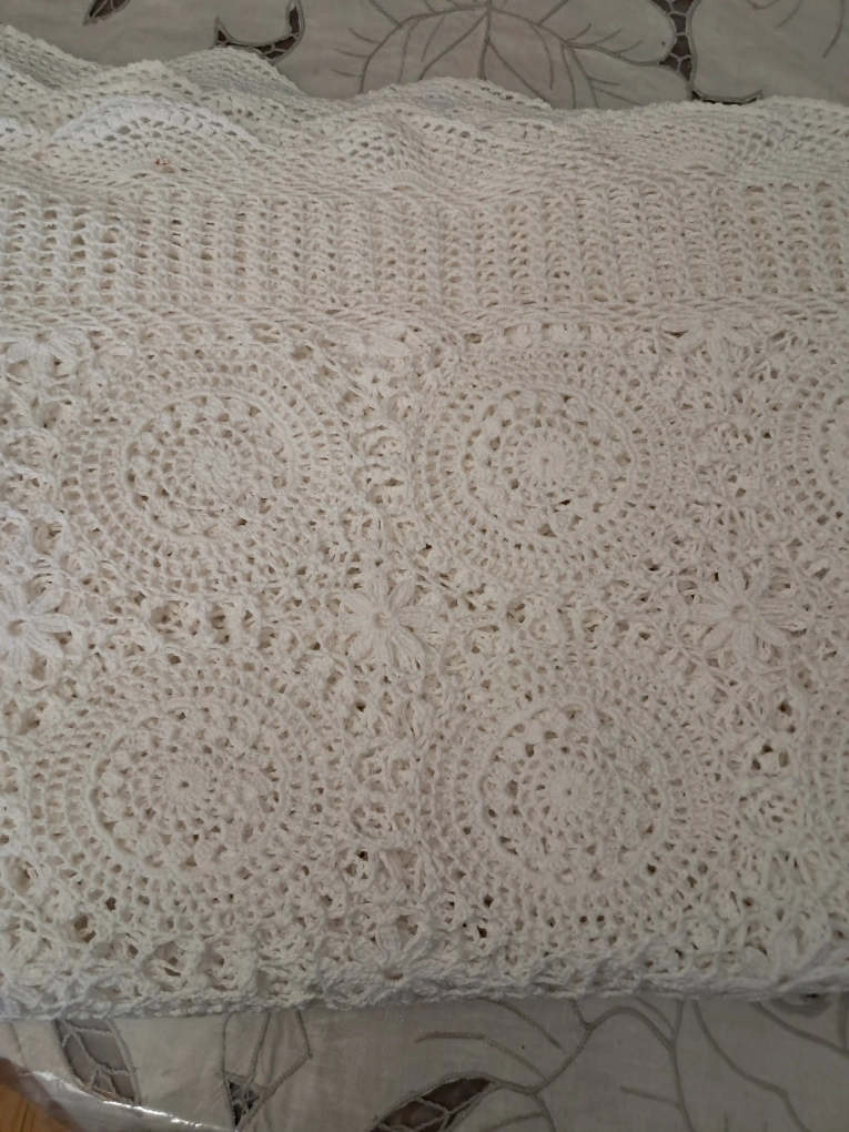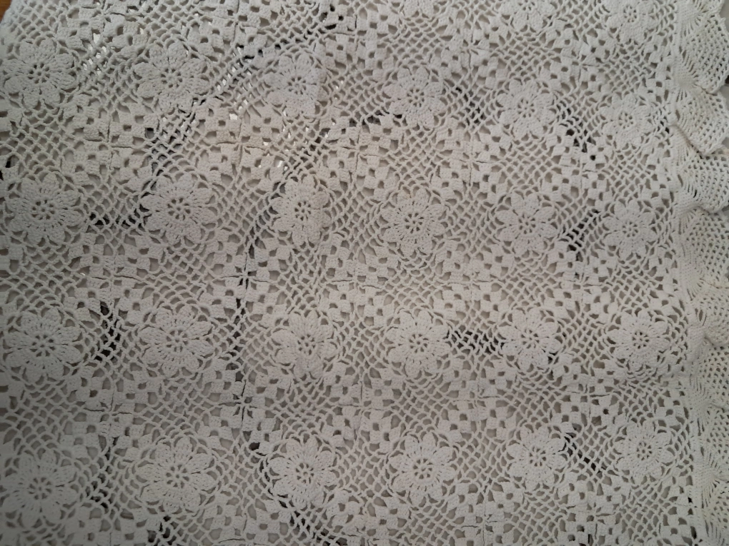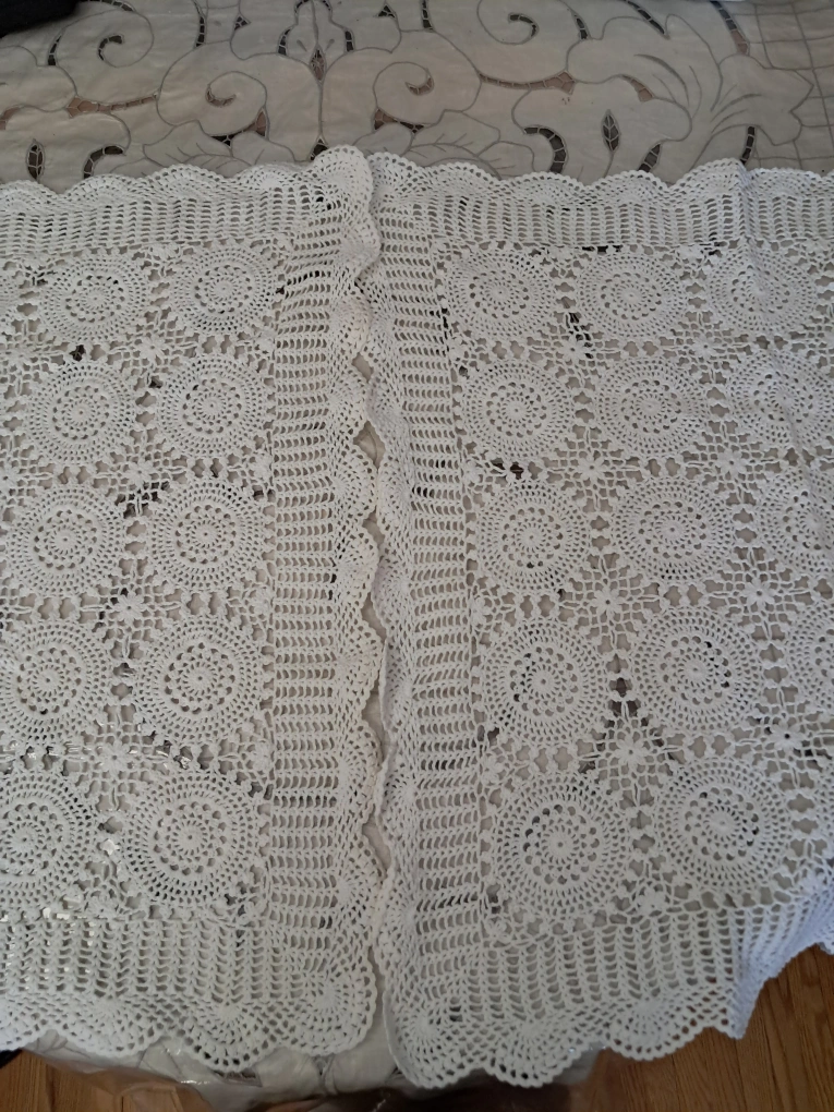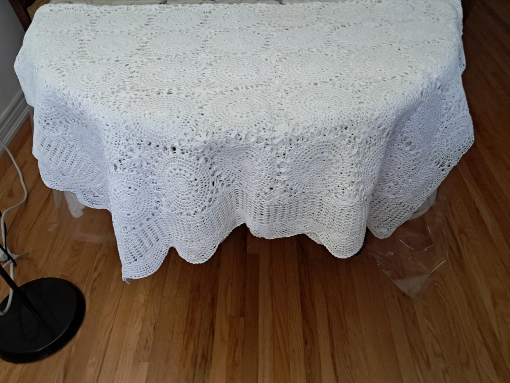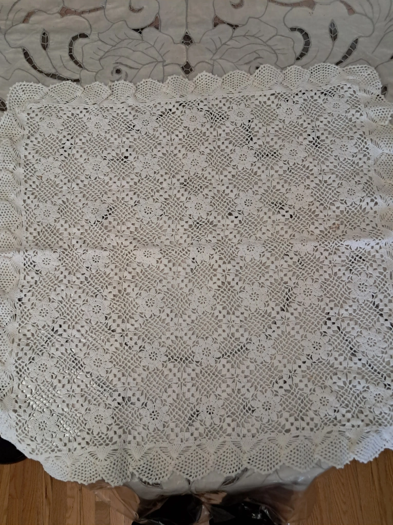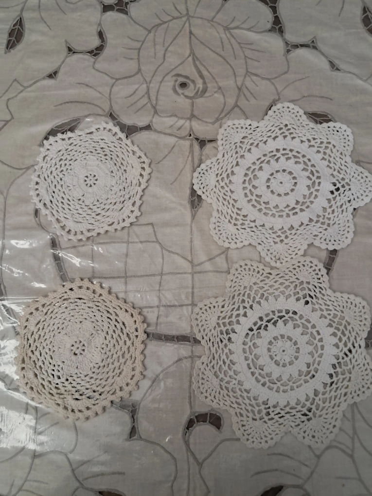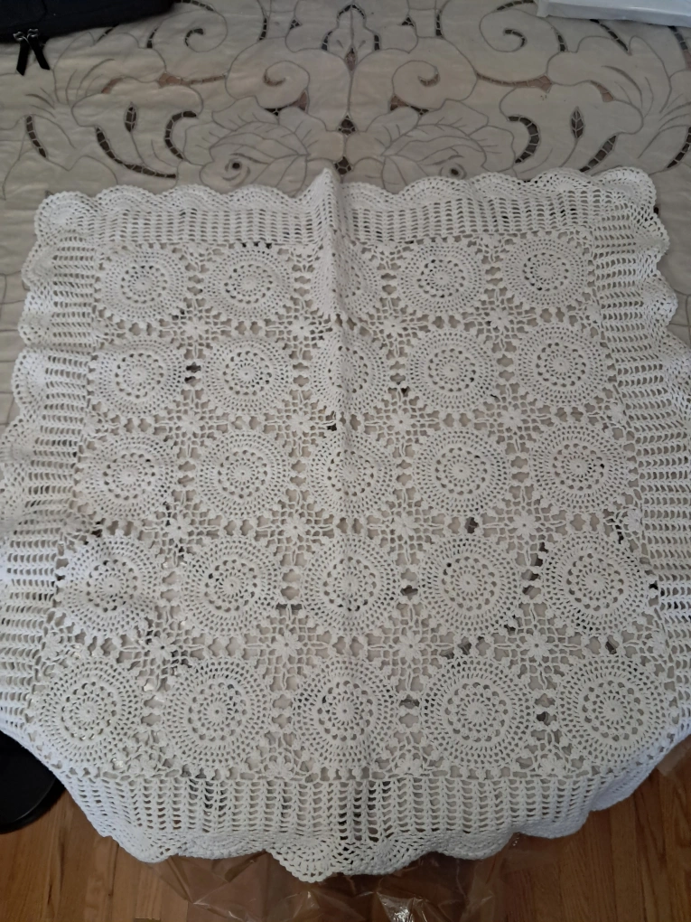 1 x Beautiful rectangular crochet table cloth. (60" x 96") 2 x Square ones (26 " x 26") 2 x Square ones (24" x 24") 1 x Square one (14" x 14") 2 x round ones (7" in diameter) 2 x round ones (5" in diameter) 10 pieces altogether