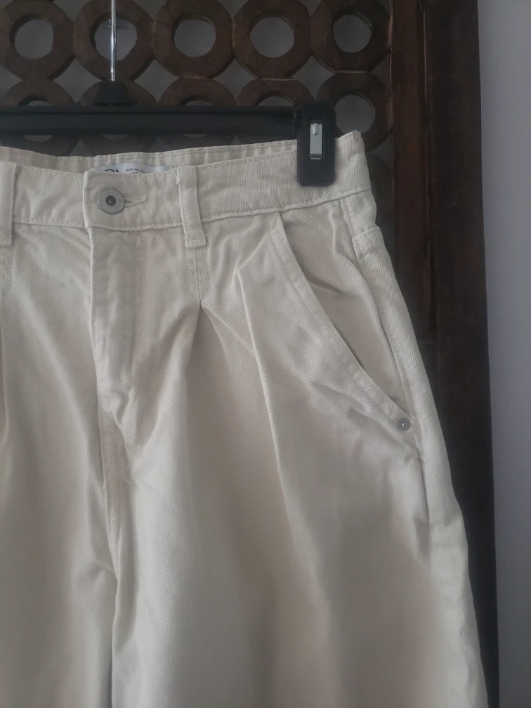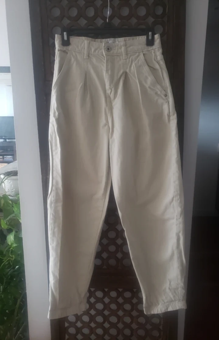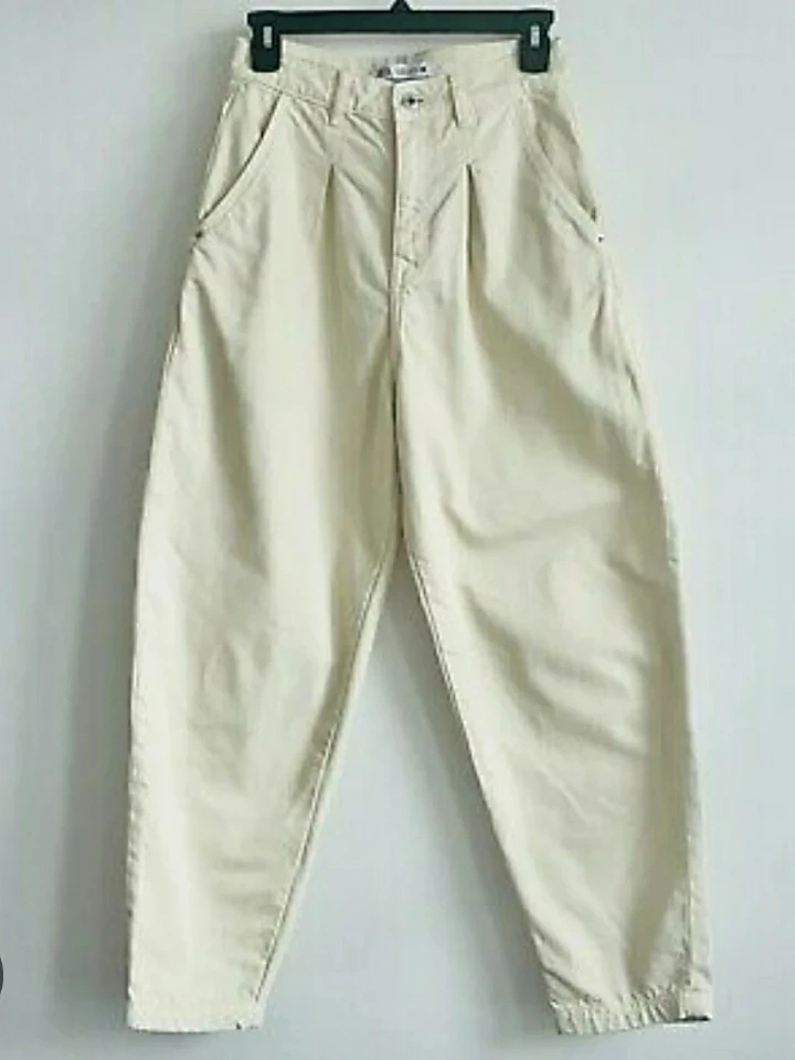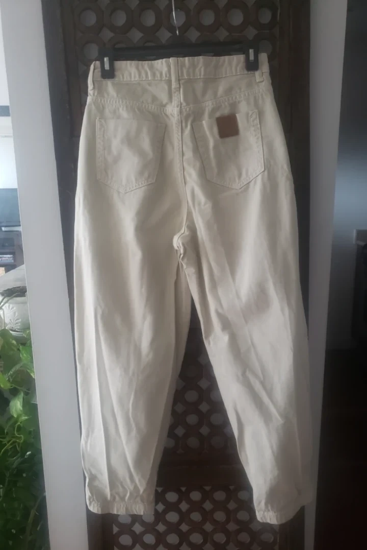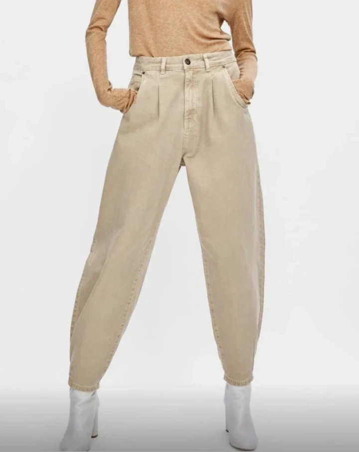 Ivory high-waisted jeans. Pleat front. Slouchy, balloon fit. Made in Bangladesh.