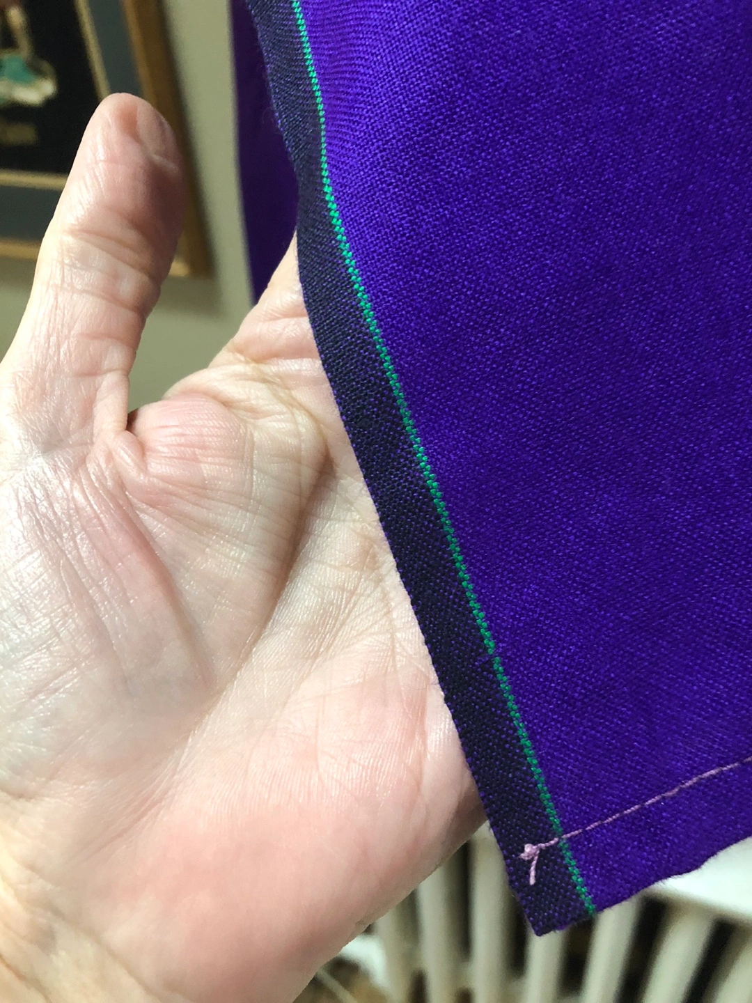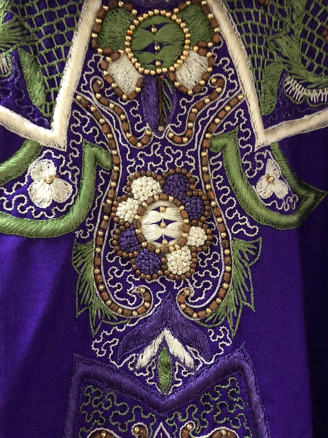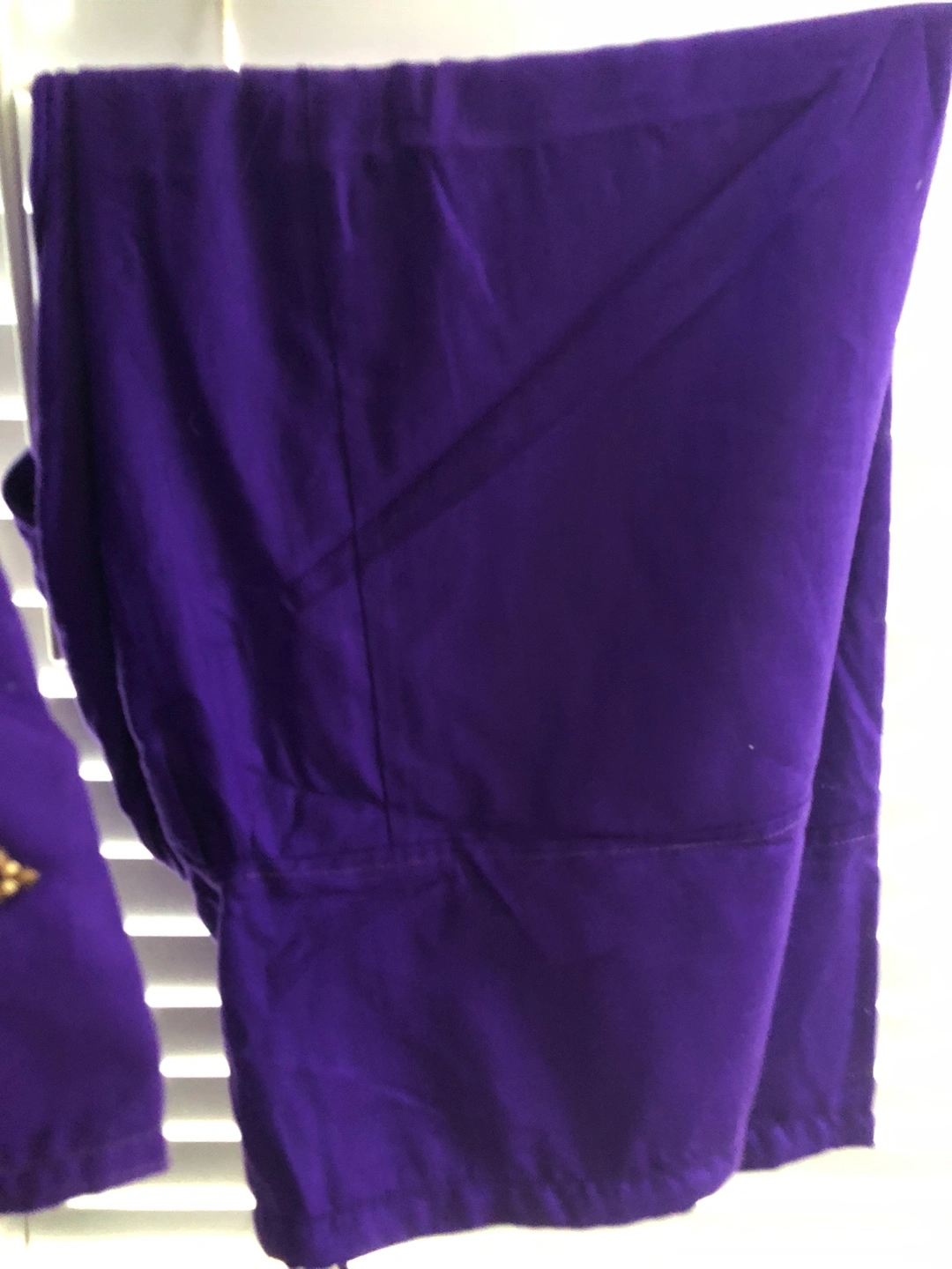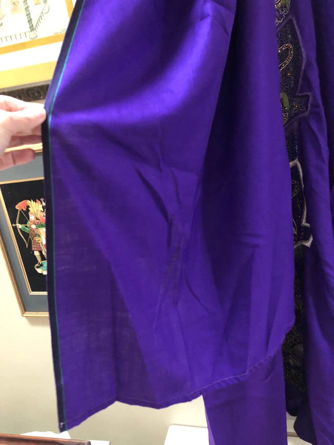 Pretty purple three-piece outfit. Not exactly sure what the proper name is. Intricate embroidery and beading detail. Long sleeves. Includes matching pants and scarf. Pants have a draw string. Small tear underarm on sleeve. Looks like it would be easily fixed - shown in pictures. Size XL. Yonge/Davisville pick-up.