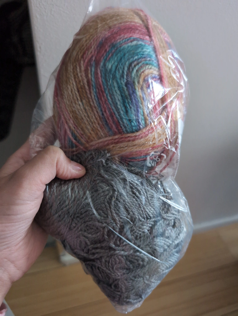 Two balls of yarn. One multicolored ball with pinks, blues, and tans. One gray ball of yarn. Both in plastic bags. bought in Morocco!