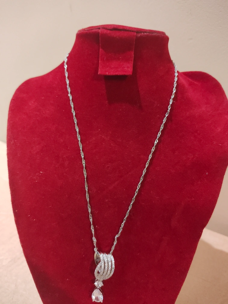 Beautiful silver tone necklace and earrings set. Features a delicate twisted chain necklace with a stunning pendant and matching drop earrings. Cubic zirconia stones add sparkle. Perfect for a special occasion.