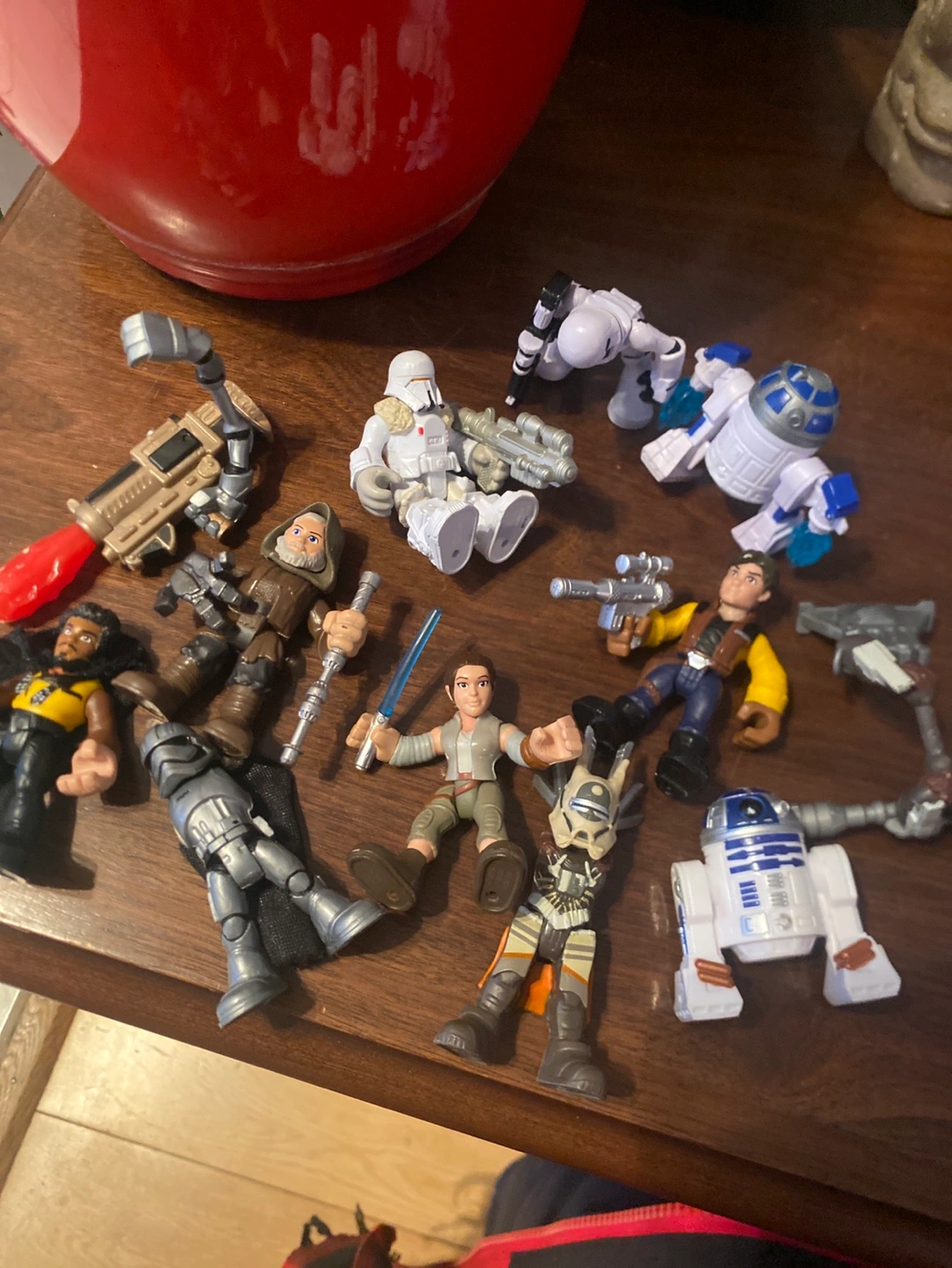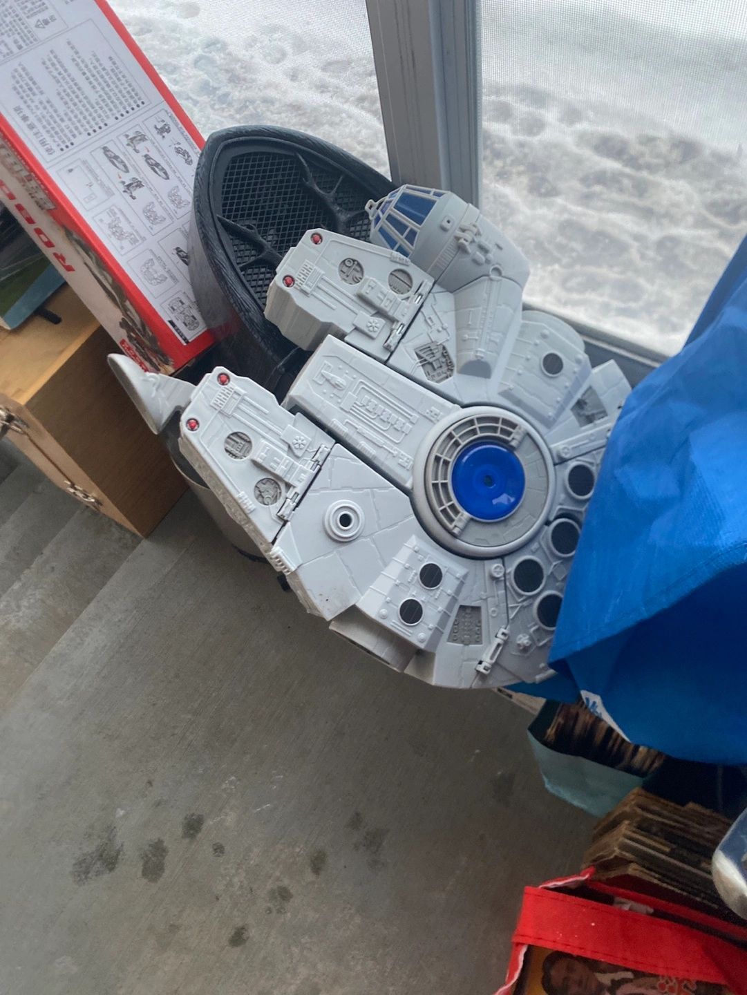Large Millennium Falcon playset, partially assembled. Includes various Star Wars figures and accessories. Great for imaginative play.