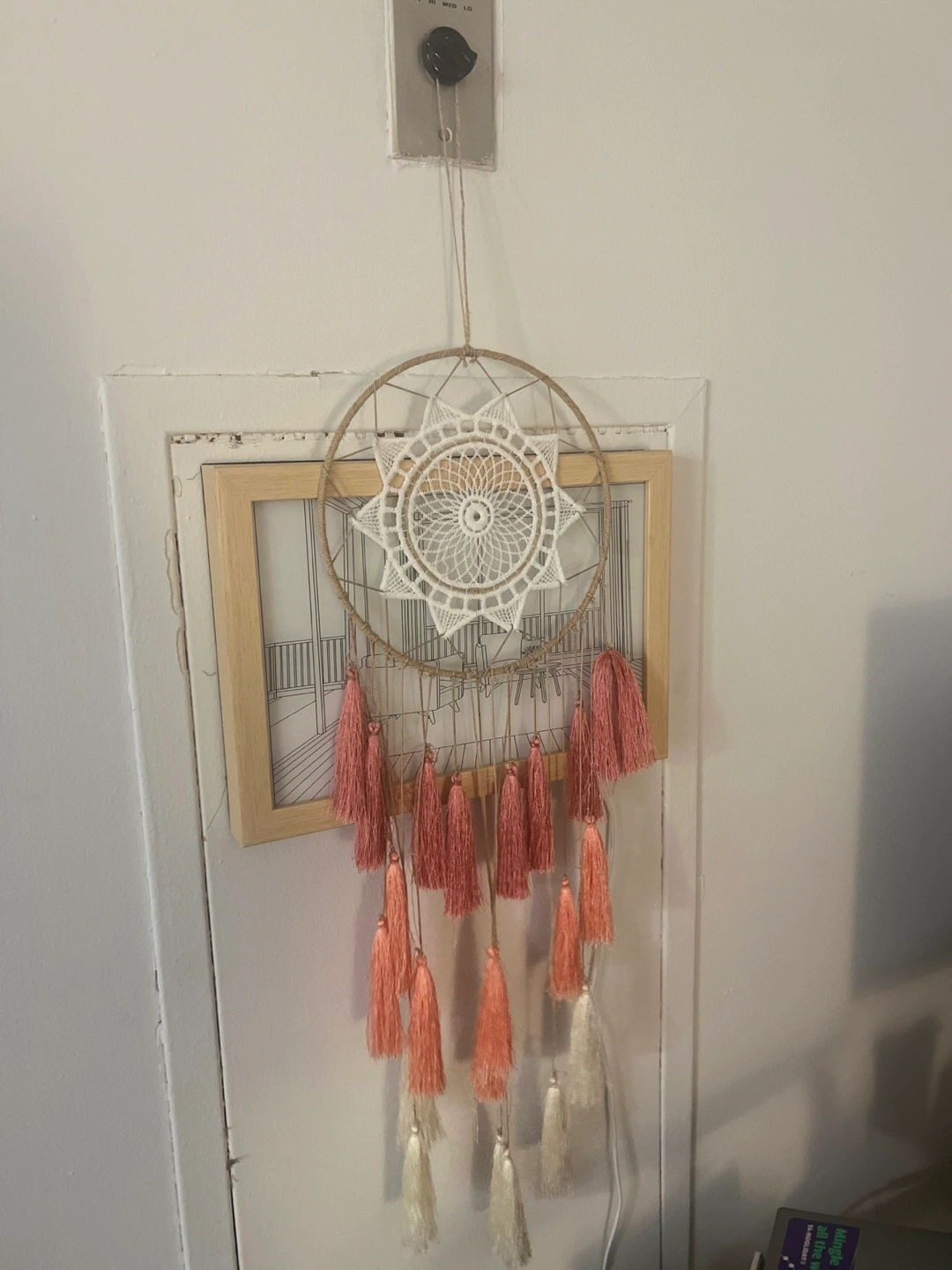 Unique dreamcatcher featuring a crocheted star design and multiple blush pink and cream tassels. Wooden ring. Lovely addition to any room.