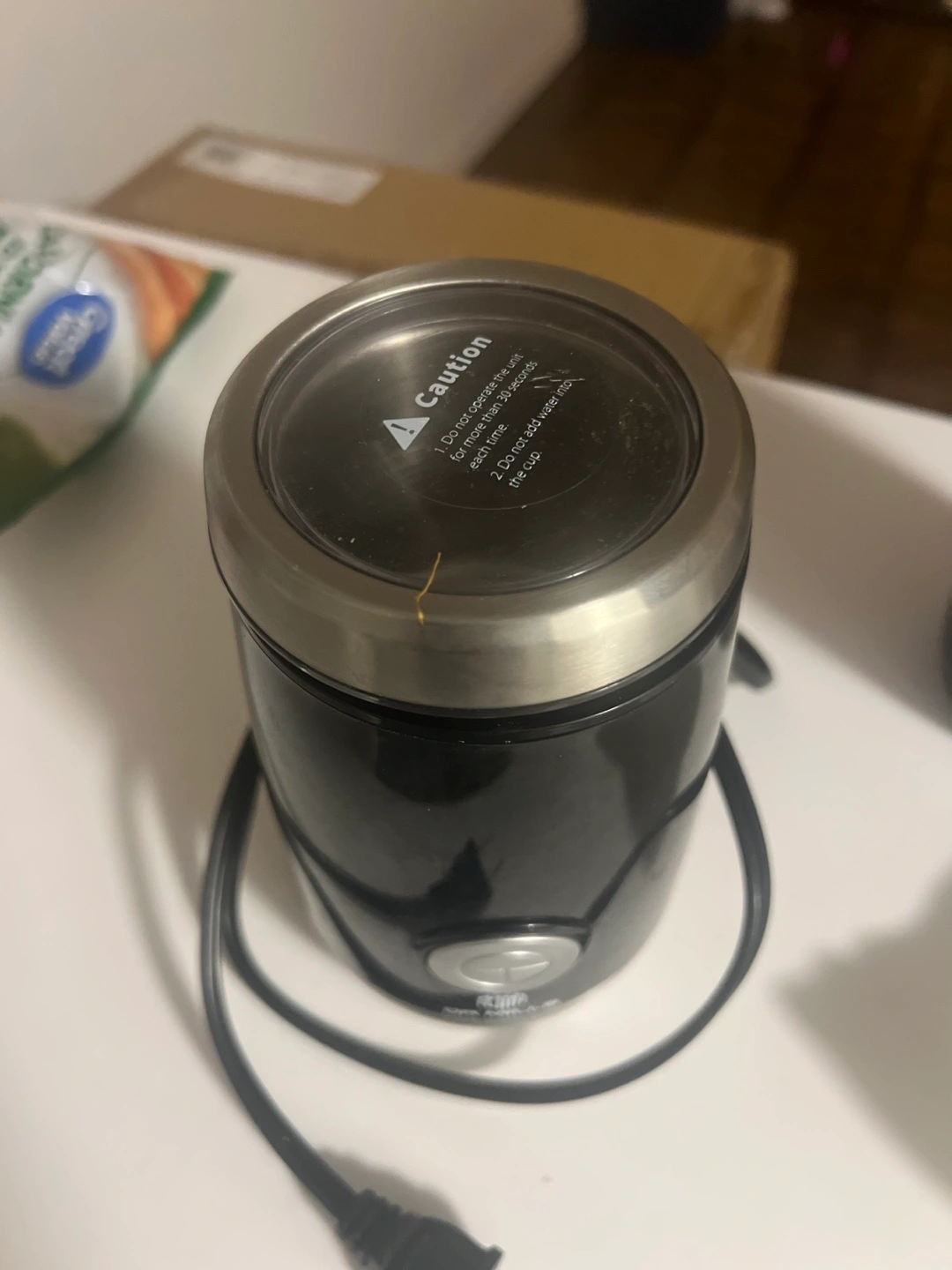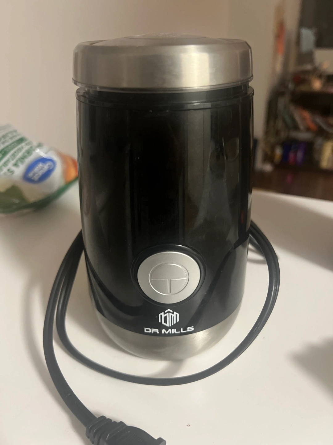 Compact electric spice grinder. Black with stainless steel accents. Includes power cord. Good for small quantities of spices. Amazon link: https://a.co/d/1ezjfiy