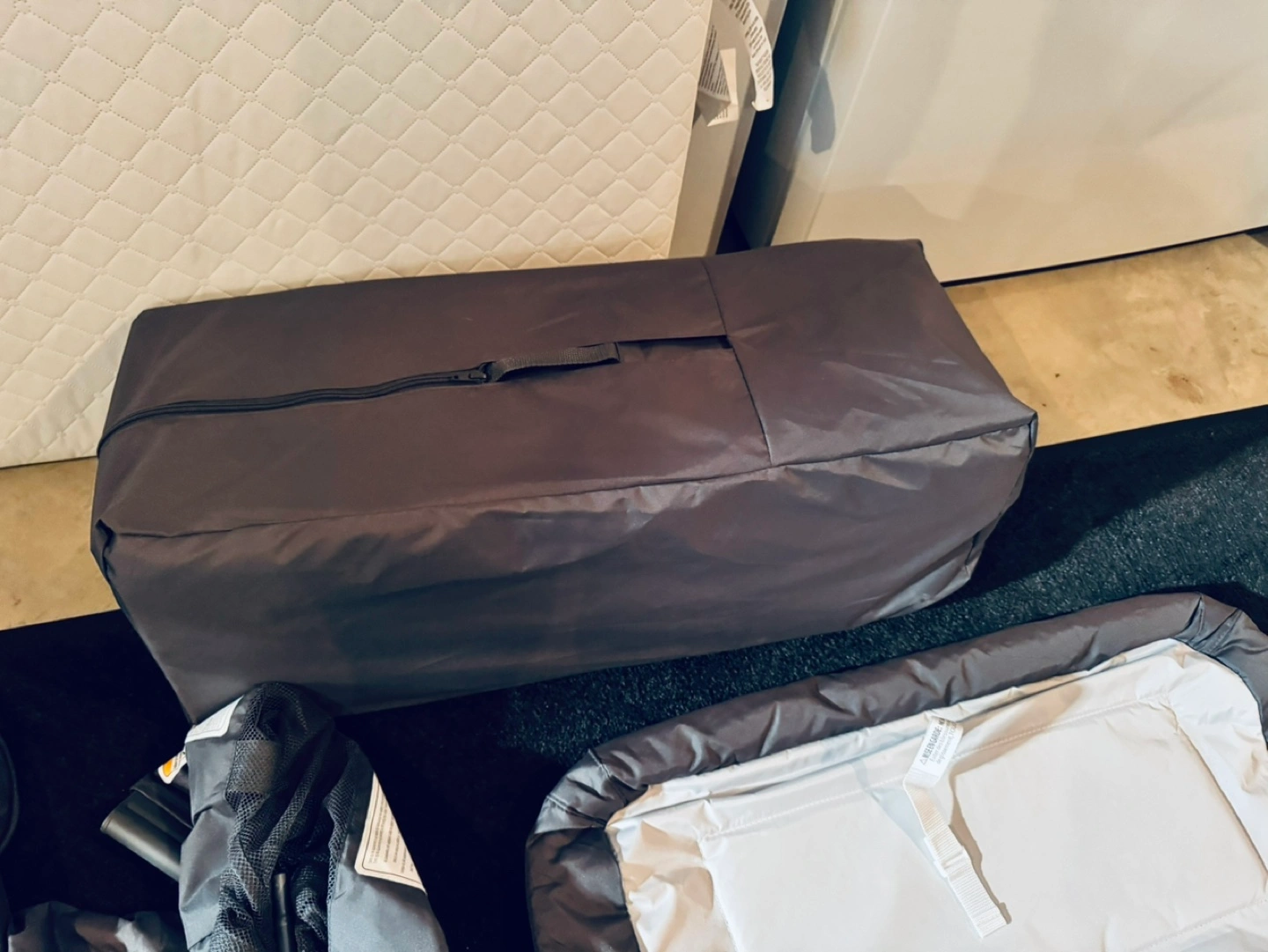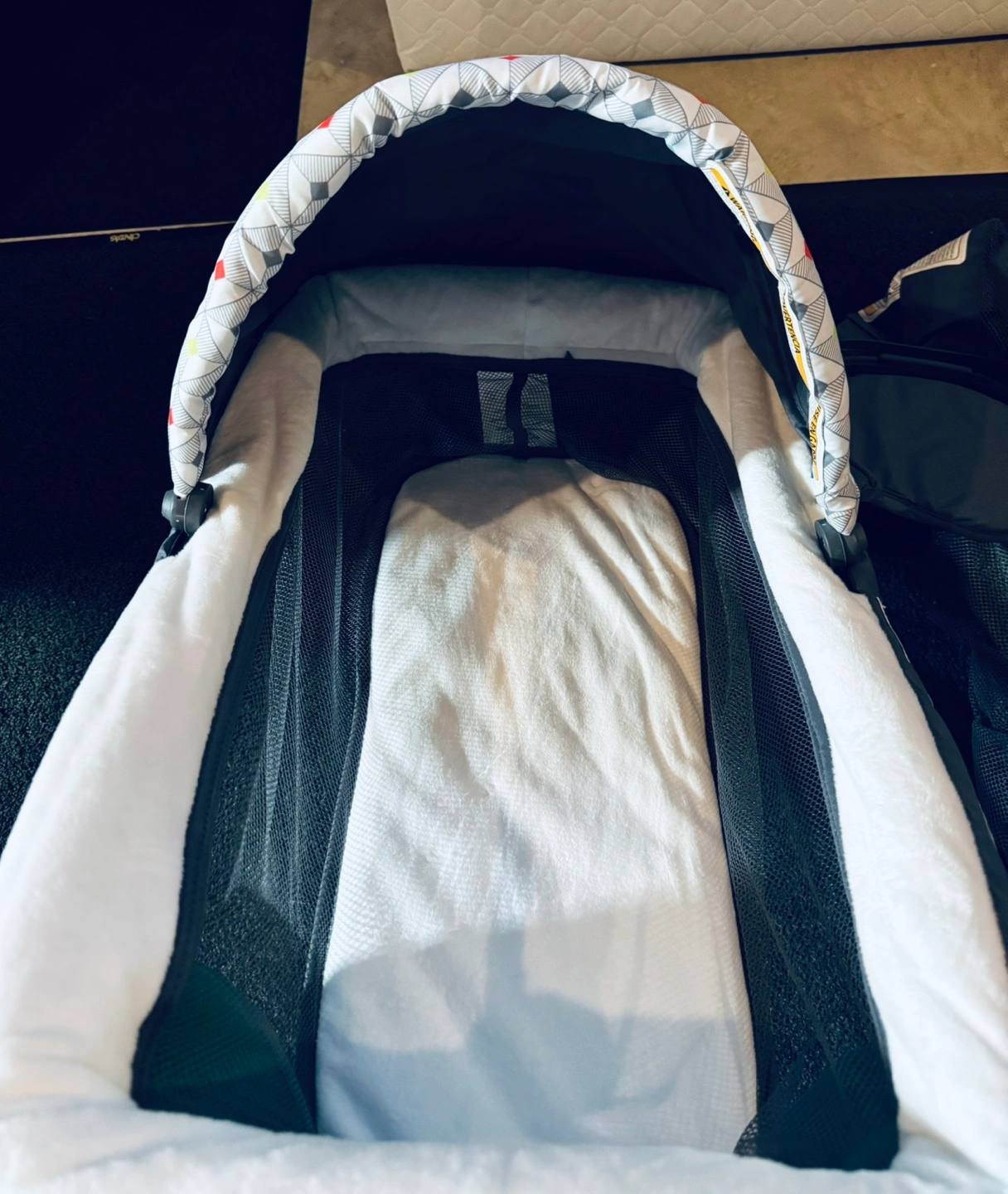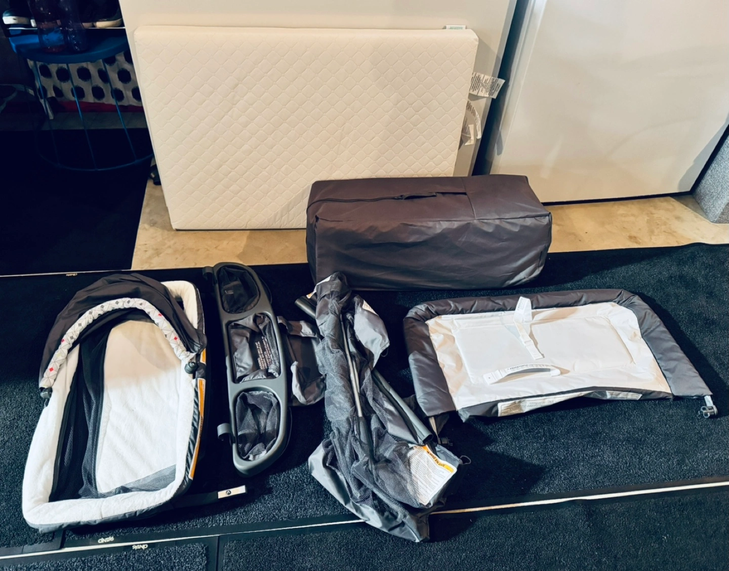 Used - like new - it would only be used at home and very carefully travel playard / nursery Center with mattress and bed sheet There is a small hole in the lower part of the changing mat. This is only visible when you look at it from below (see photo)