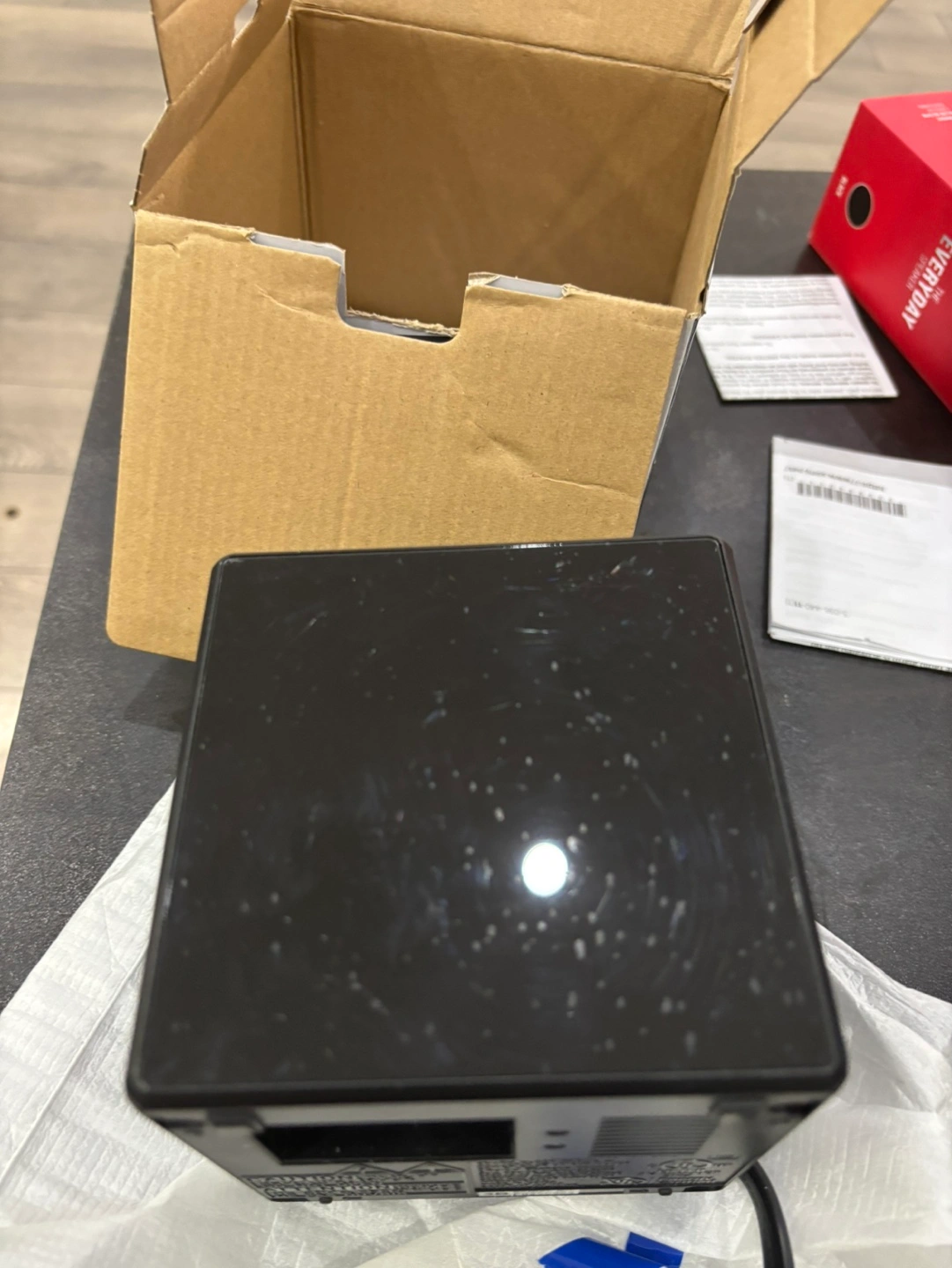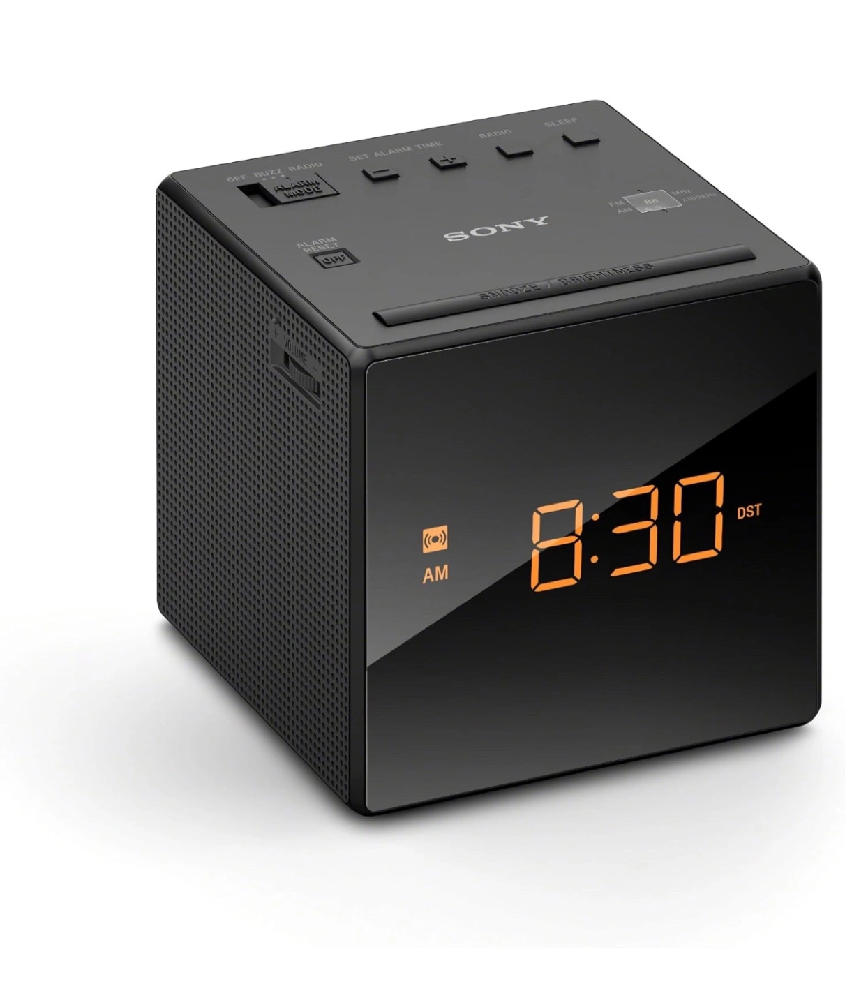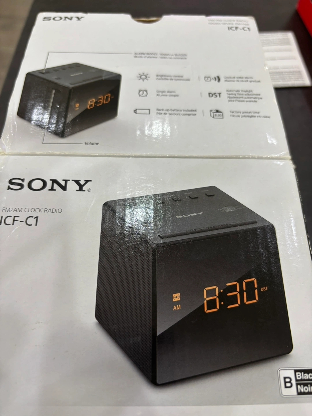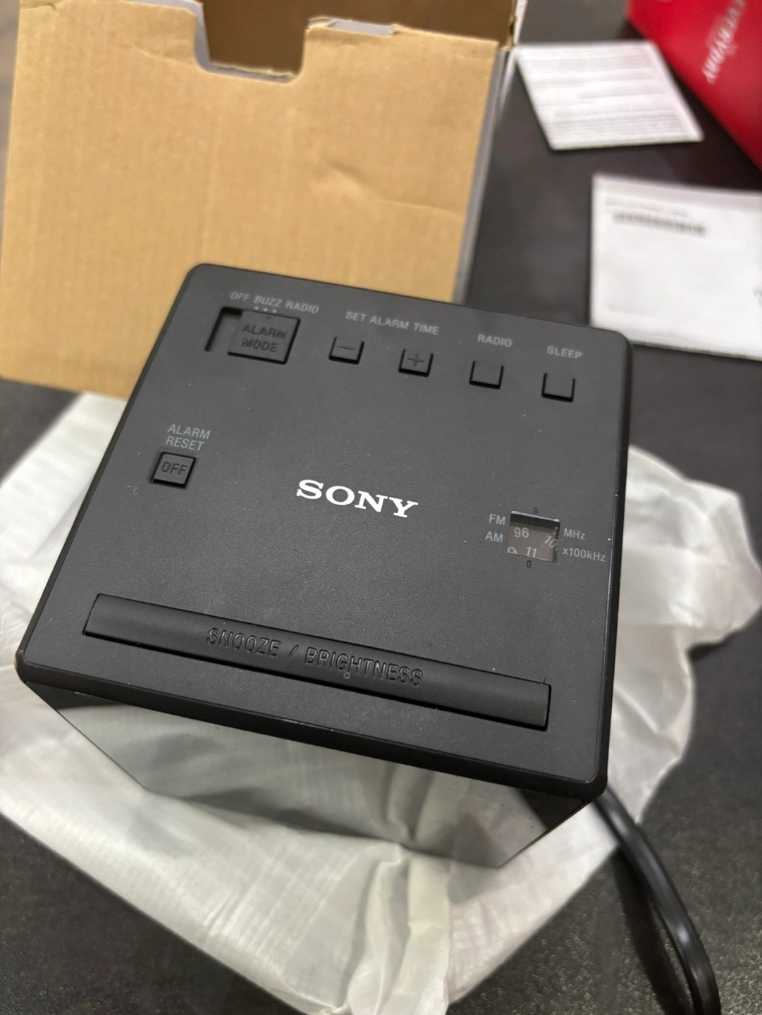 Black Sony ICF-C1 clock radio. Compact design. Features include FM/AM radio, alarm, sleep timer, and adjustable brightness. In original packaging.