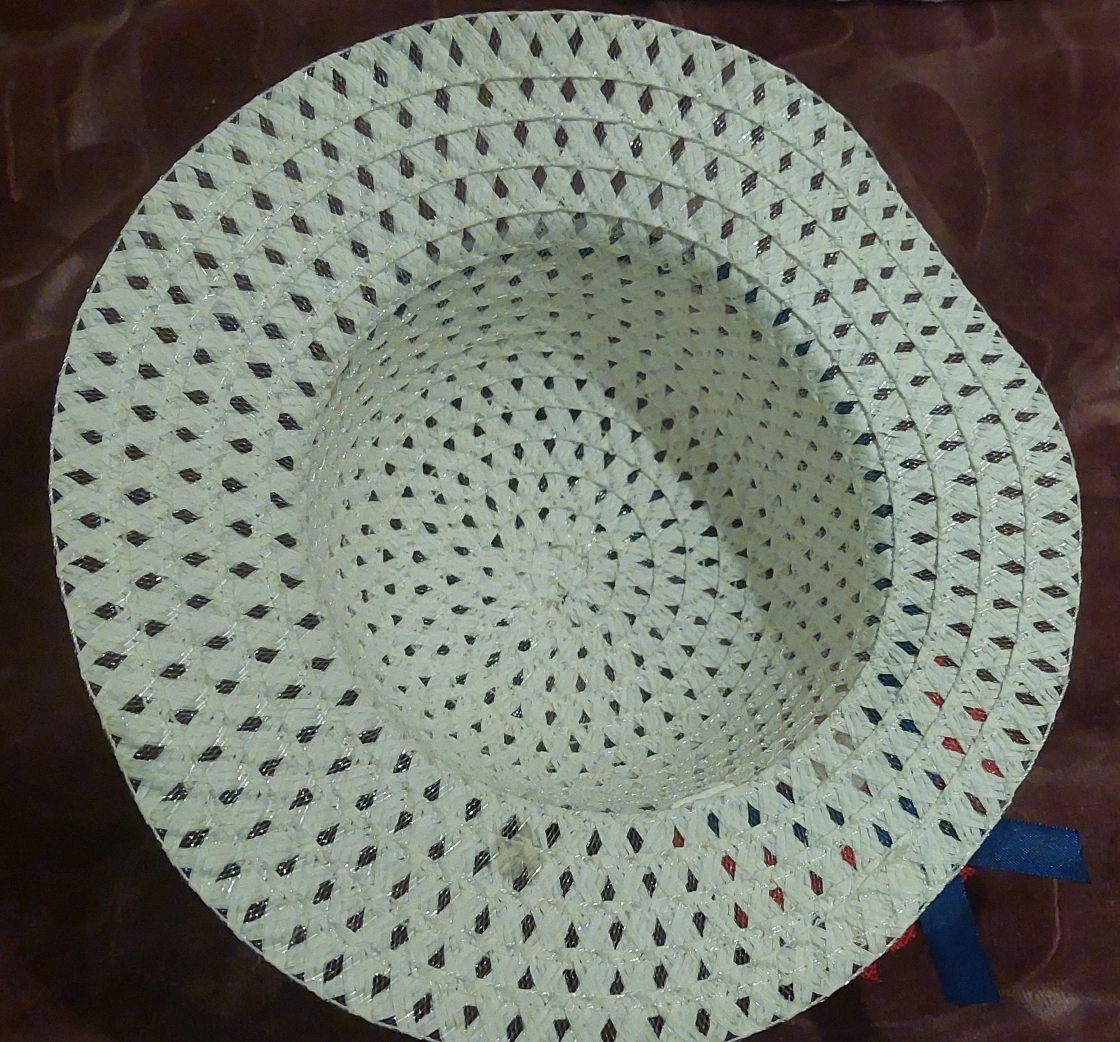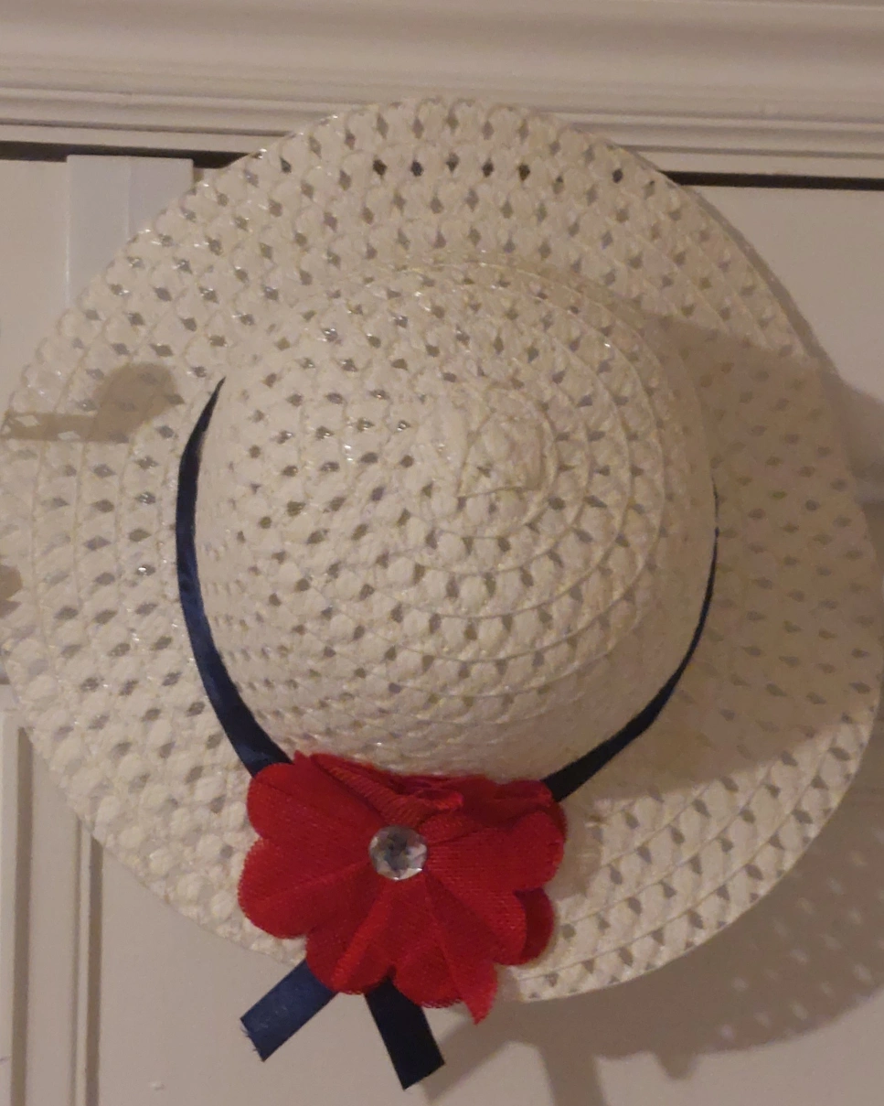 Cream-coloured straw sun hat. Features a red flower accent and navy blue ribbon. Perfect for summer!