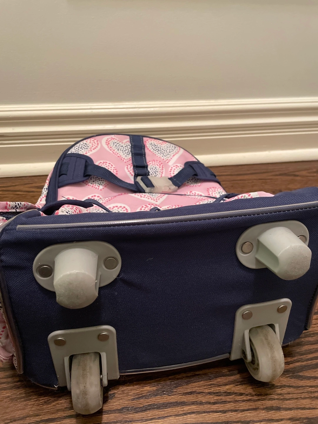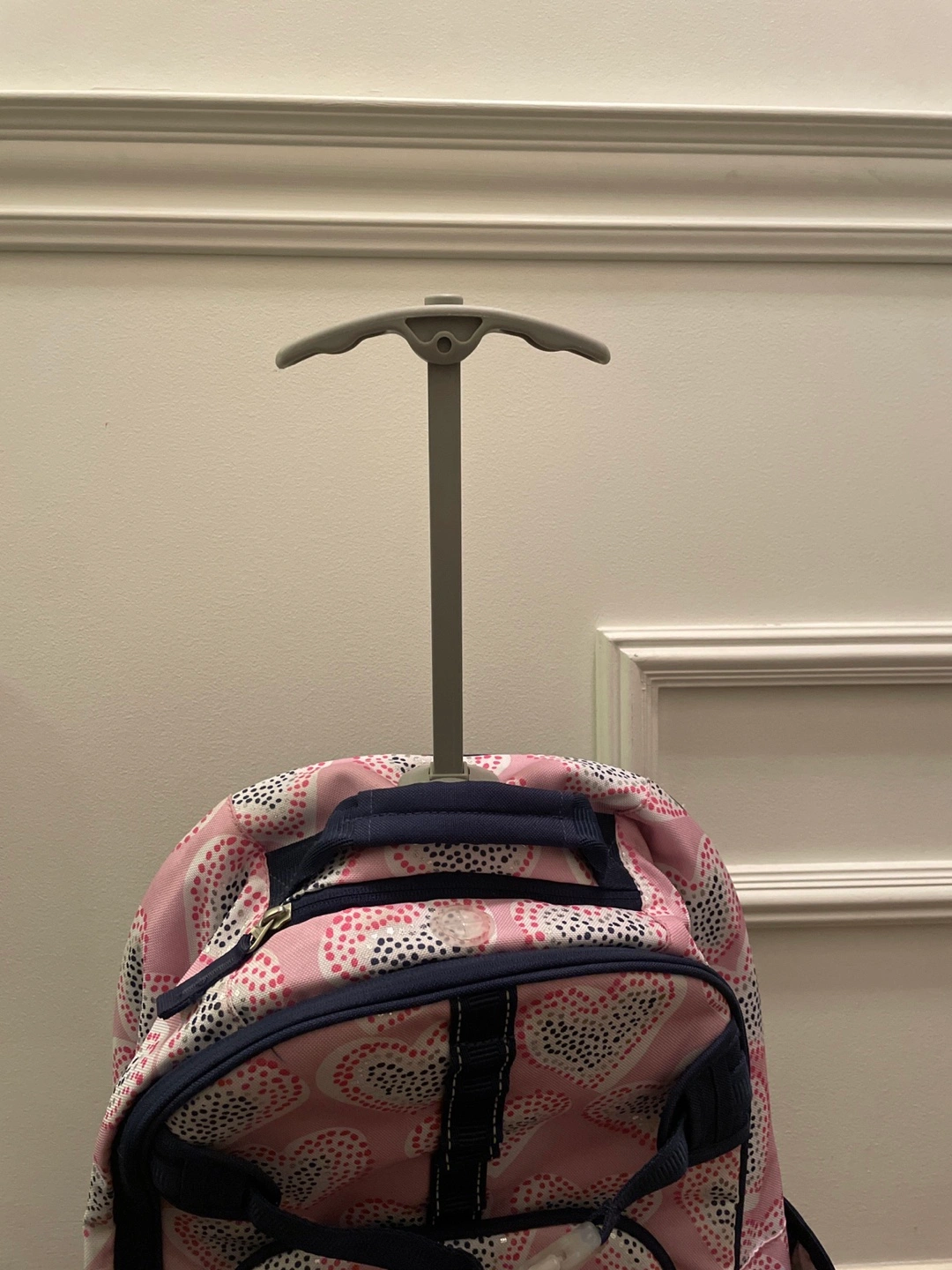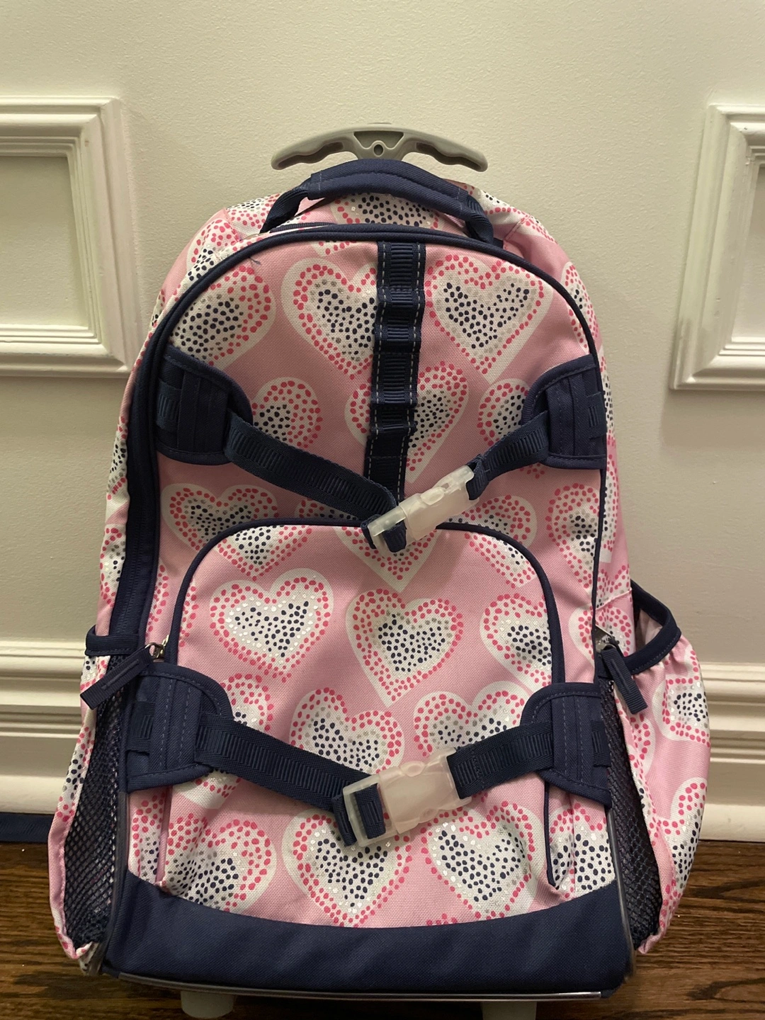 Cute rolling backpack. Features pink hearts pattern, navy blue accents, and multiple pockets. Great for school or travel. Includes retractable handle and wheels. Bought from Pottery Barn Kids