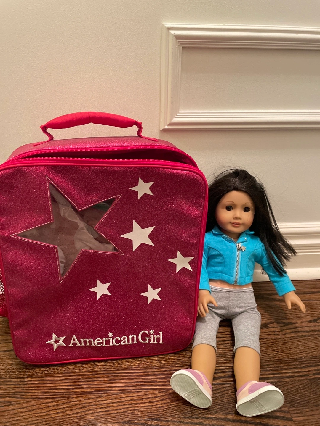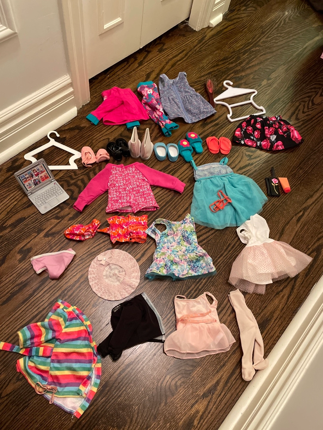 Large bundle of American Girl doll clothes and accessories. Includes various outfits, shoes, hats, and a laptop. Perfect for imaginative play. Great condition. Comes with travelling bag.