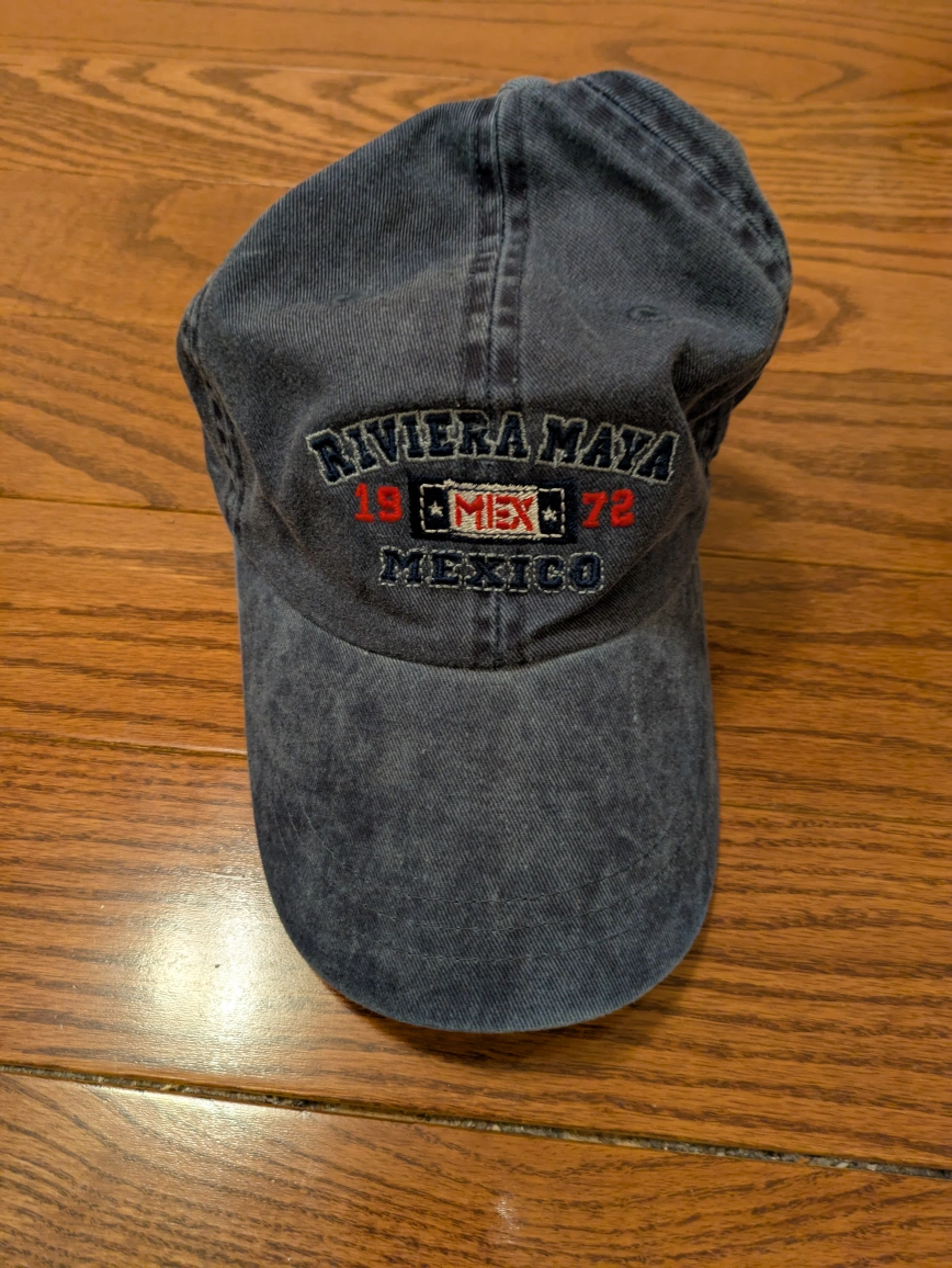 Blue denim baseball cap. Features embroidered Riviera Maya logo. Made in China.