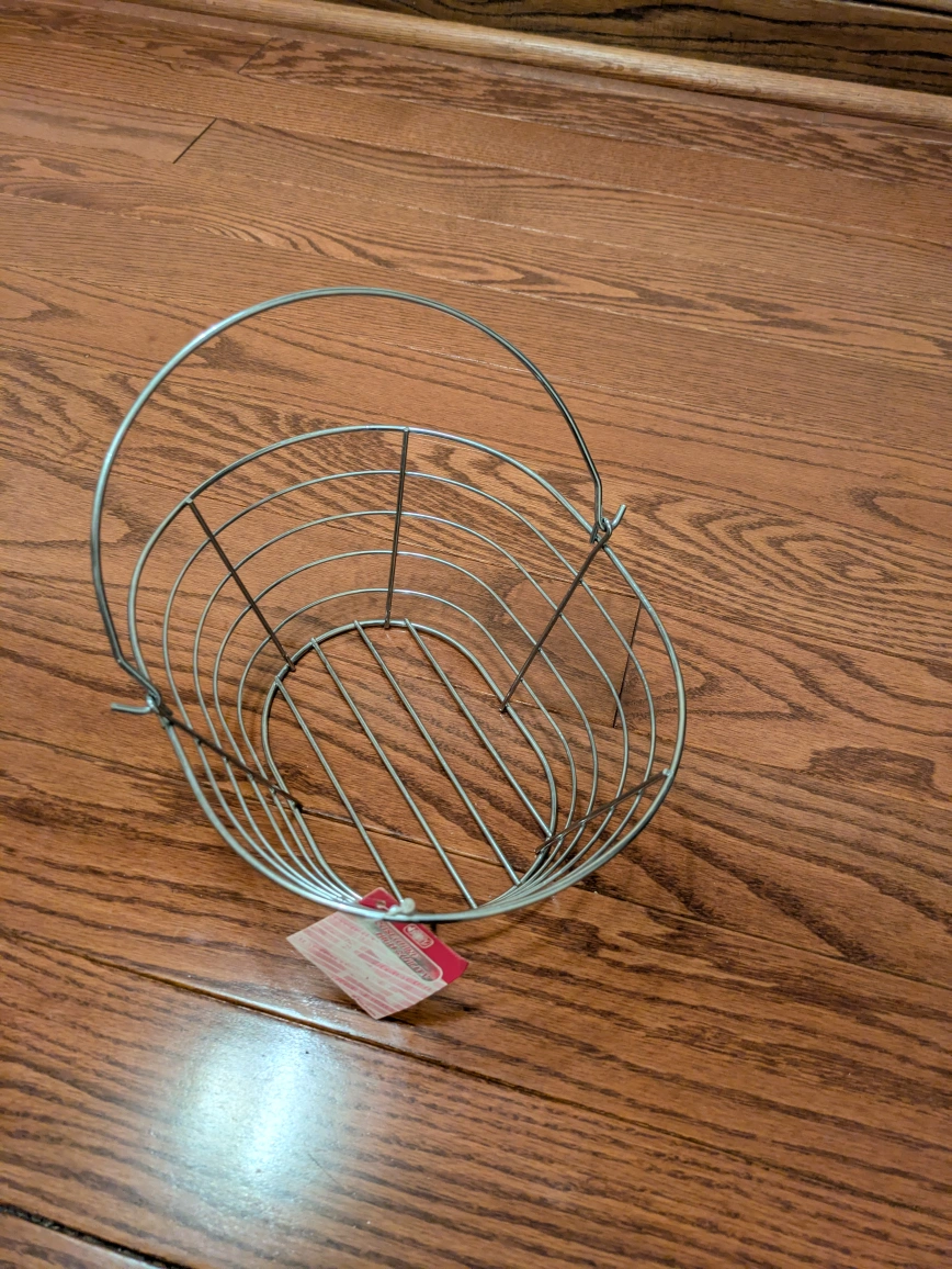 Silver metal wire basket. Oval shaped. Features a carrying handle. New with tag.
