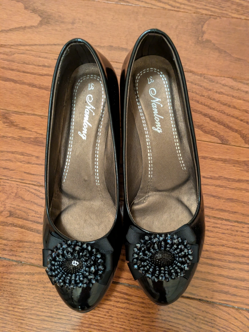 Pair of black patent leather shoes. Low heels. Embellished with dark jewel-toned floral accents. Size 7.
