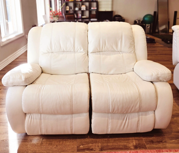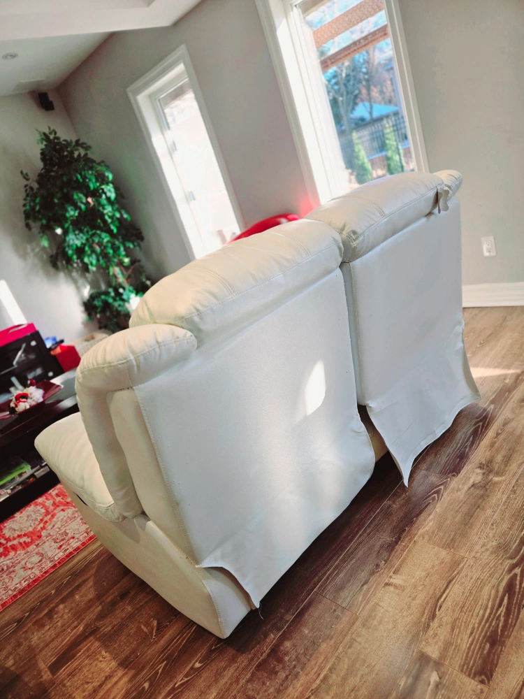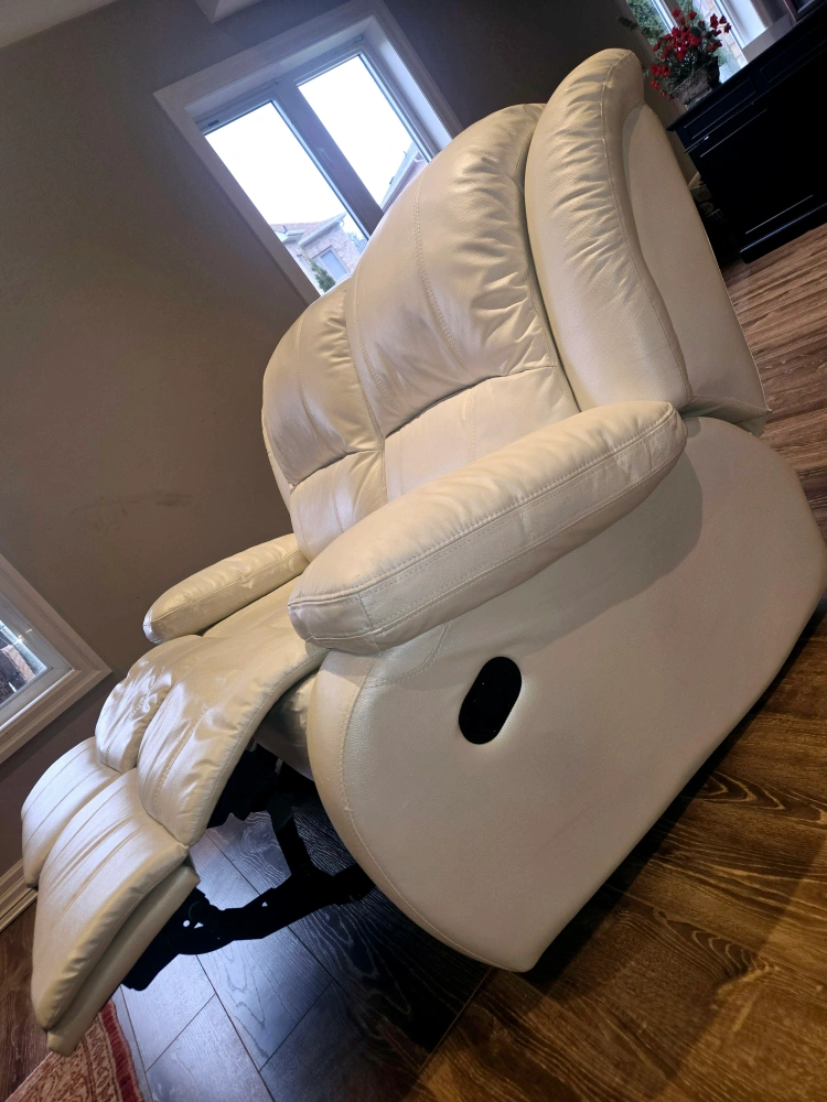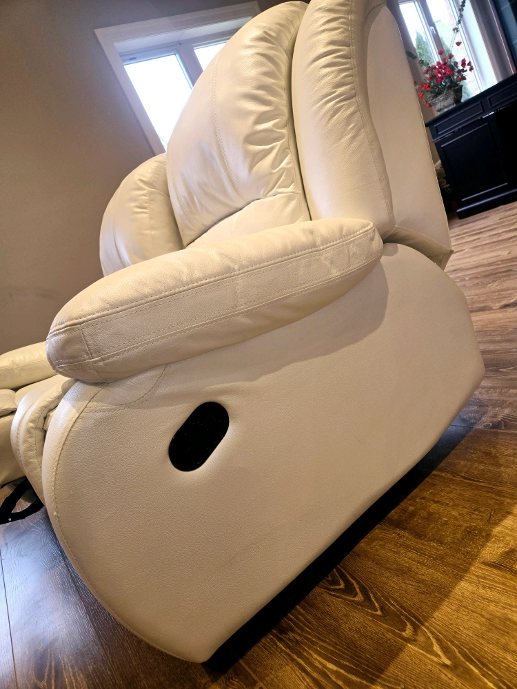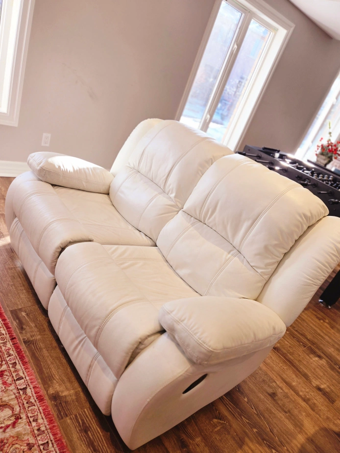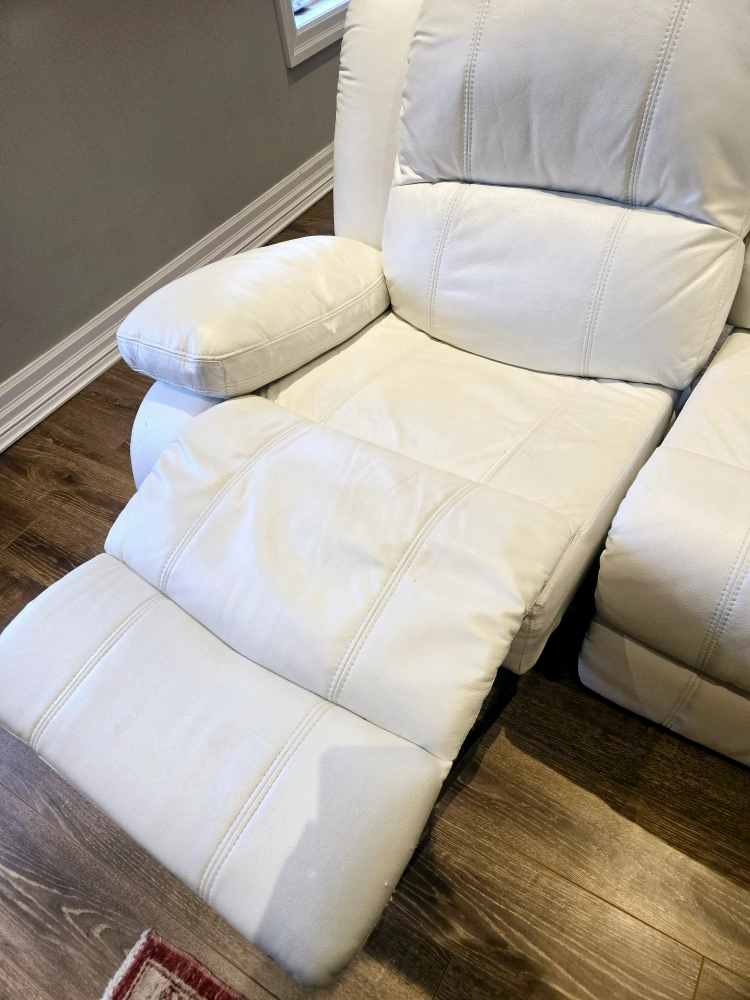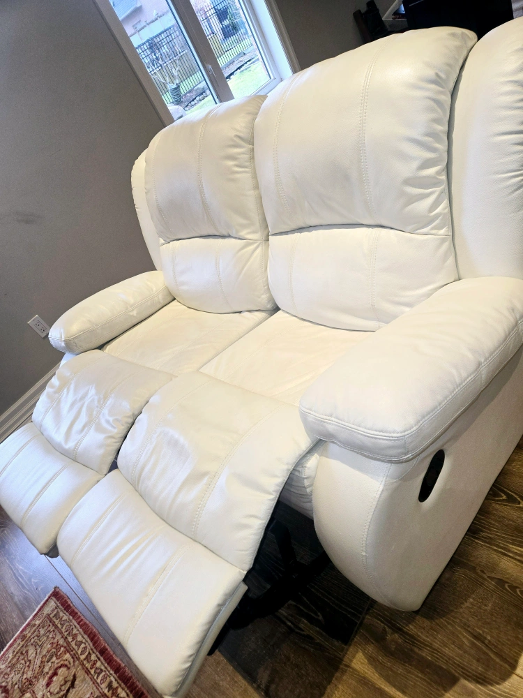 Two-seater reclining loveseat. White leather upholstery. Reclining mechanism. Comfortable seating. . Cat🐈friendly home. Some cat scratches on the side and back. it's unattached for easy delivery. Depth 34" Height 40" Width 60" Pick up: From Richmond Hill