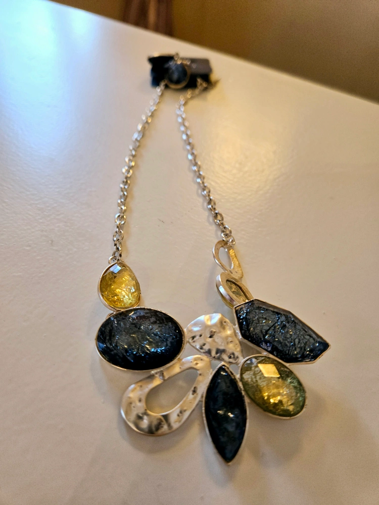 Beautiful statement necklace. Features a silver-toned chain and a pendant with blue and yellow stones. Unique design. Matching earrings included.