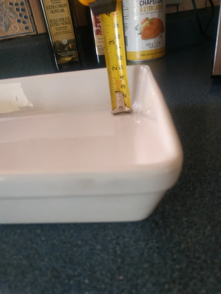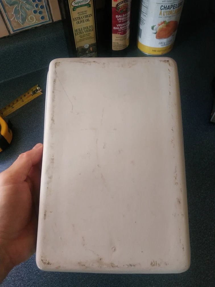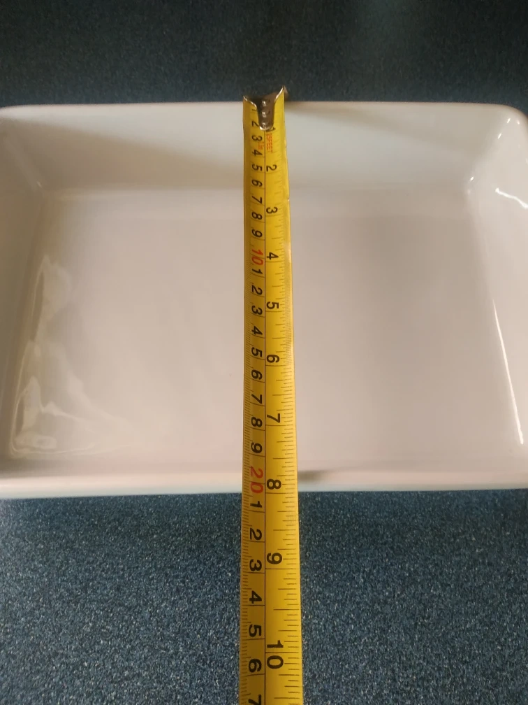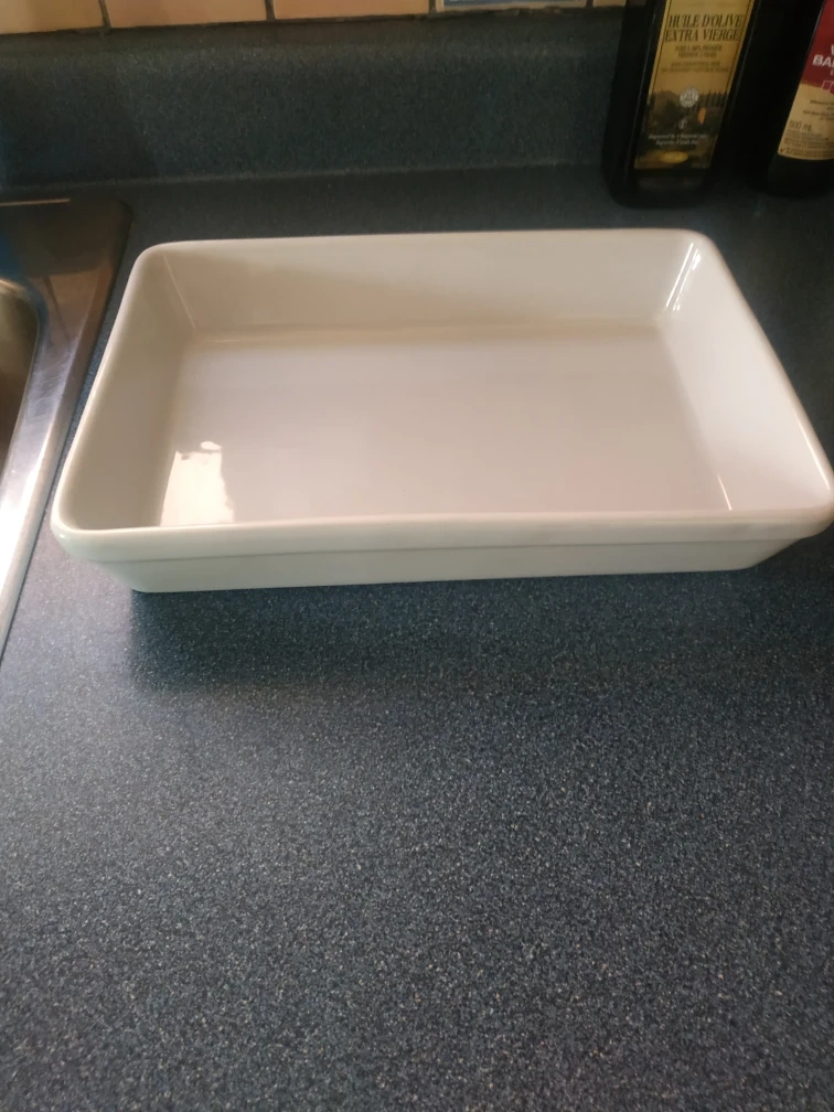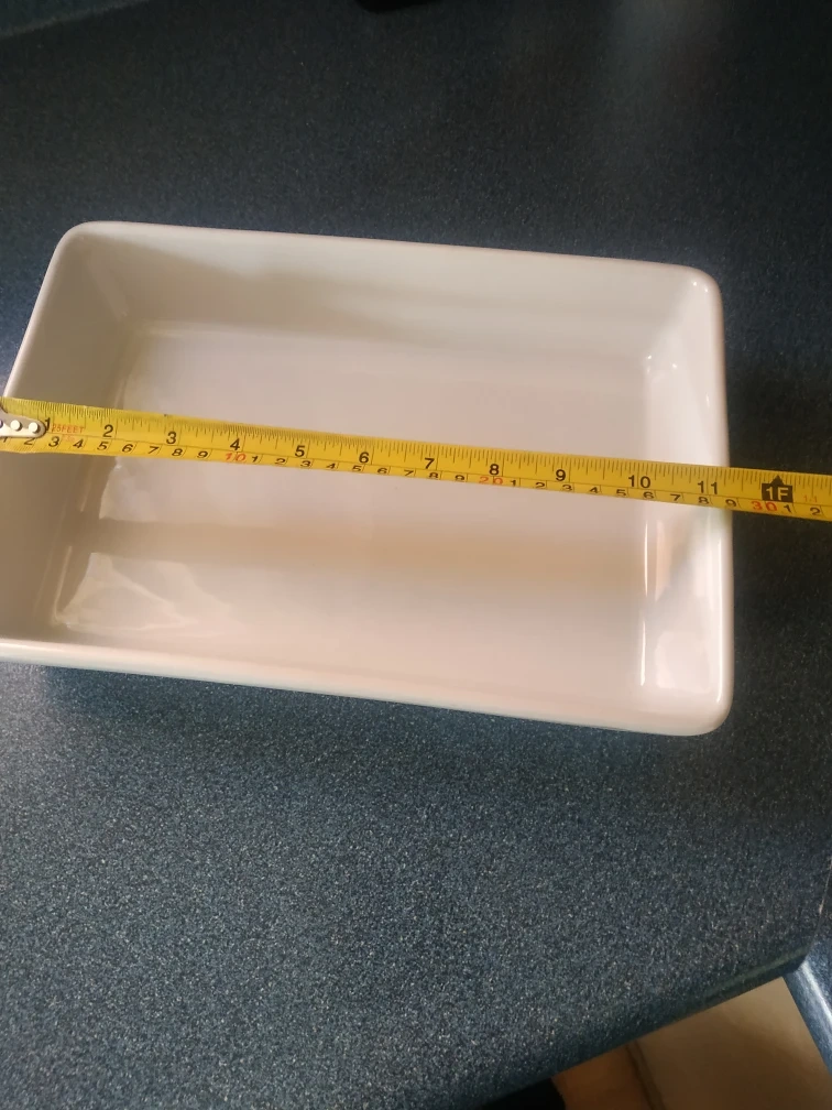 Large rectangular baking dish. White ceramic. Measures approximately 11 inches long and 7.5 inches wide. Some scuffs on bottom.