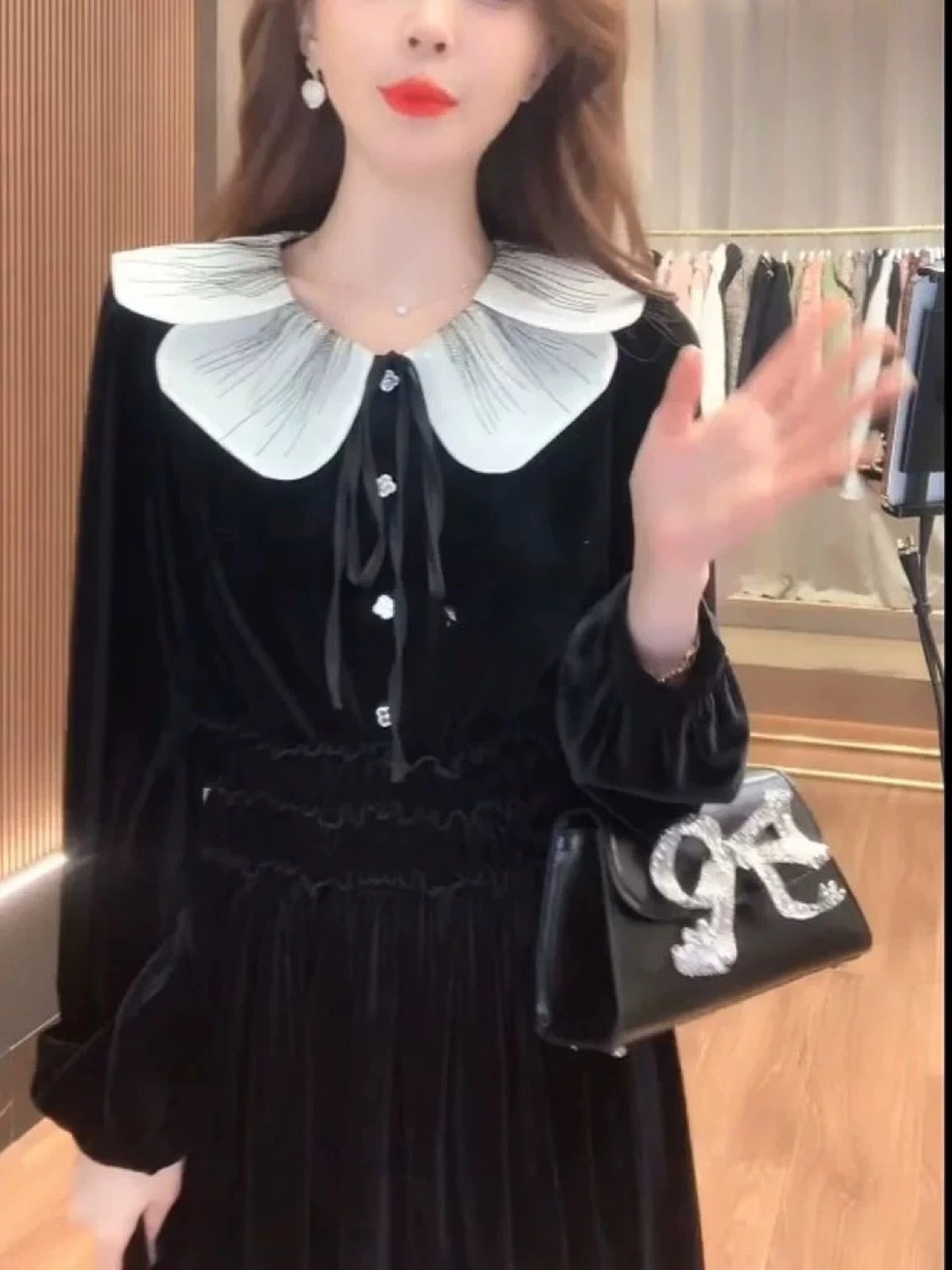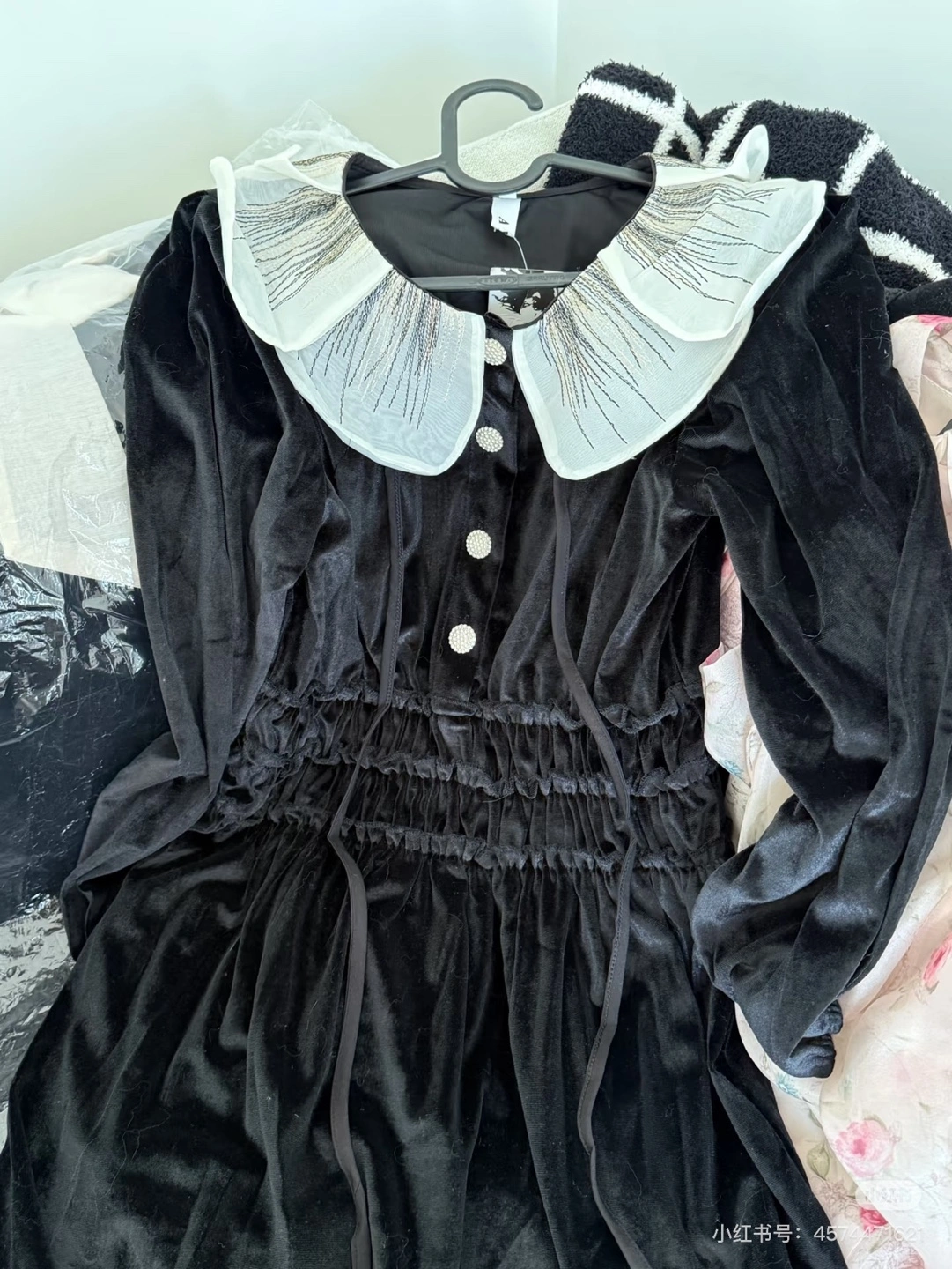 Elegant black velvet dress. Features a large Peter Pan collar with embroidered detailing and long sleeves. A cinched waist creates a flattering silhouette. Button closure. Perfect for a special occasion like Valentine’s Day’s outfit or a night out. New with tag and bag!