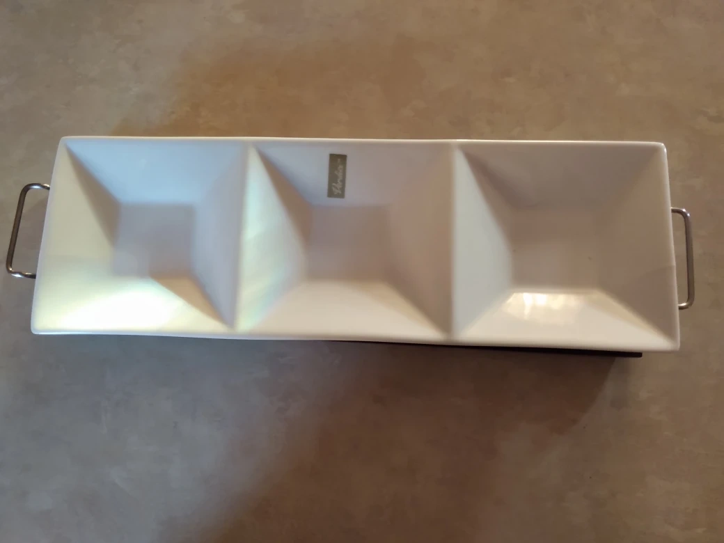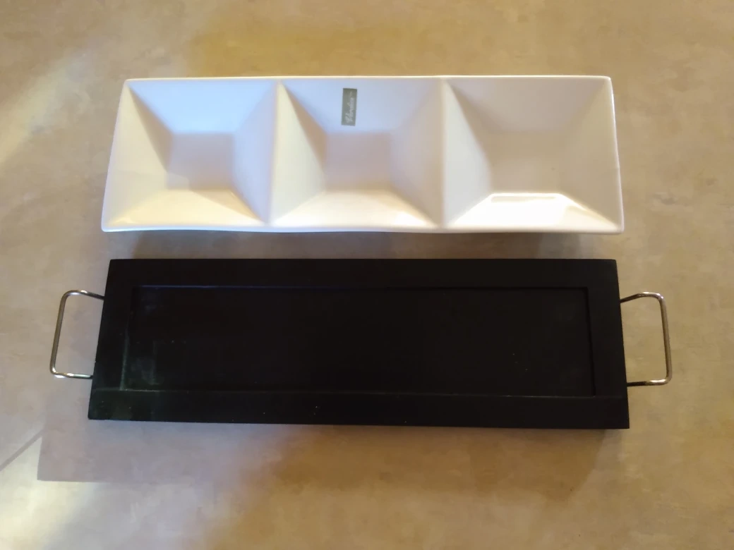 Brand New White porcelain serving dish. Three divided sections. Modern design. Includes a matching black wooden tray with silver-toned handles. Ideal for appetizers or snacks.