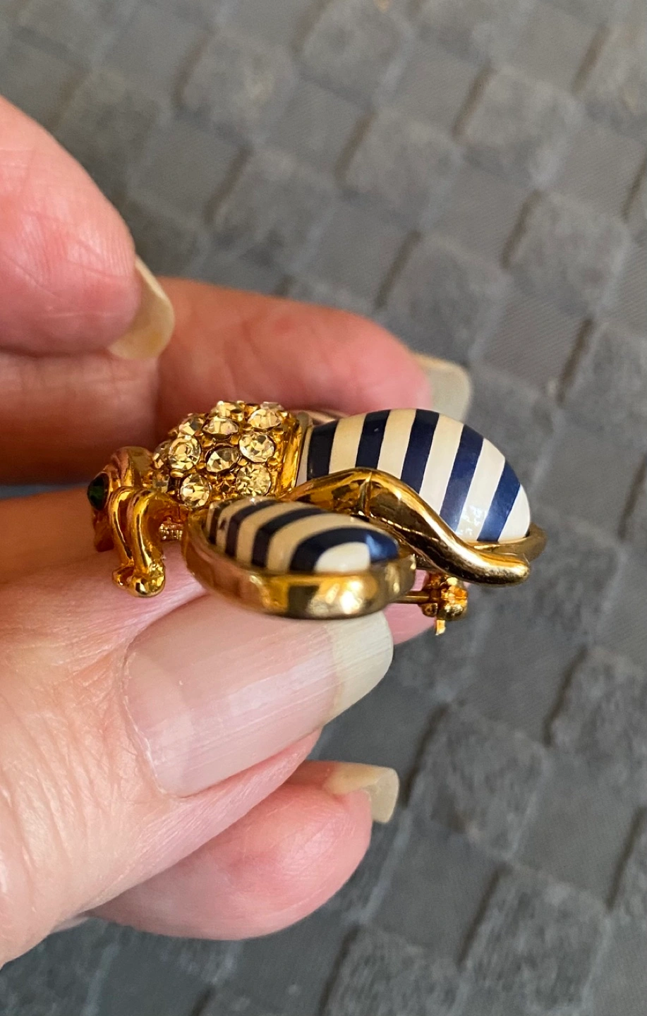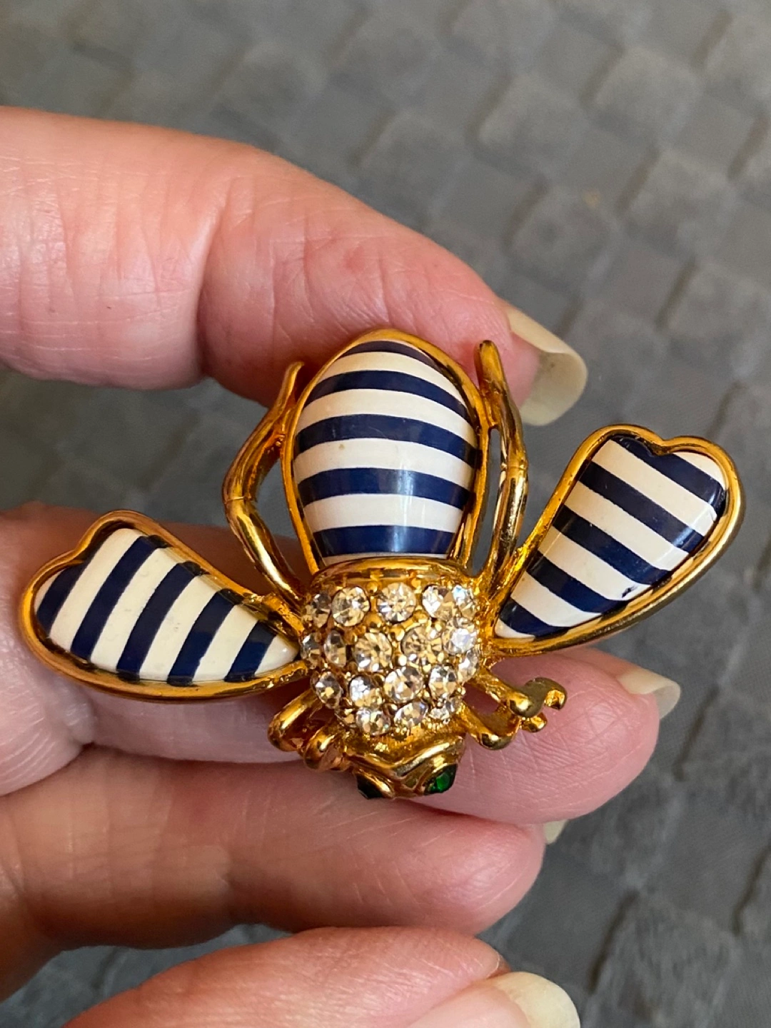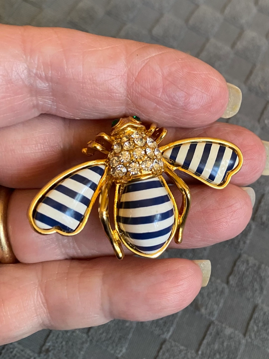 Blue Striped enamel bee brooch. Gold-tone metal. Clear crystals. Blue Green eyes . Beautiful statement piece.