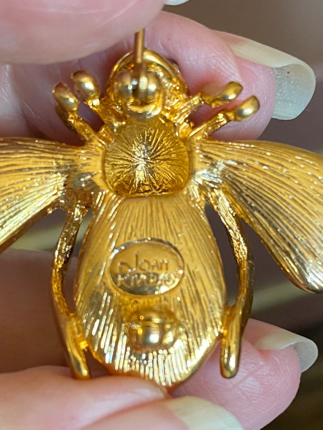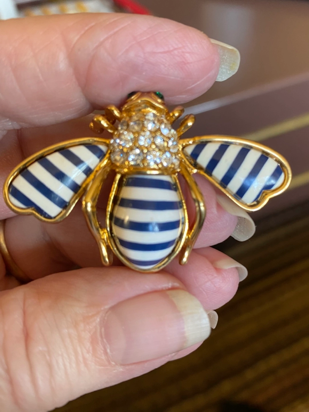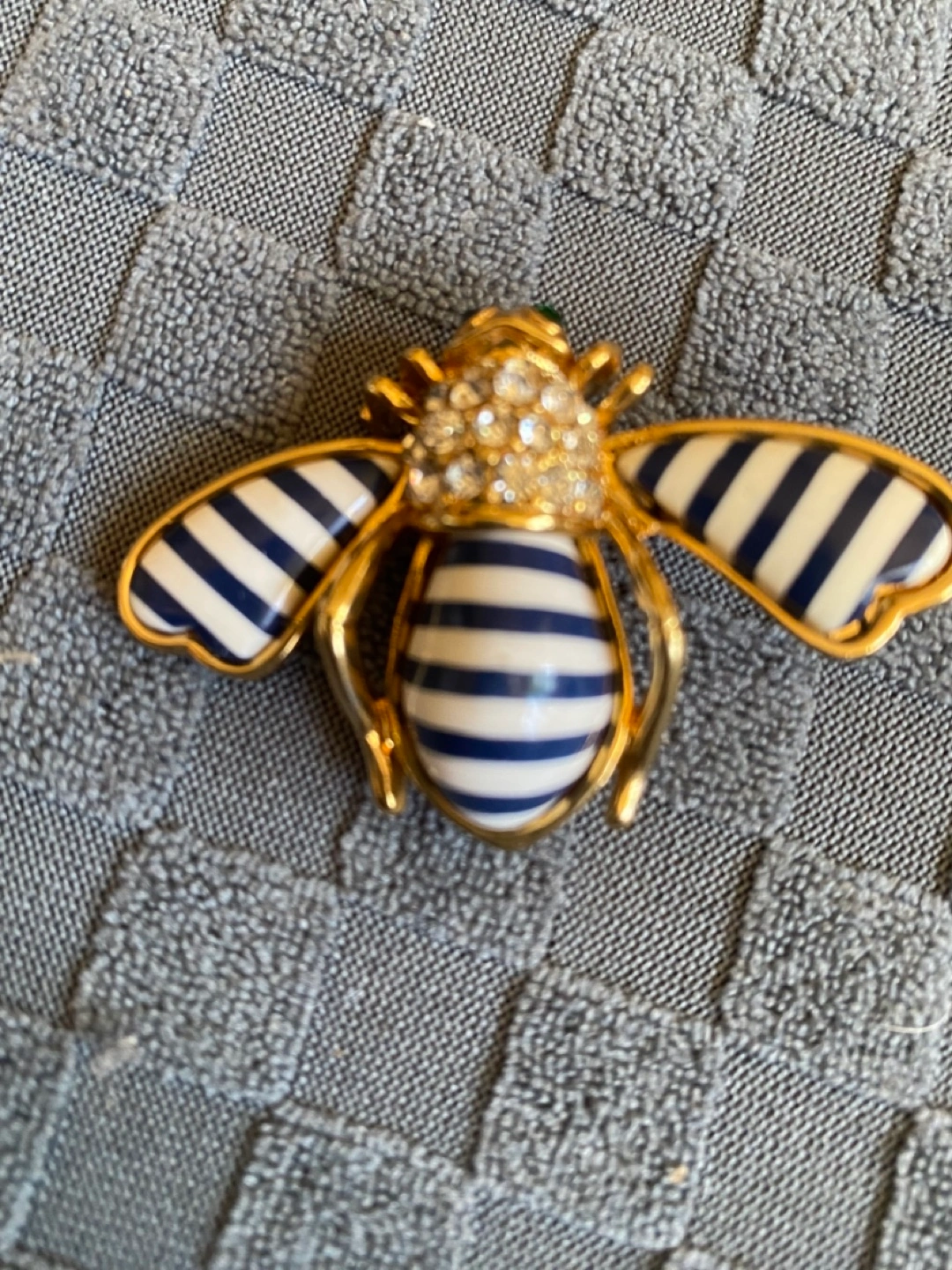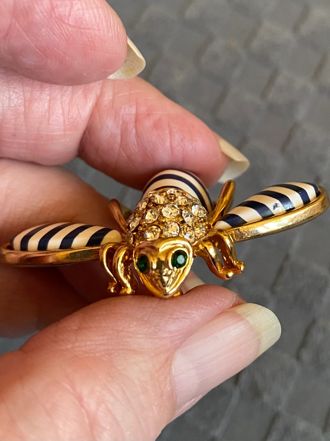 Blue Striped enamel bee brooch. Gold-tone metal. Clear crystals. Blue Green eyes . Beautiful statement piece.