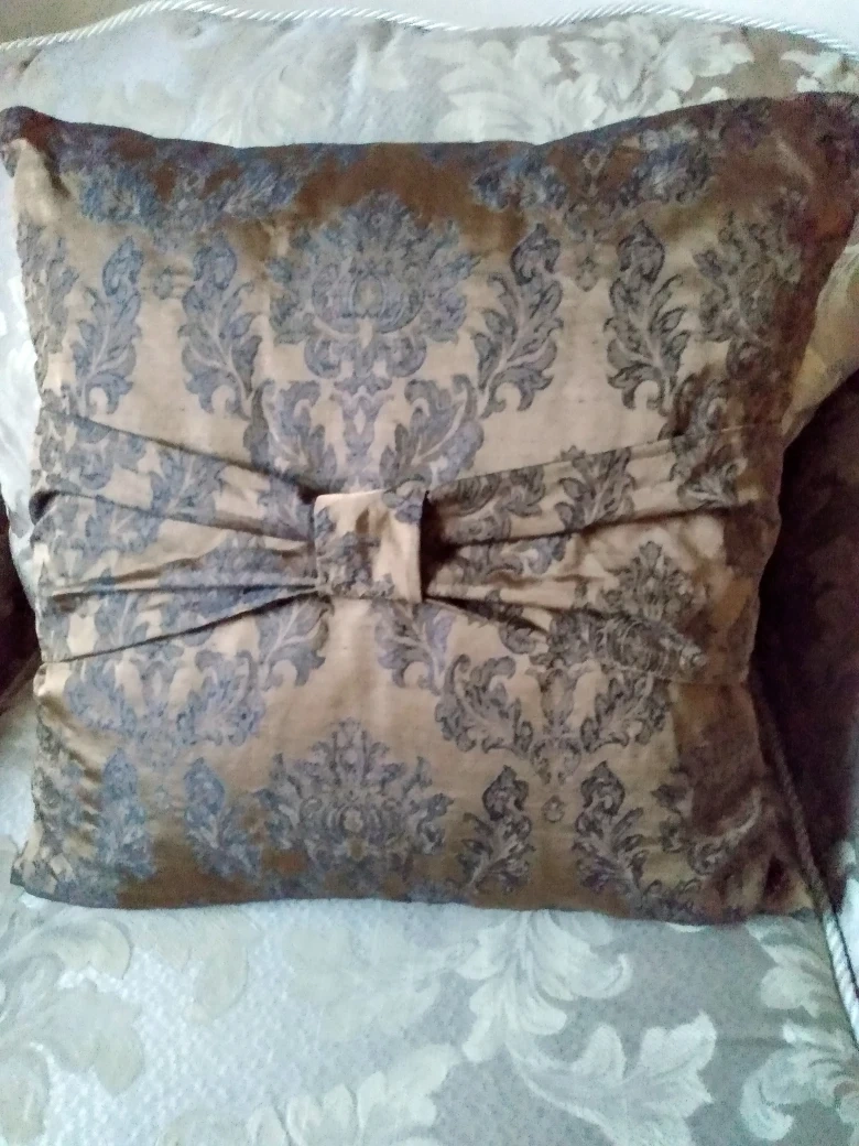 Elegant decorative pillow. Features a brown , black damask pattern and a fabric bow. Suitable for couch or bed. (Cash Pick up)