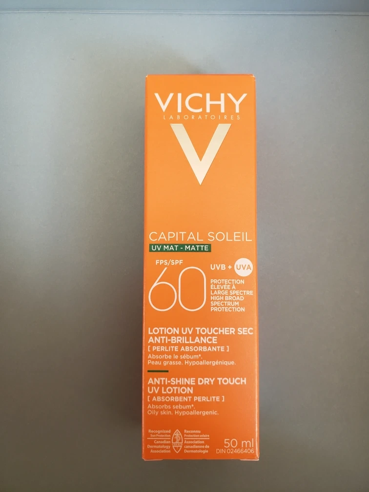 New Vichy Capital Soleil sunscreen. SPF 60. Dry touch lotion. 50ml. Anti-shine. Hypoallergenic. Absorbs sebum. For oily skin.