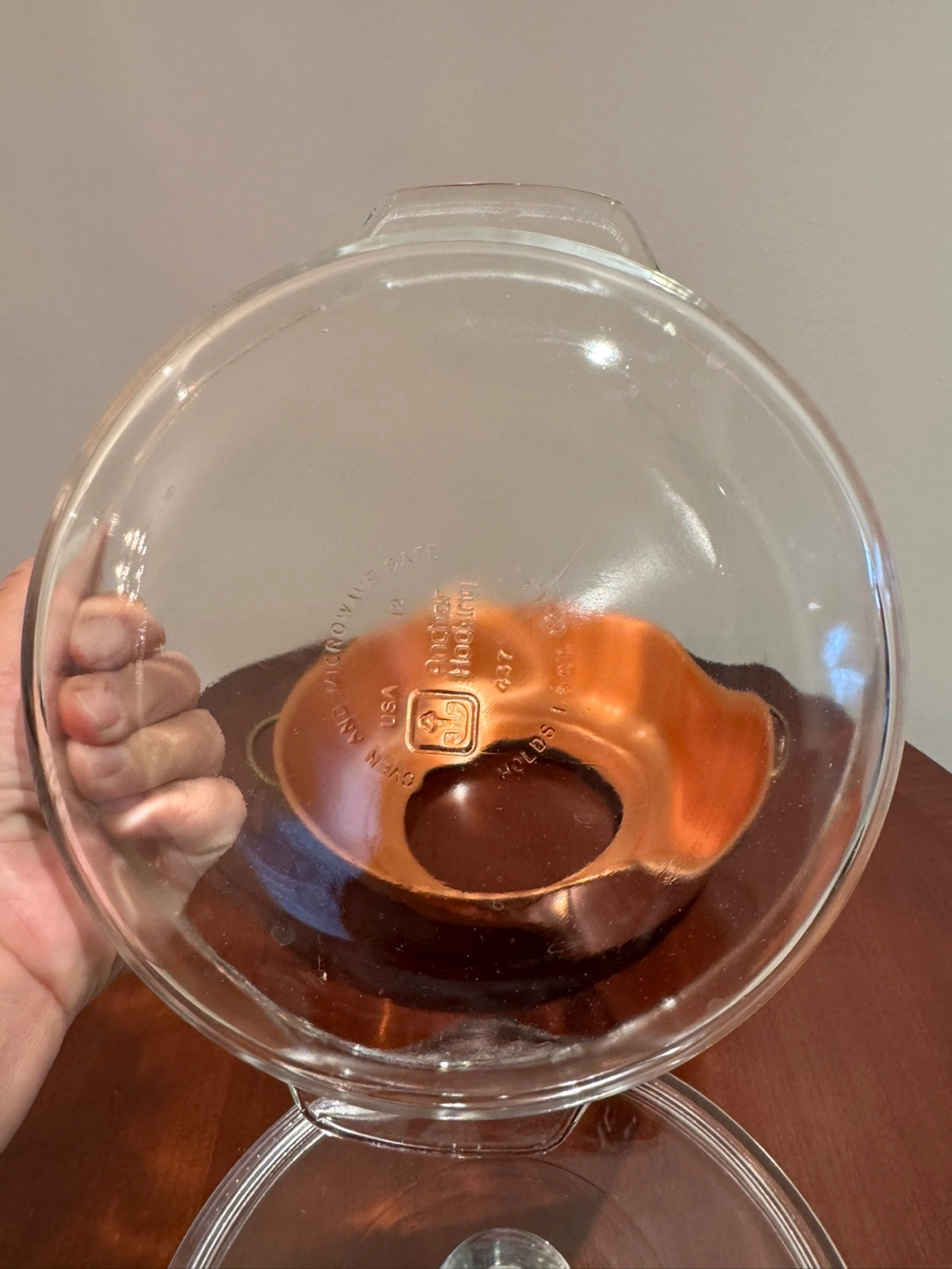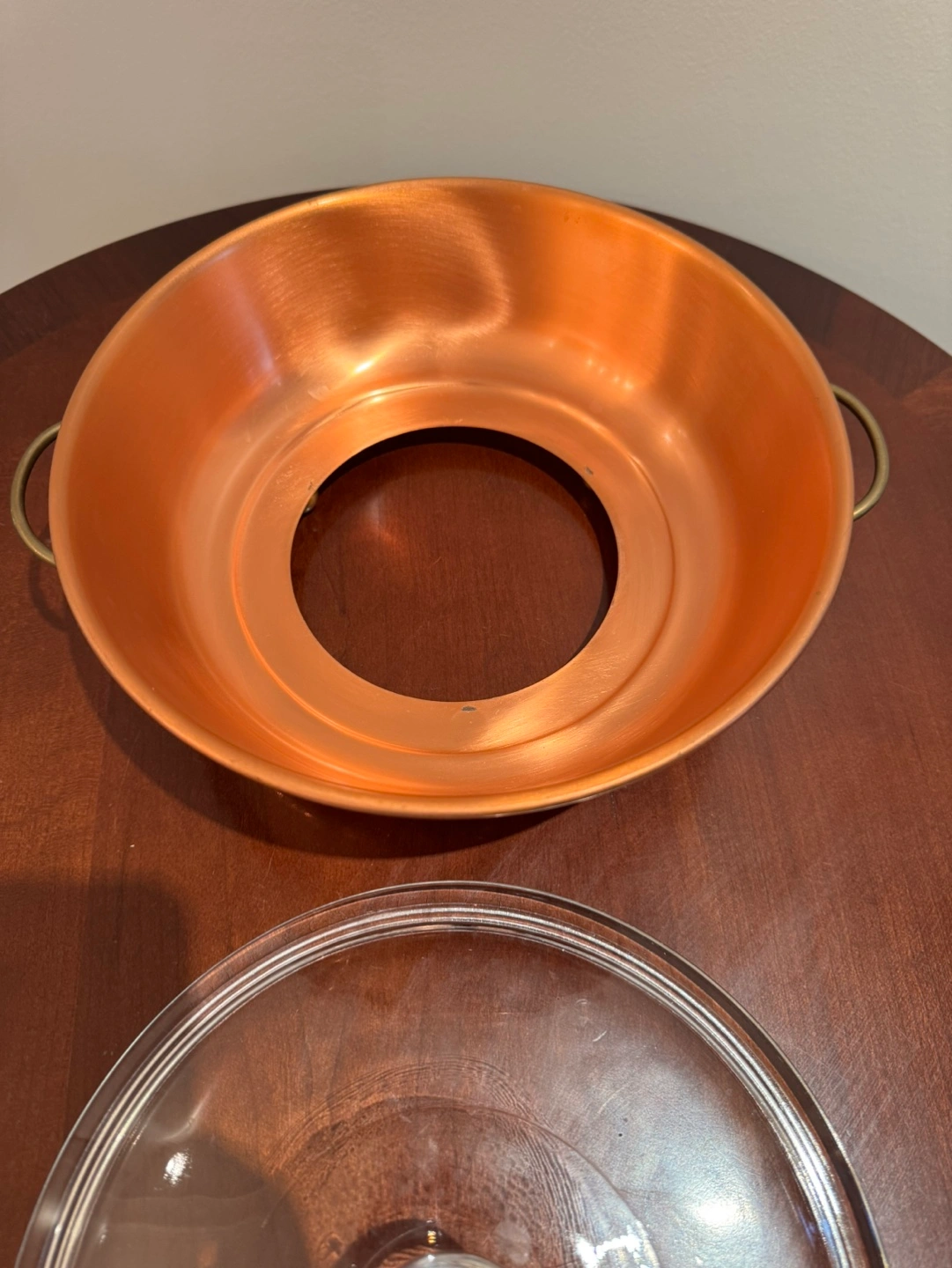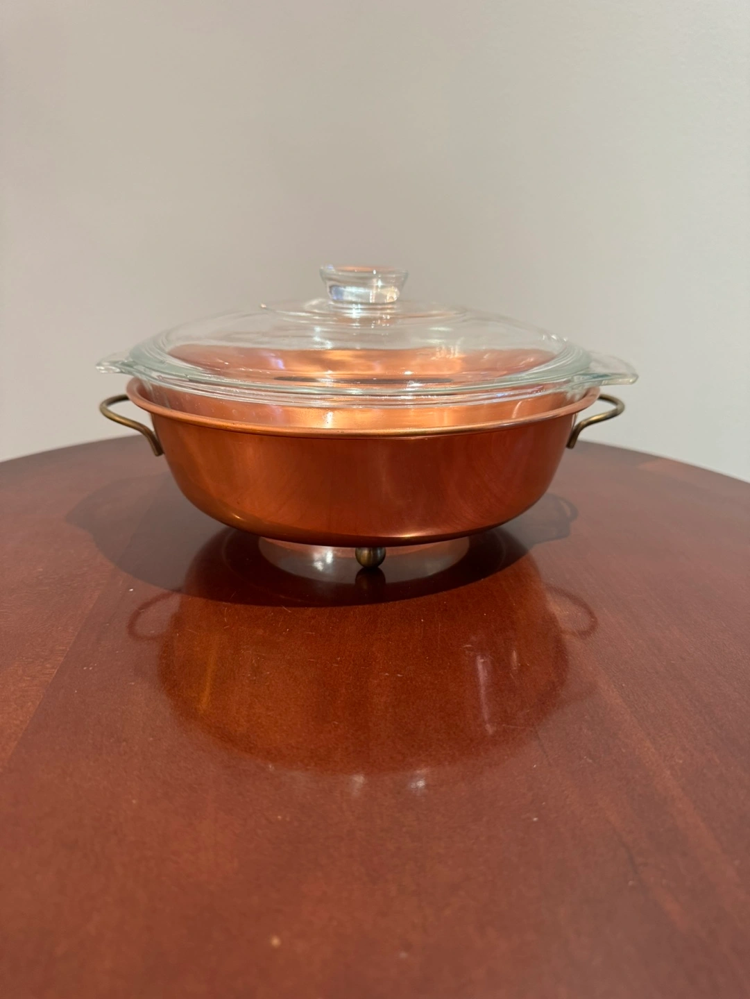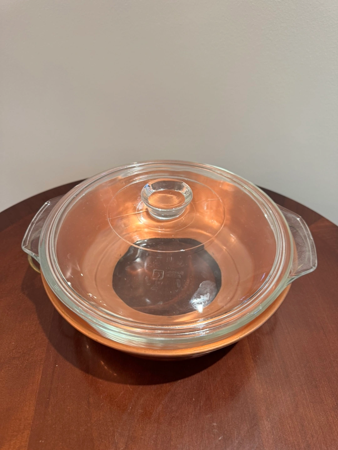 Copper coloured casserole dish with clear glass lid. Features two small handles on the sides. Glass lid fits snugly. Great for serving or cooking. Pick up in Woodbridge Islington and Rutherford
