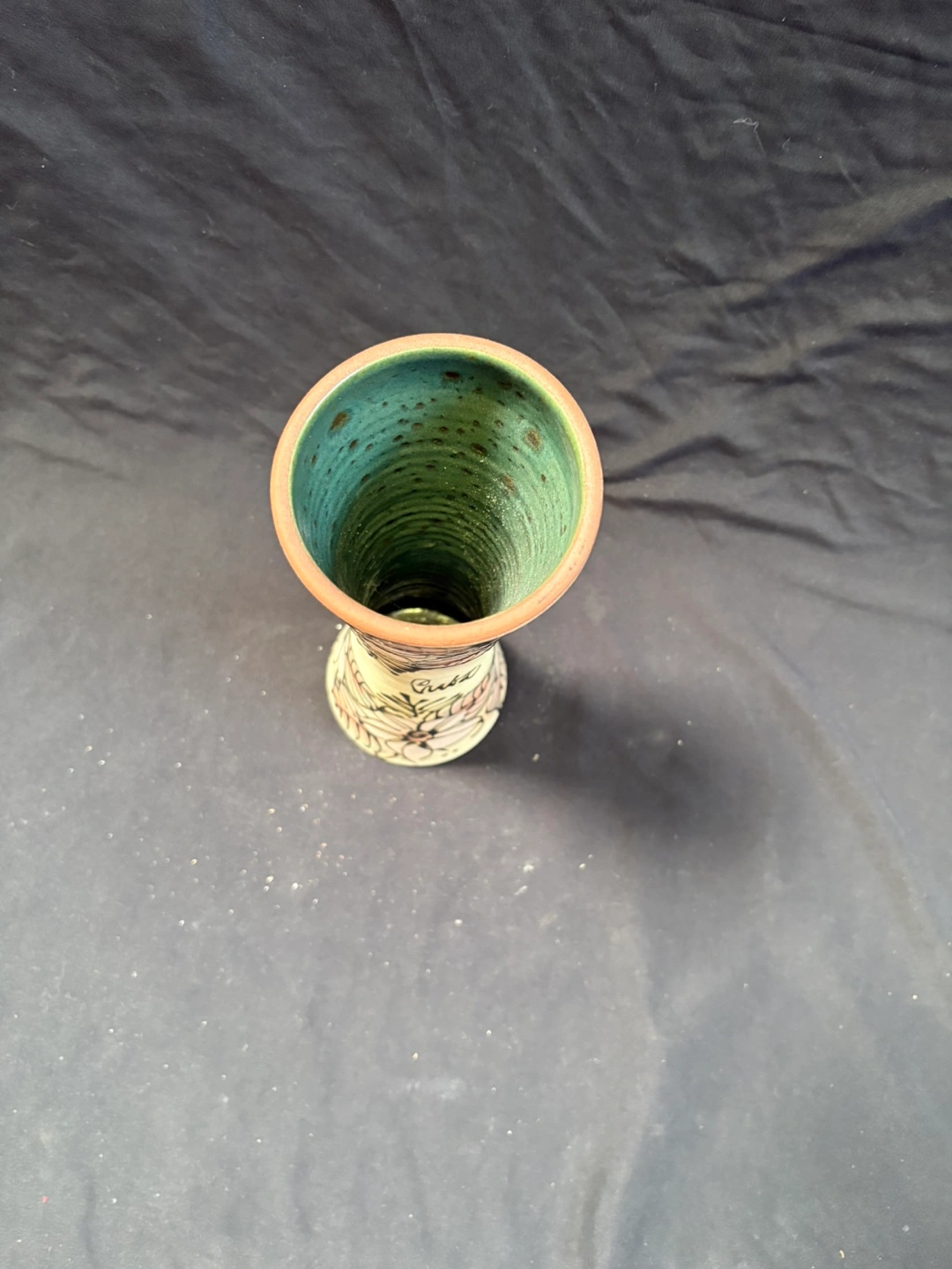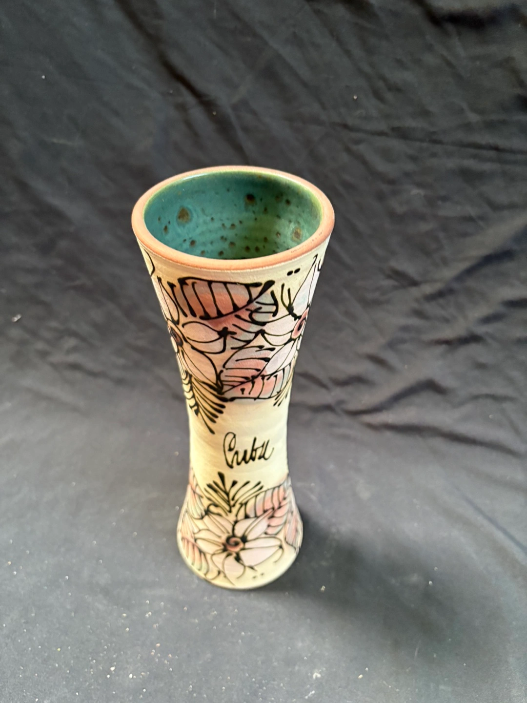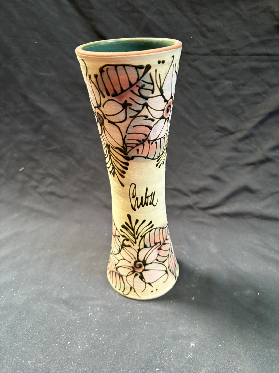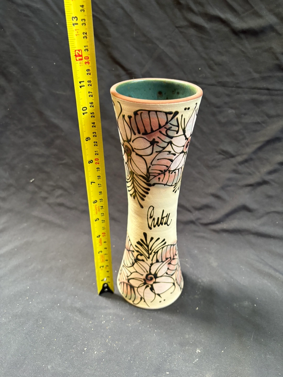Like new Unique, hand-painted ceramic vase. Features a floral design. Hourglass shape. Green-glazed interior. Approximately 12 inches tall. $1 Pick up Victoria Park & O’Connor area
