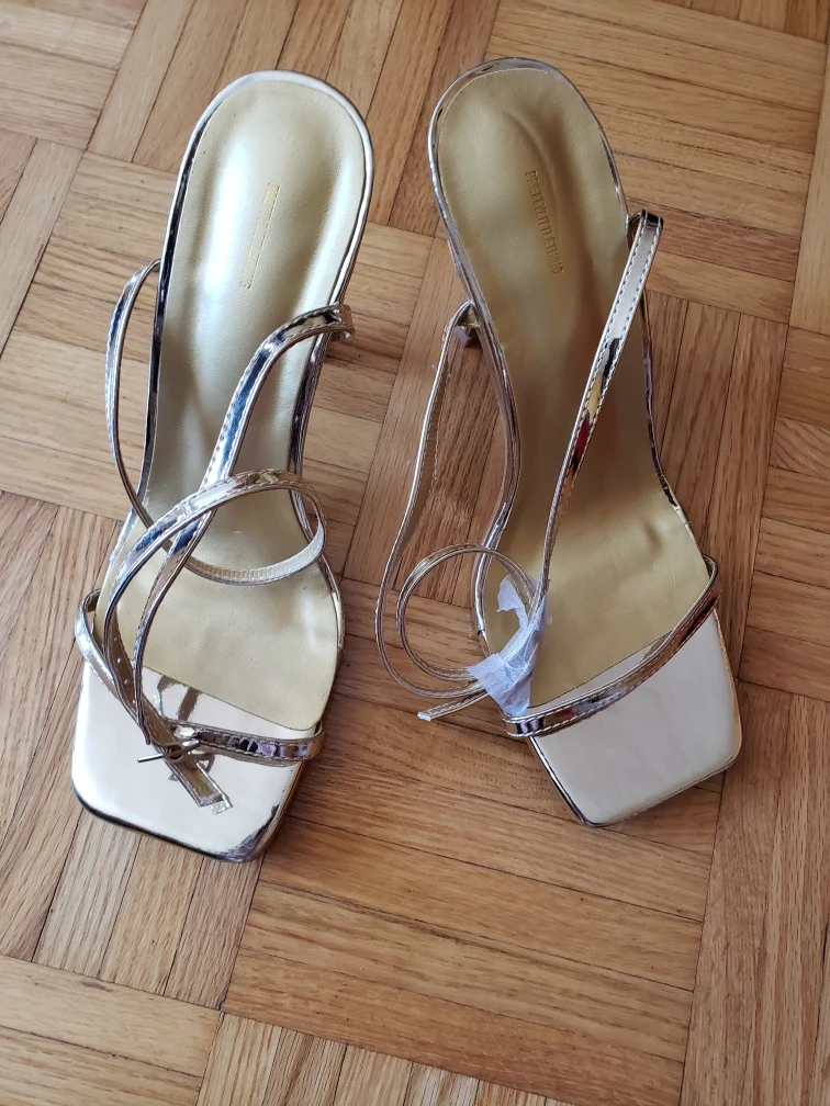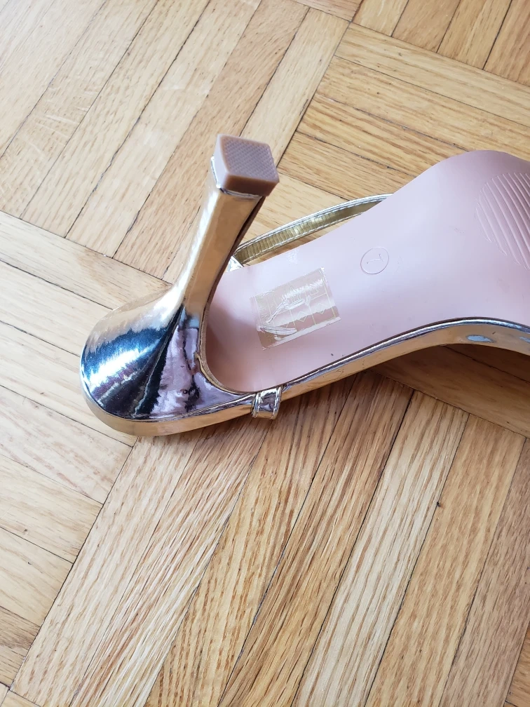US make beautiful gold metallic heels. Ankle strap wraps around. Square toe. Low heel. Size 7.