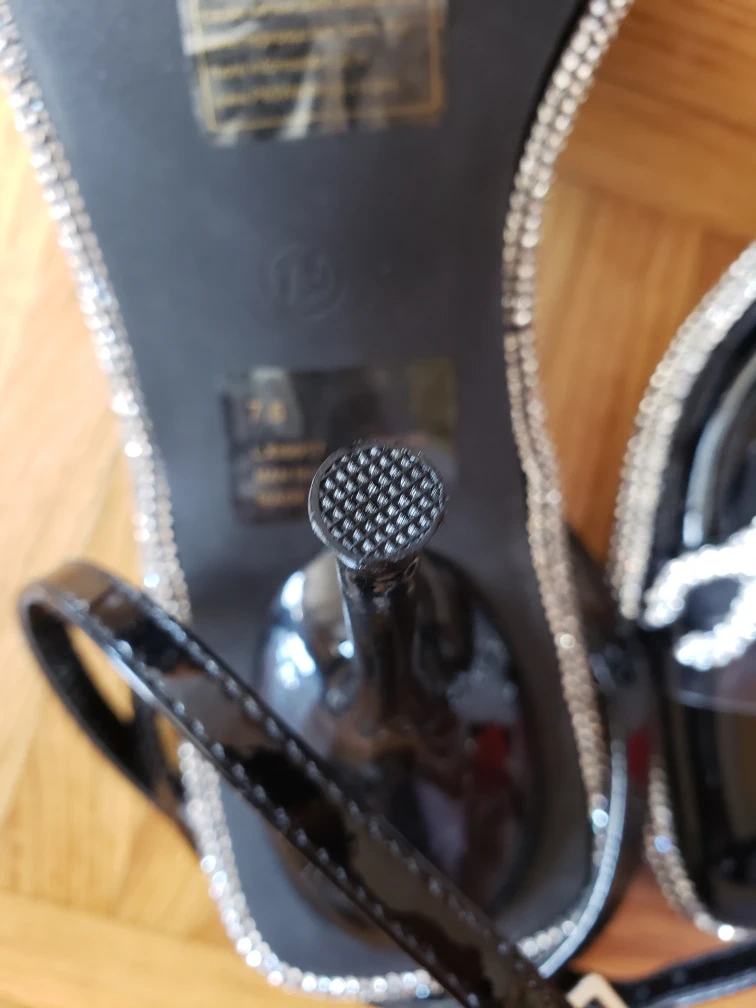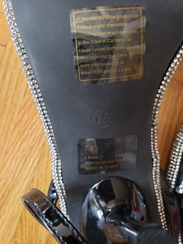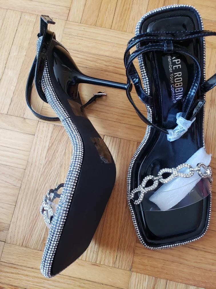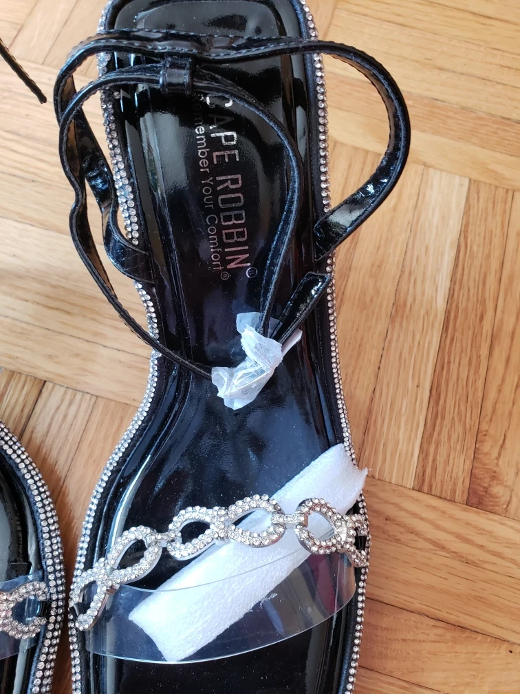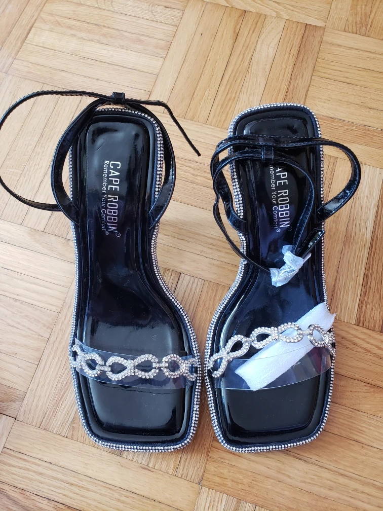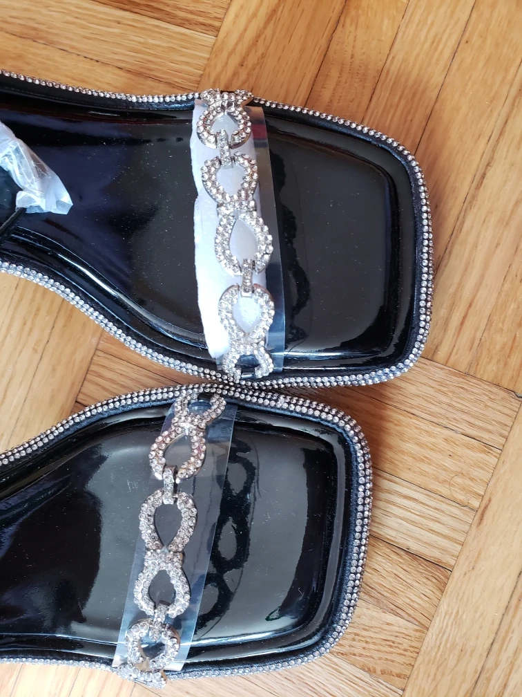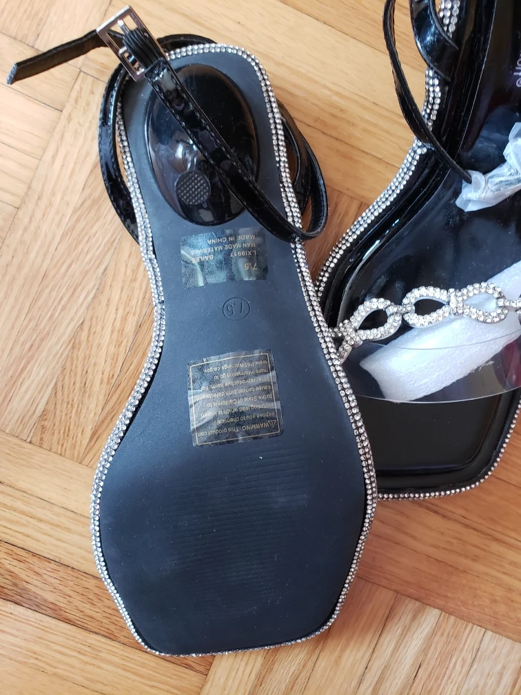 Black, rhinestone-embellished sandals. Clear and black straps. Size 7.5. Made in China.
